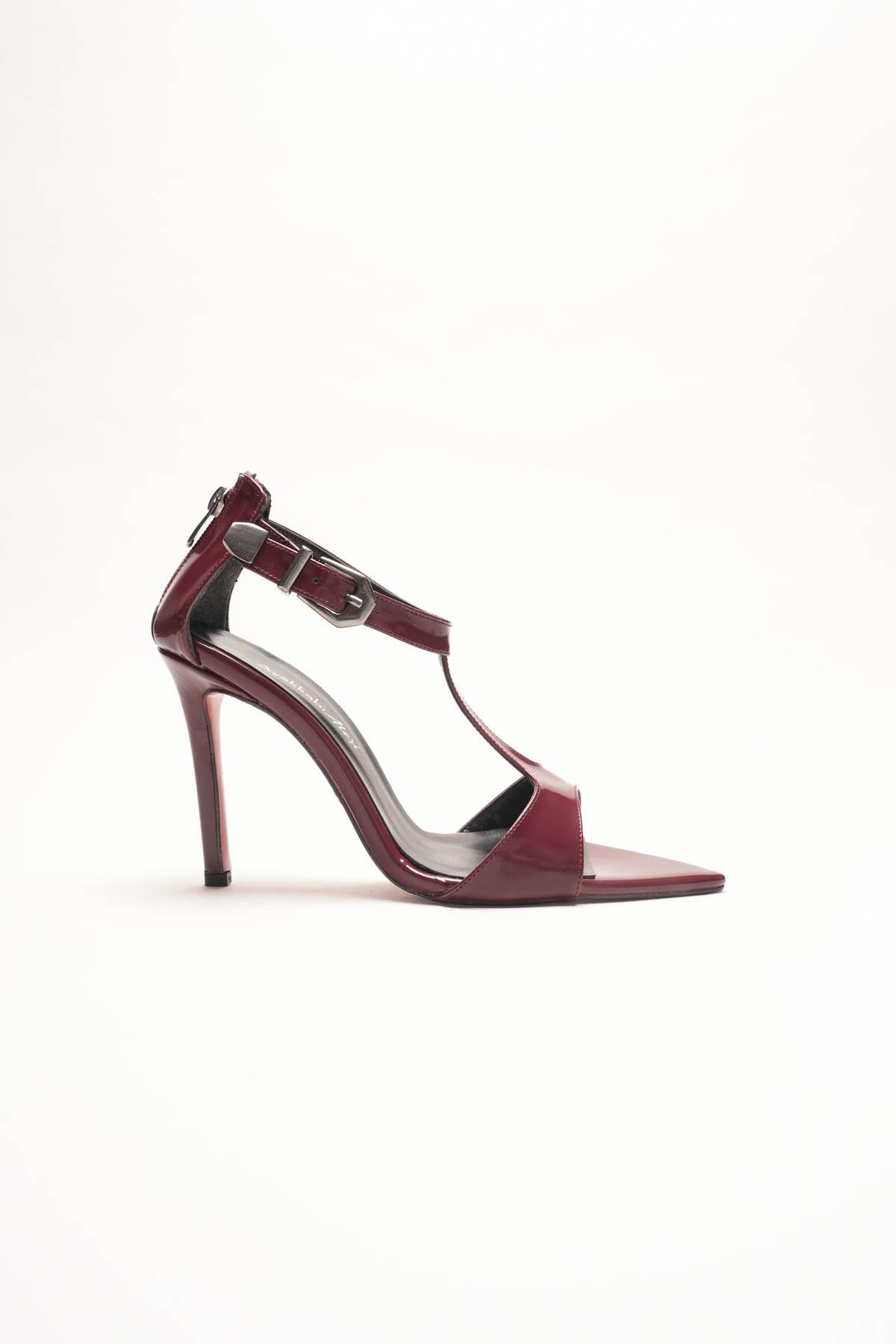 Bordo rugan T-bantlı stiletto, sivri burun tasarımı ve ince topuk yapısıyla sezonun en iddialı parçalarından biri. Kırmızı taban detayı ile lüks bir dokunuş katarını kombinleyin.