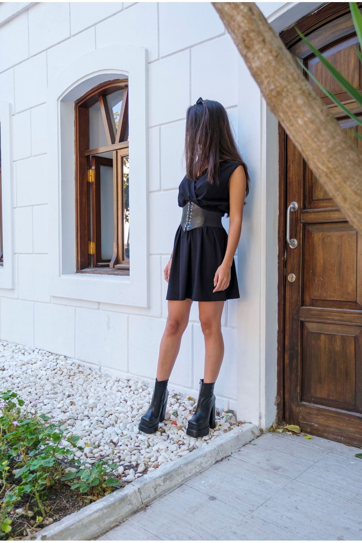 Vega Suni Deri Kare Burun Çift Platform Kalın Topuklu Kadın Bot Siyah Cilt
