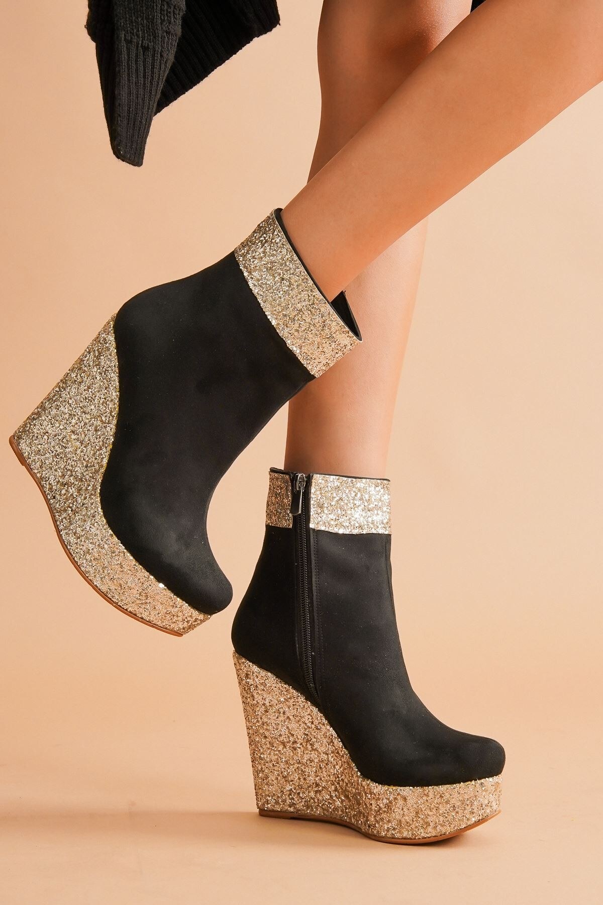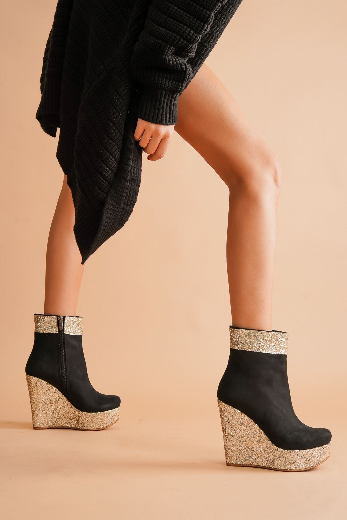 Kadın Dolgu Topuk Fermuarlı Bot Daina Gold;siyah
