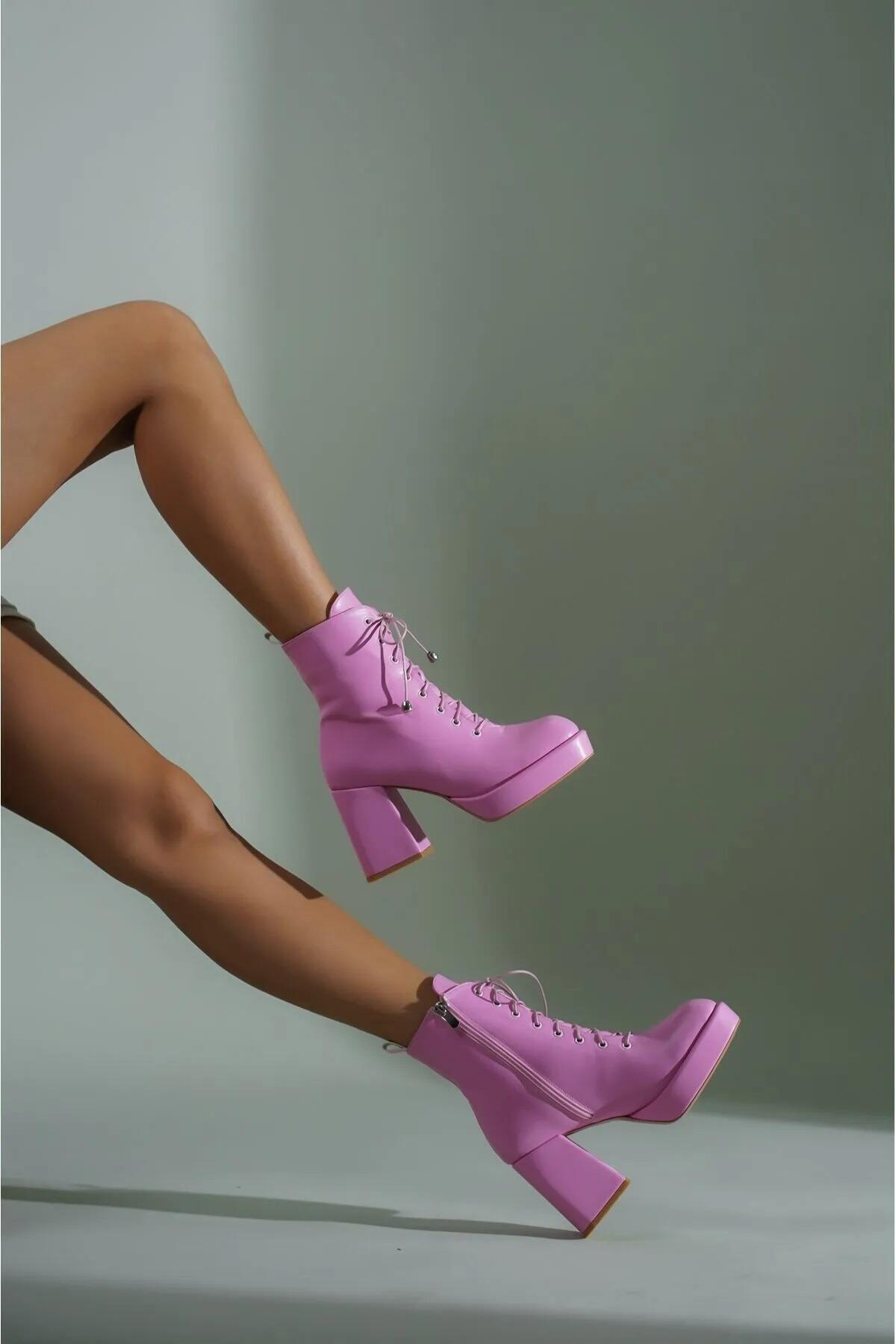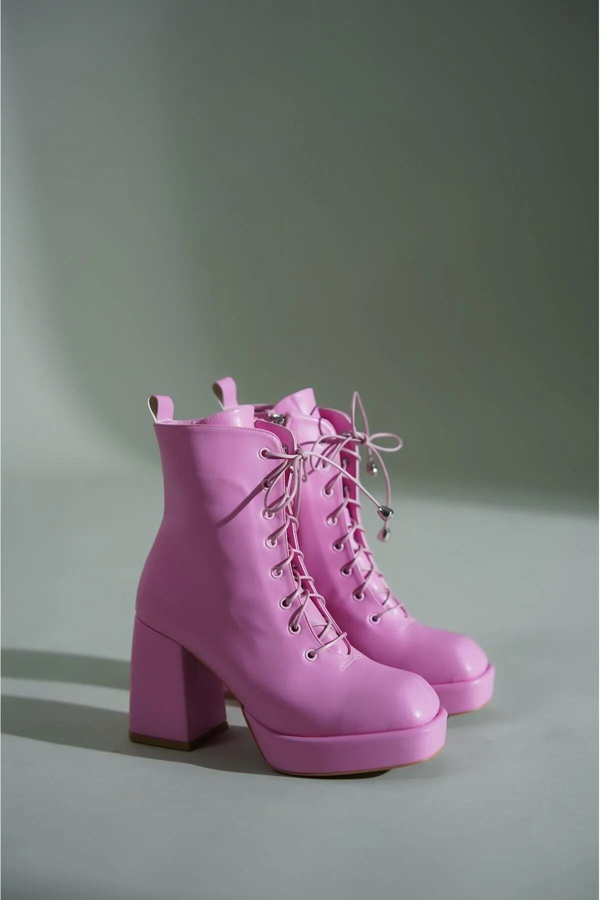 Kadın Platform Topuklu Bağcıklı Bot Ribel Pembe Cilt