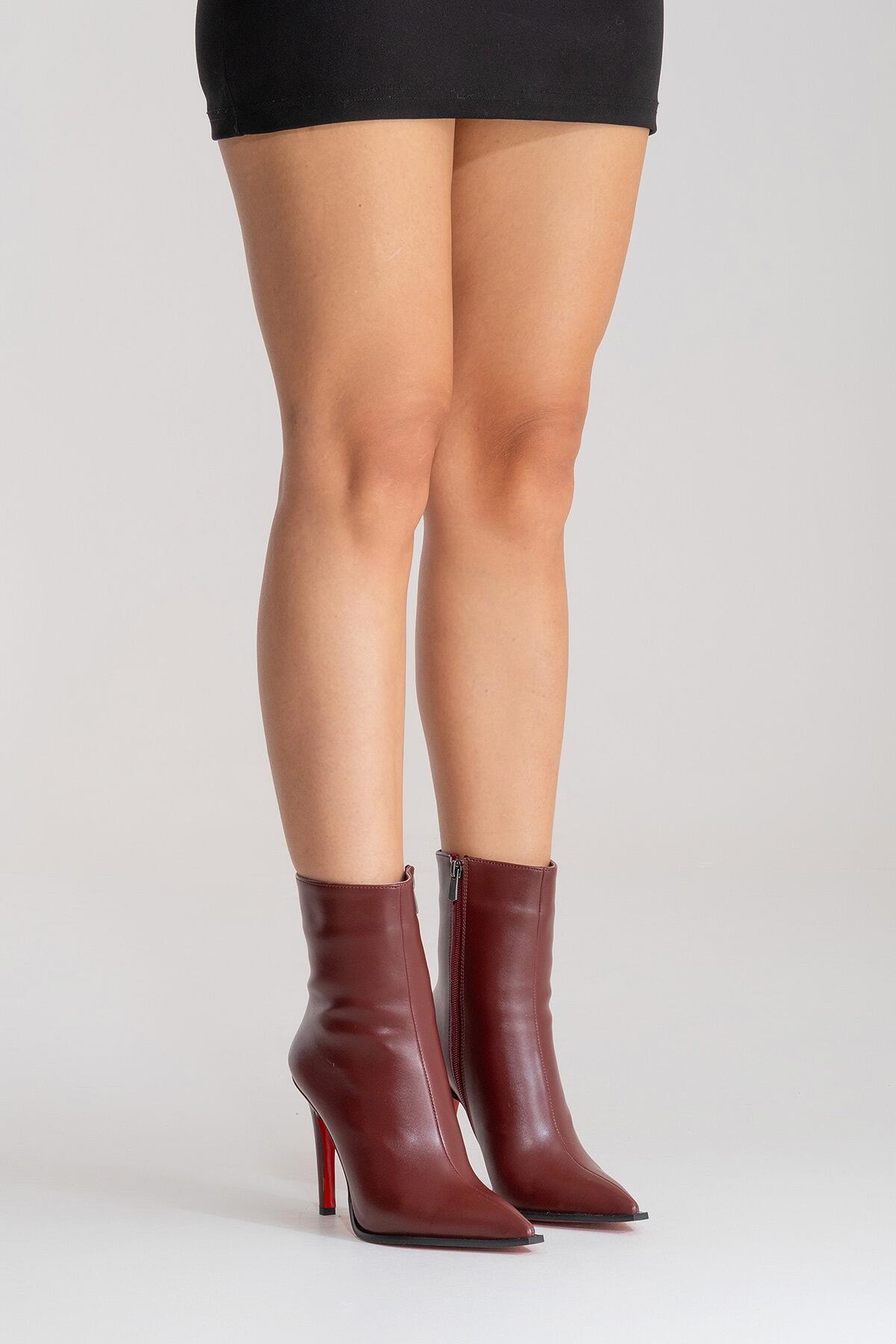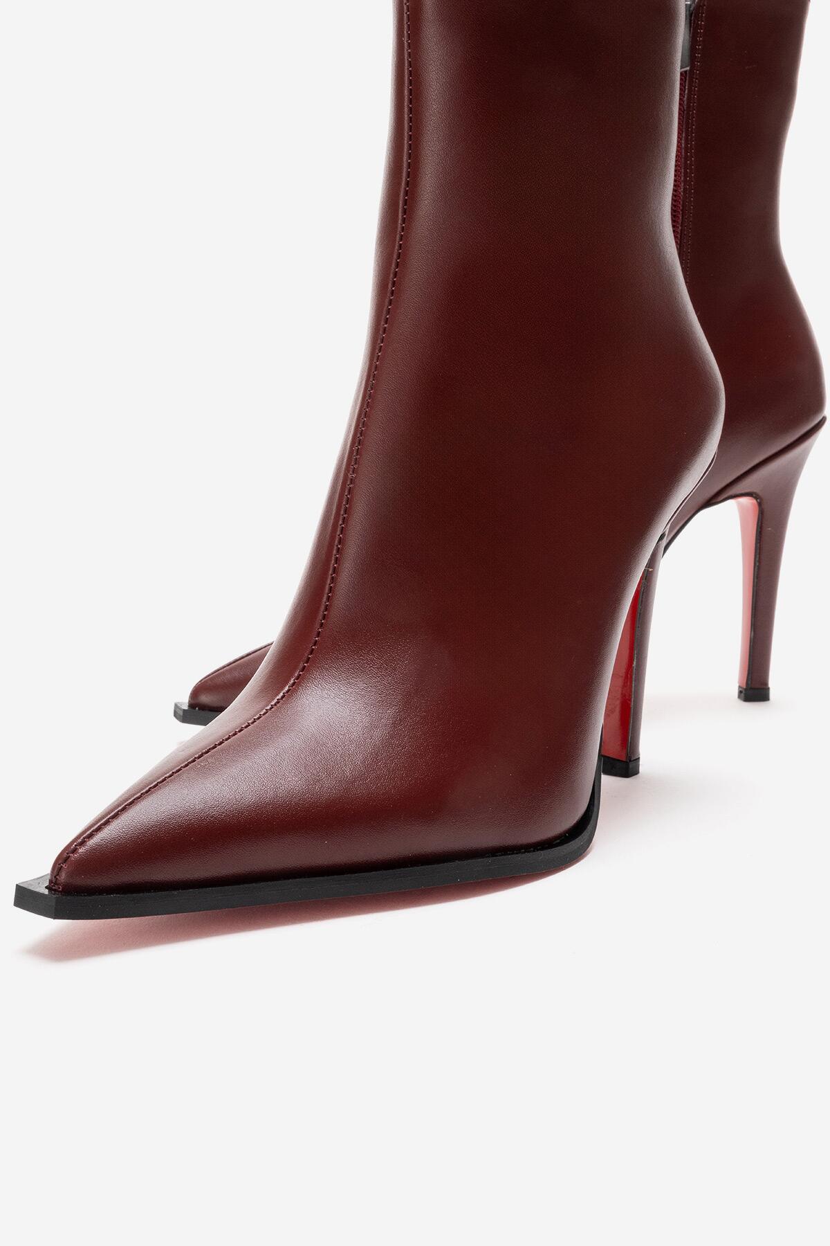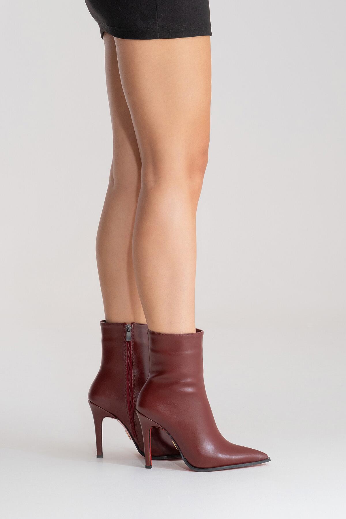 Kadın Tasarım Taban Bilek Boy İnce Topuklu Bot Yanni Bordo Cilt
