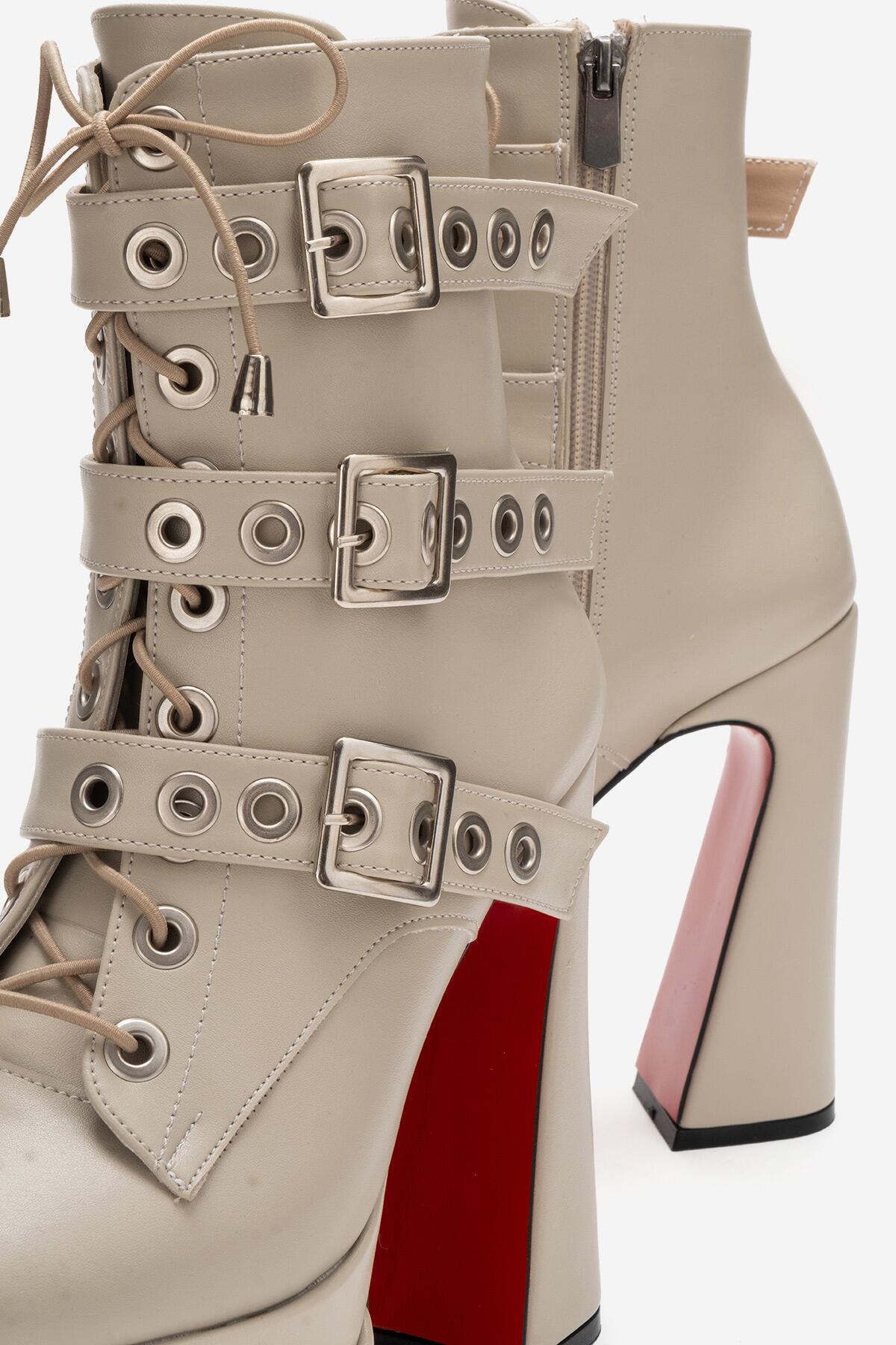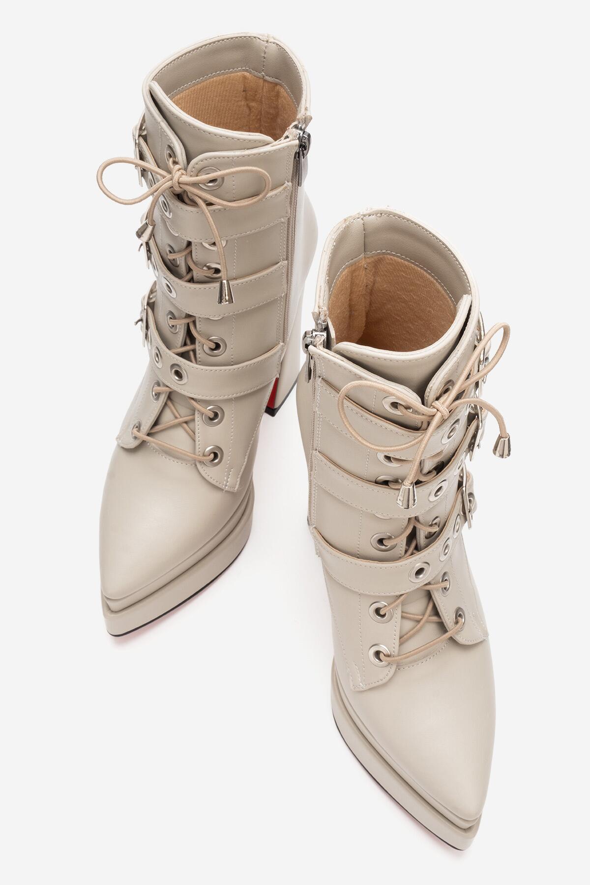 Kadın Üç Tokalı Sivri Burun Yüksek Topuklu Fermuarlı Bot Rugani Bej