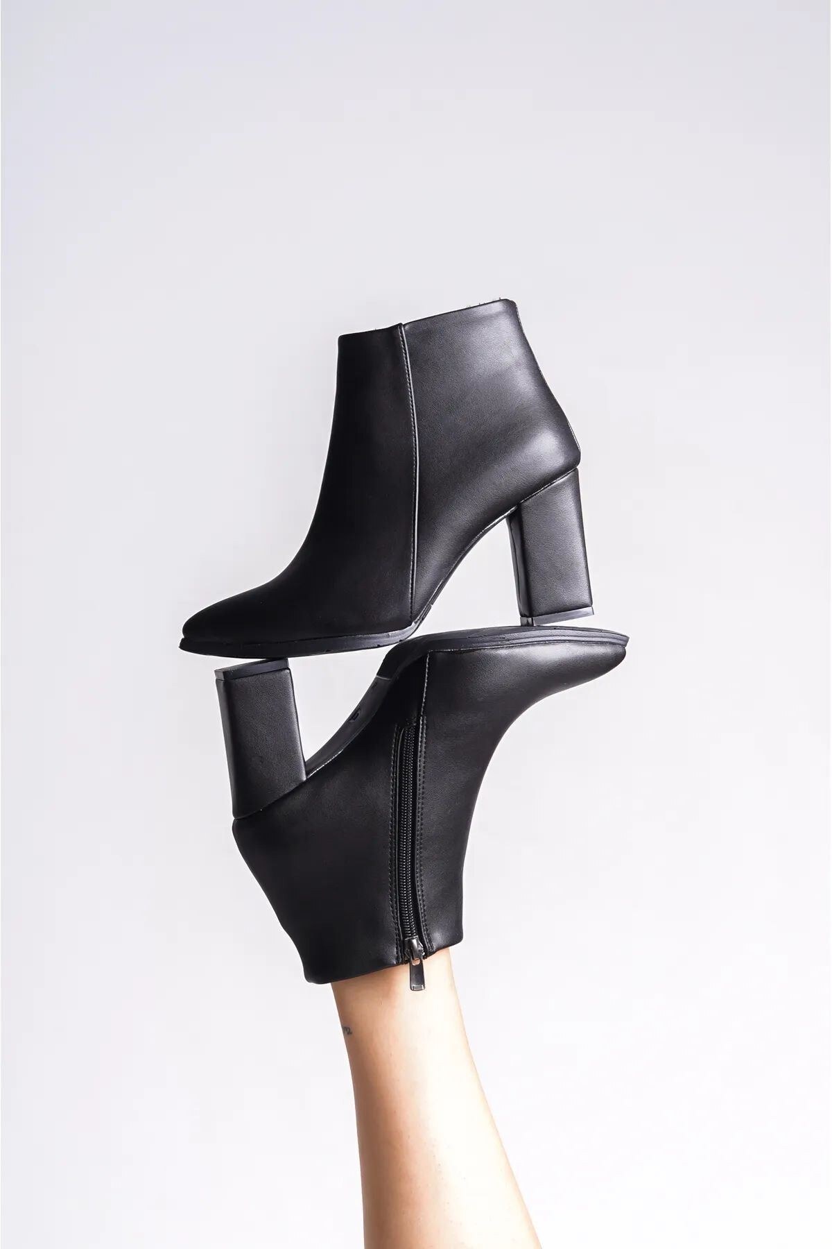 Siyah Siyah Cilt Kısa Topuklu Sivri Burun Kadın Bot Siyah
