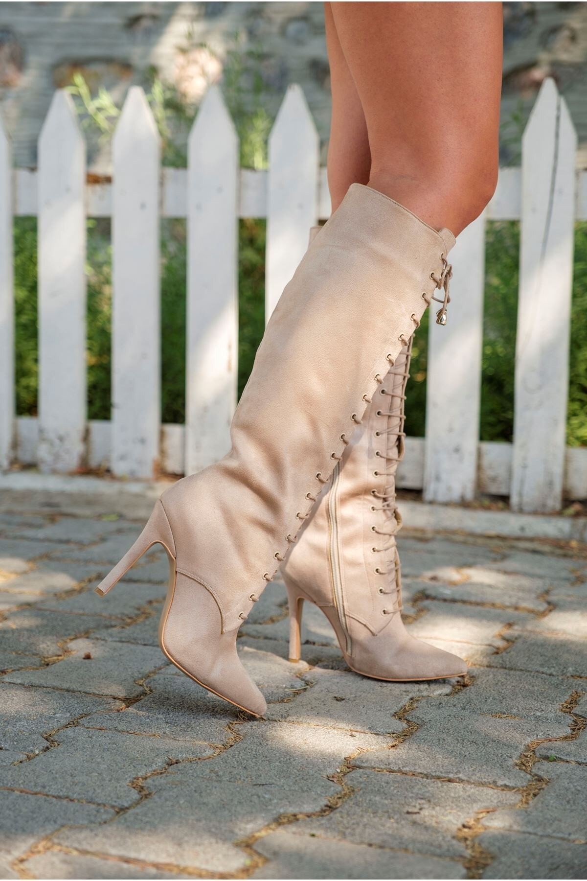 Kadın Bağcıklı Diz Altı Çizme Spike Ten Süet
