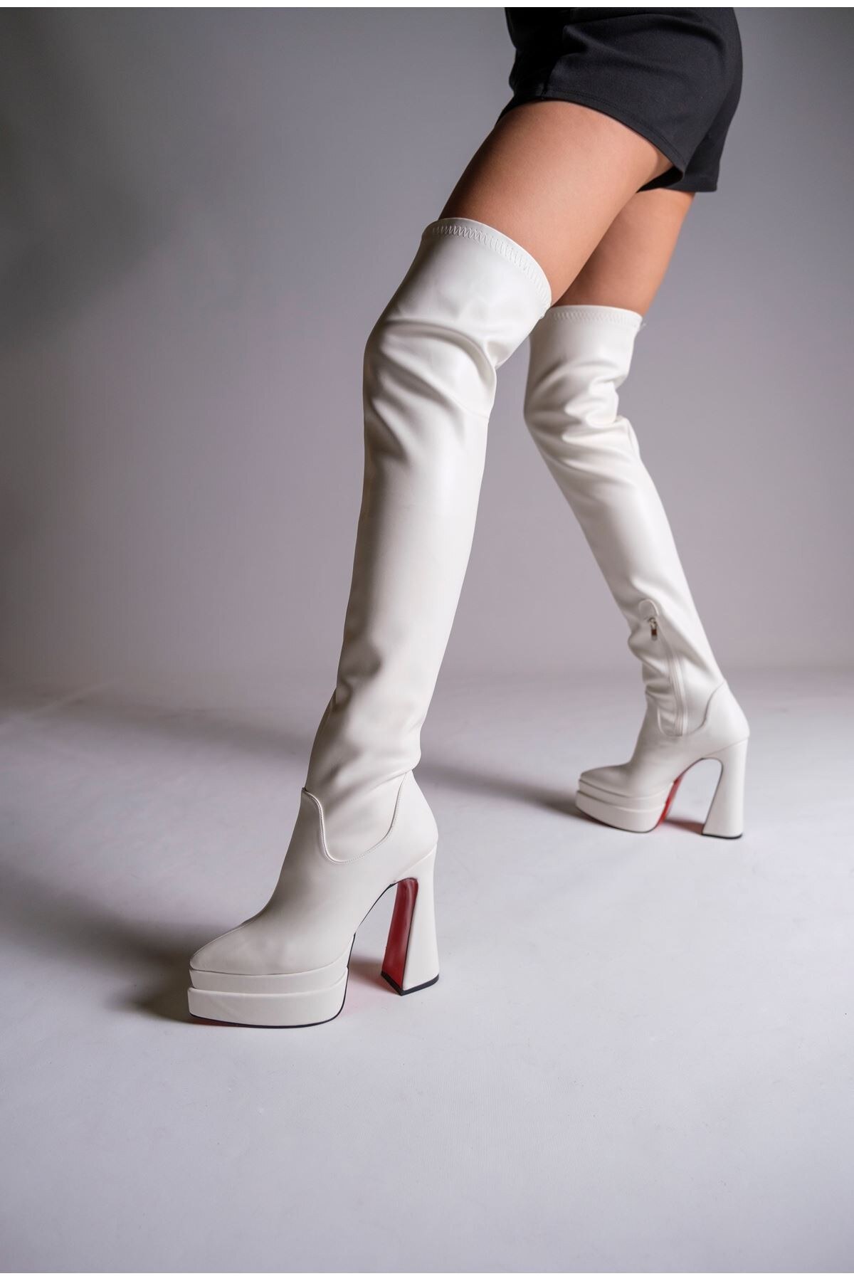 Kadın Çift Platform Yüksek Topuklu Diz Üstü Çizme Brewery Beyaz Cilt