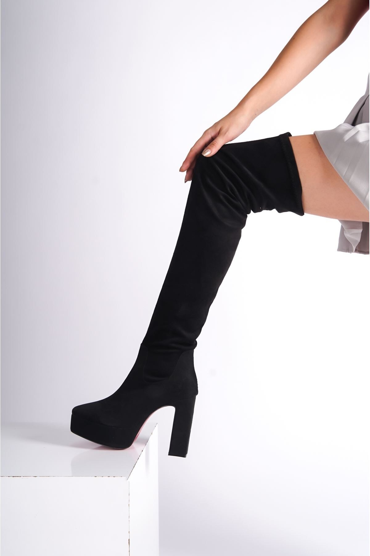 Kadın Kalın Topuk Diz Üstü Streç Çizme Valencia Siyah Süet