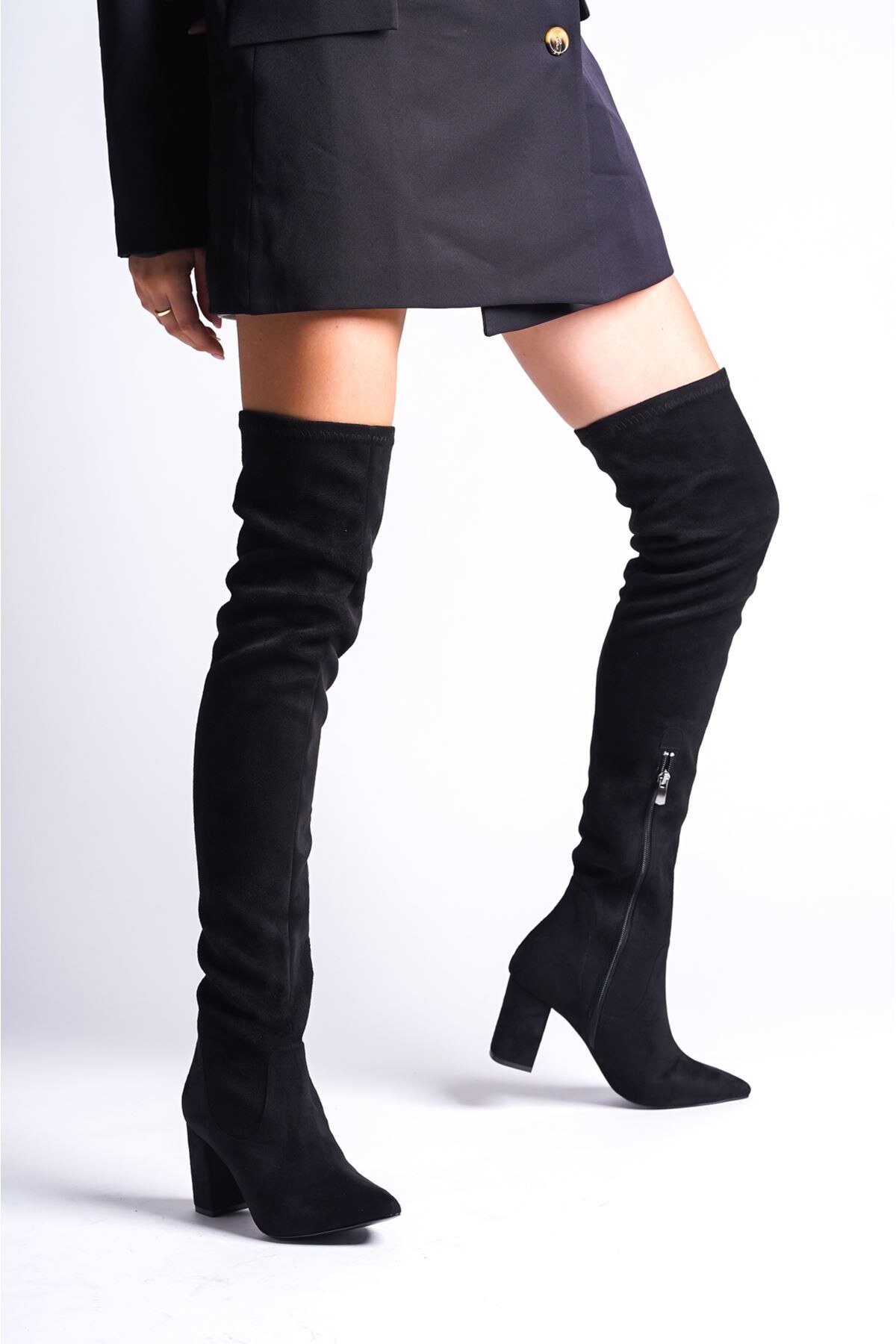 Kadın Kısa Topuk Sivri Burun Diz Üstü Çizme Firefly Siyah Süet