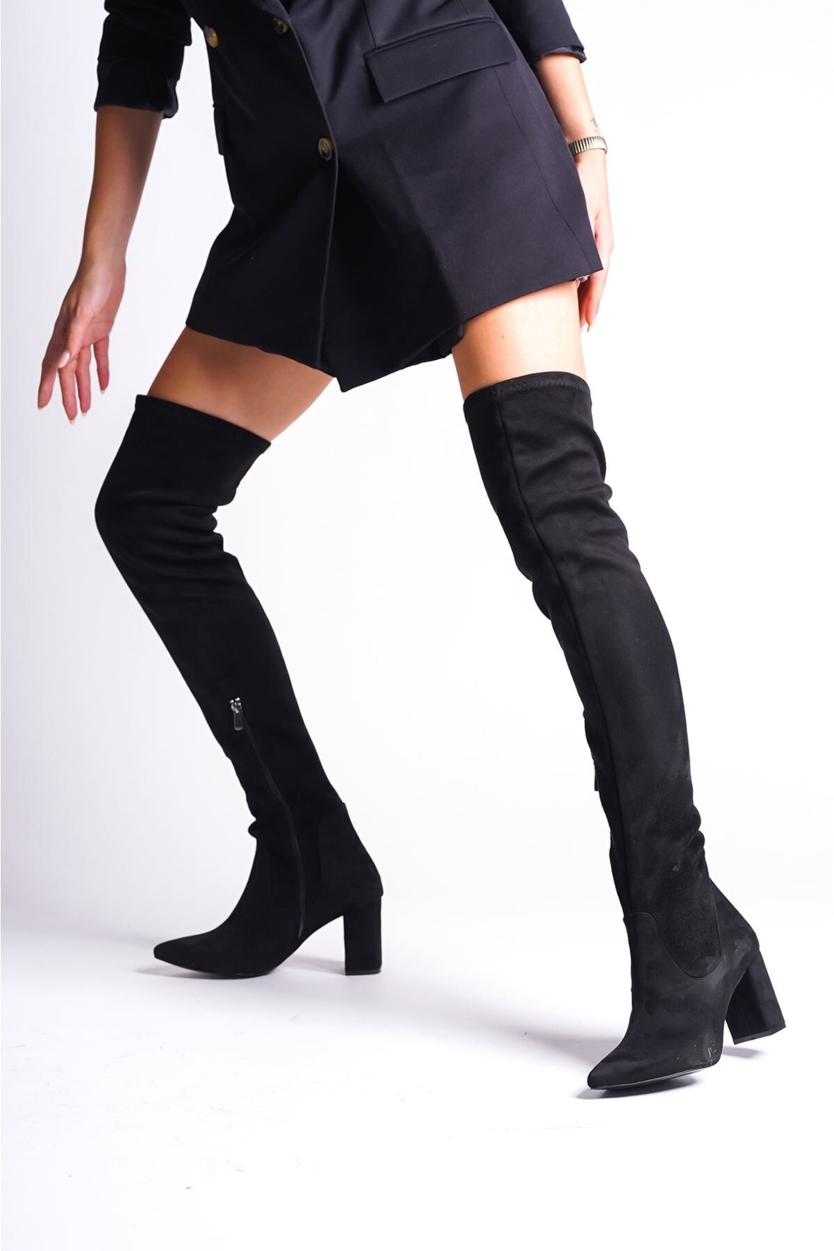Kadın Kısa Topuk Sivri Burun Diz Üstü Çizme Firefly Siyah Süet