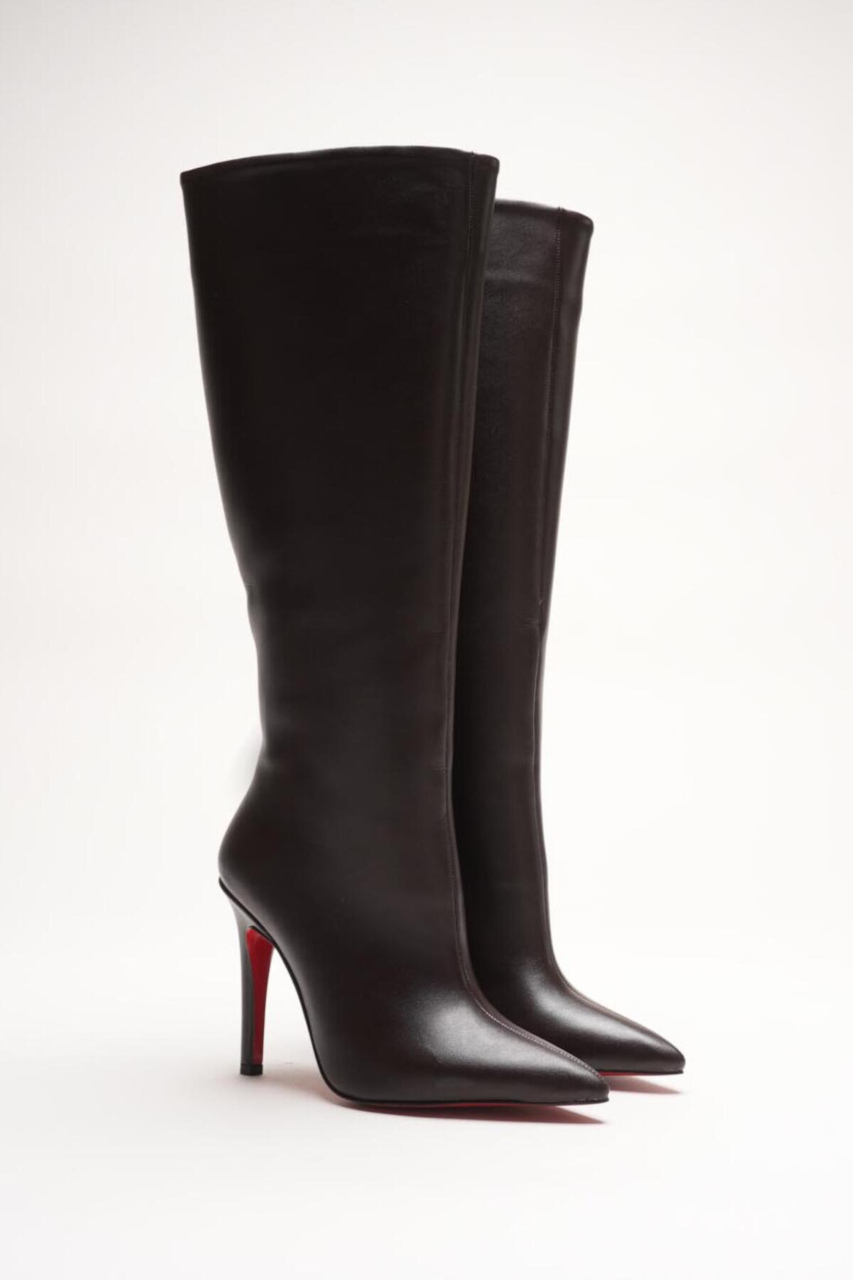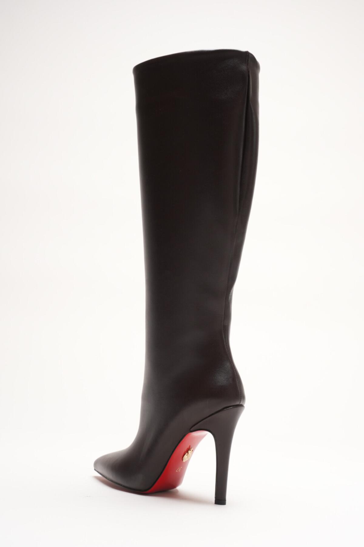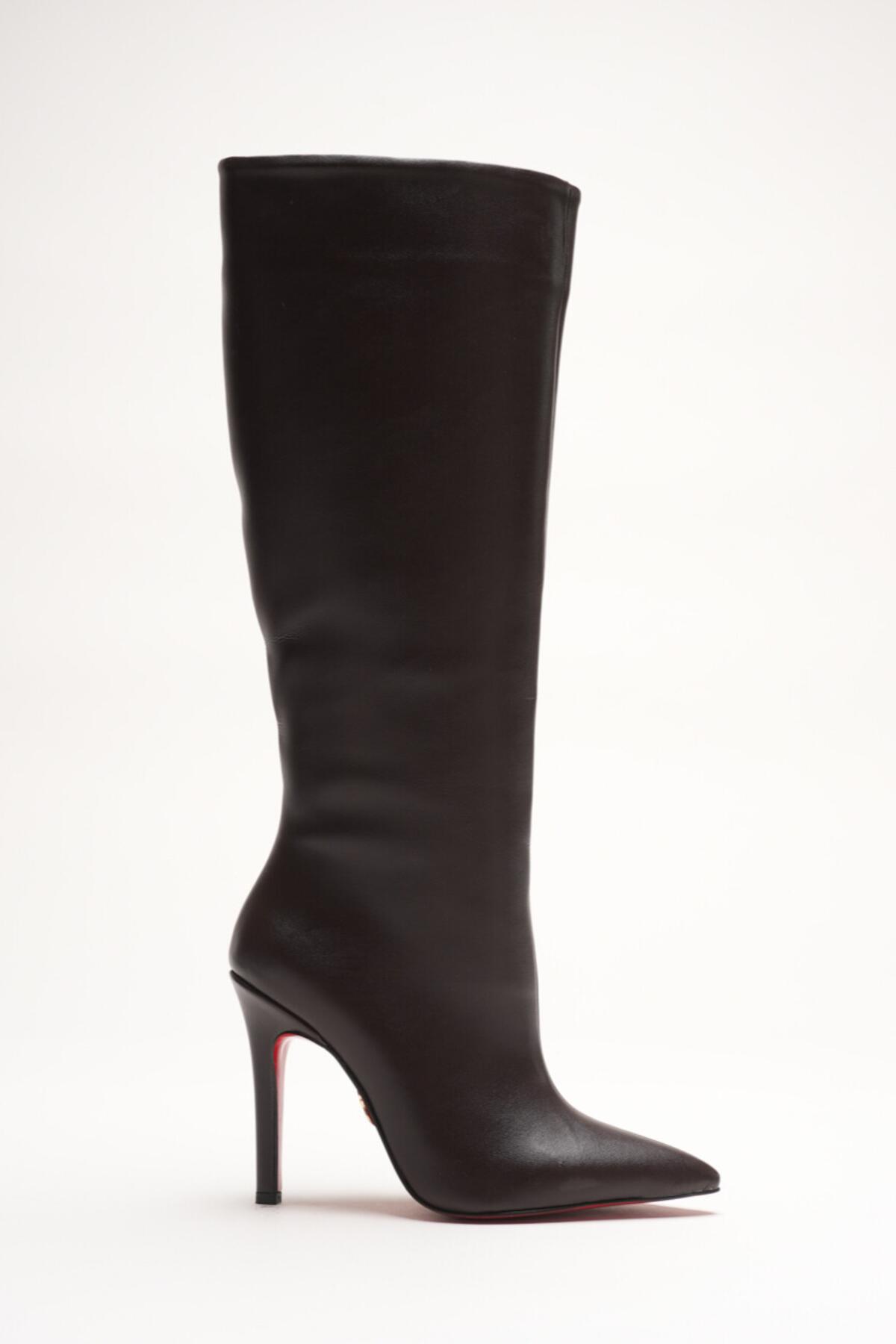 Kadın Sivri Burun Fermuarsız İnce Topuklu Diz Altı Çizme Monias Kahverengi Cilt