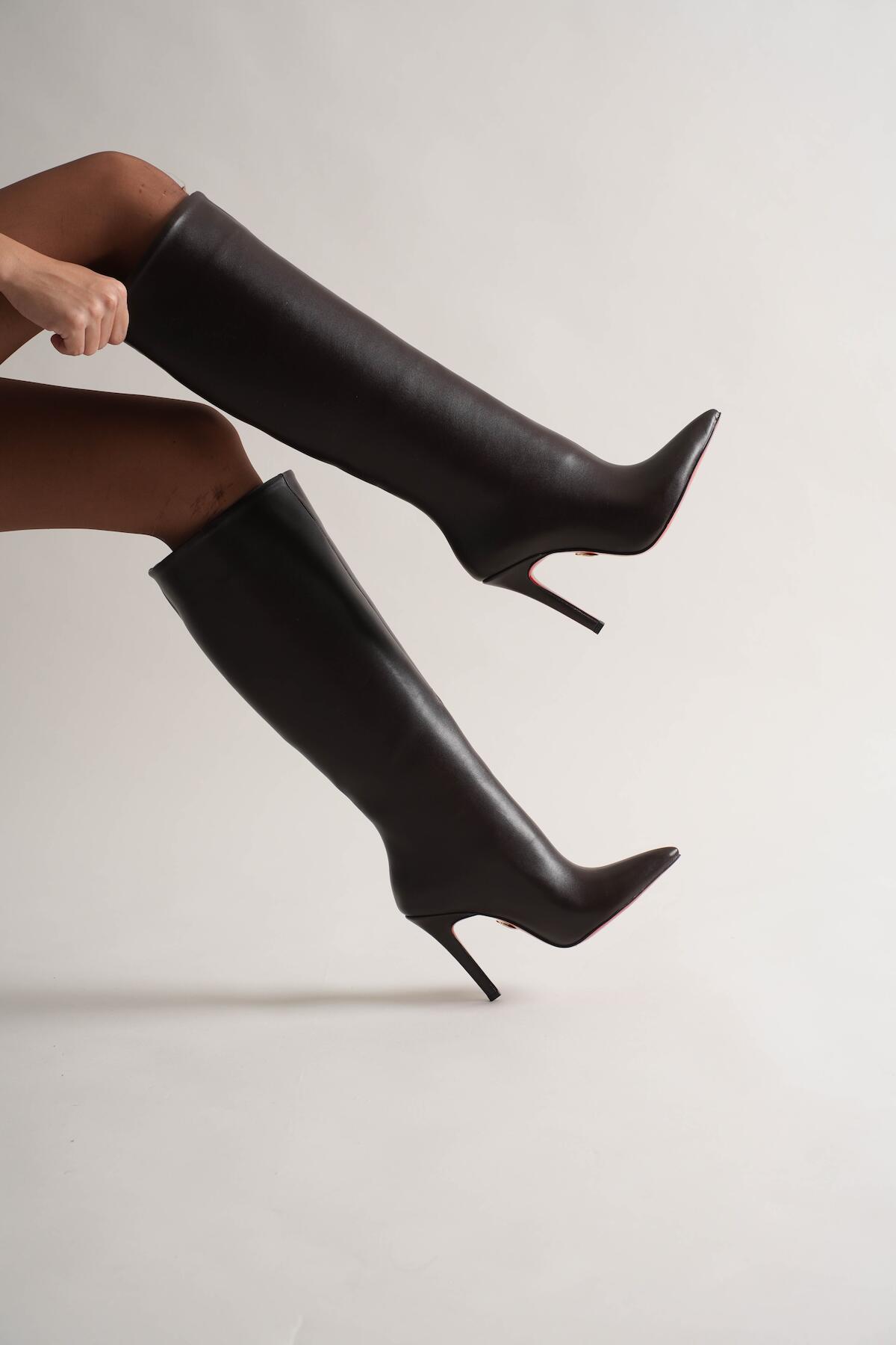 Kadın Sivri Burun Fermuarsız İnce Topuklu Diz Altı Çizme Monias Kahverengi Cilt