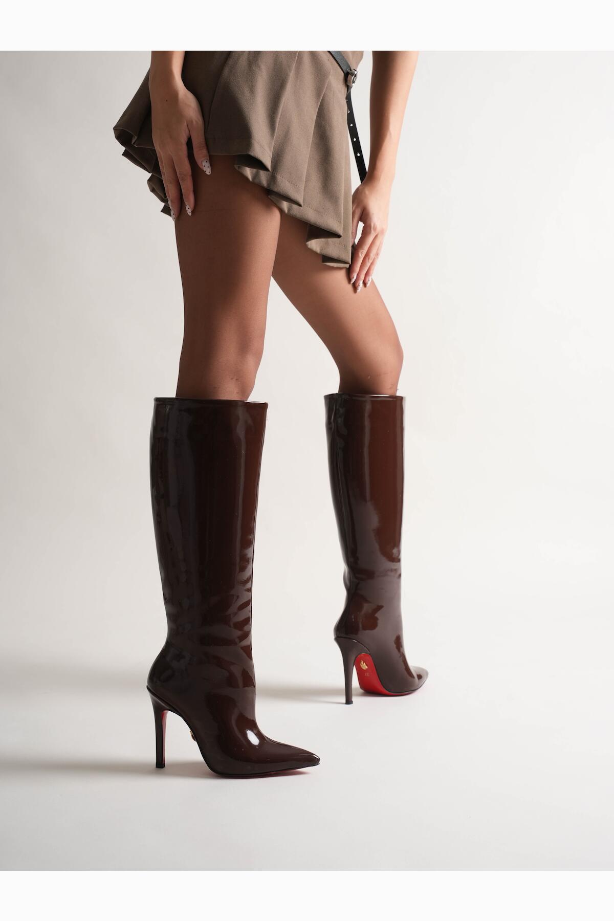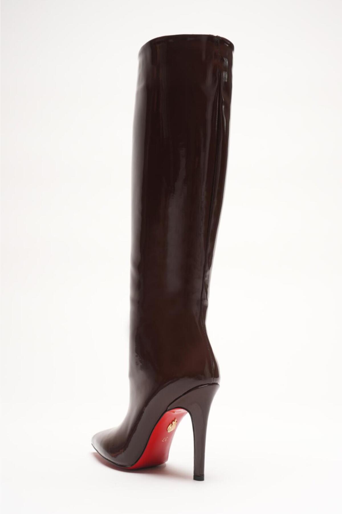 Kadın Sivri Burun Fermuarsız İnce Topuklu Diz Altı Çizme Monias Kahverengi Rugan