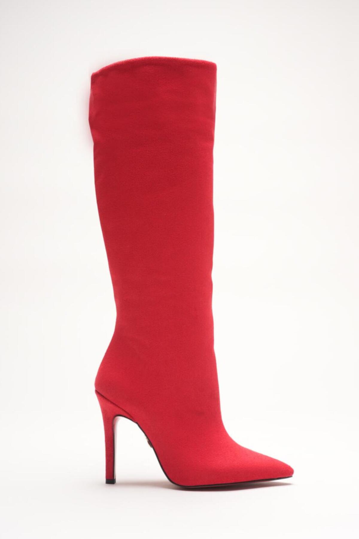 Kadın Sivri Burun Fermuarsız İnce Topuklu Diz Altı Çizme Monias Kırmızı Süet