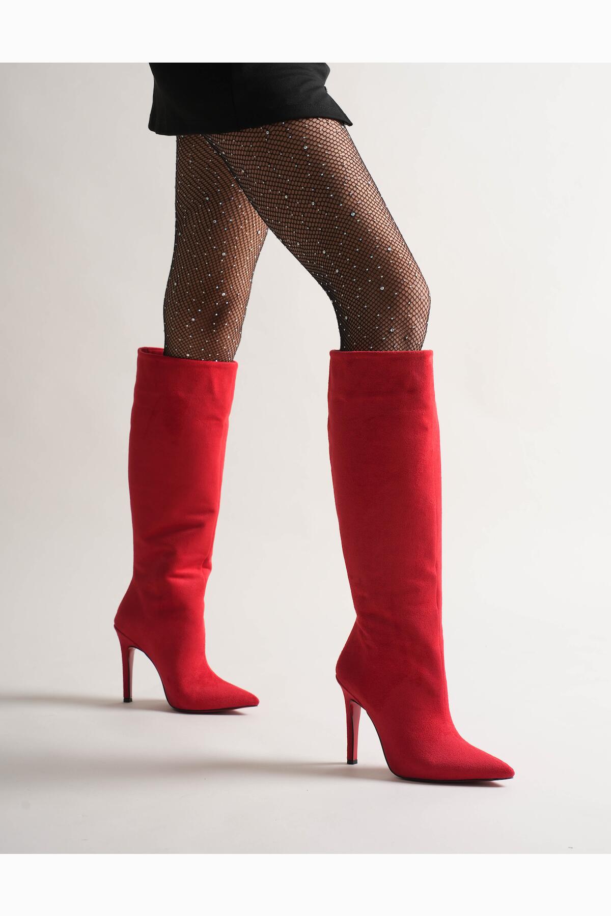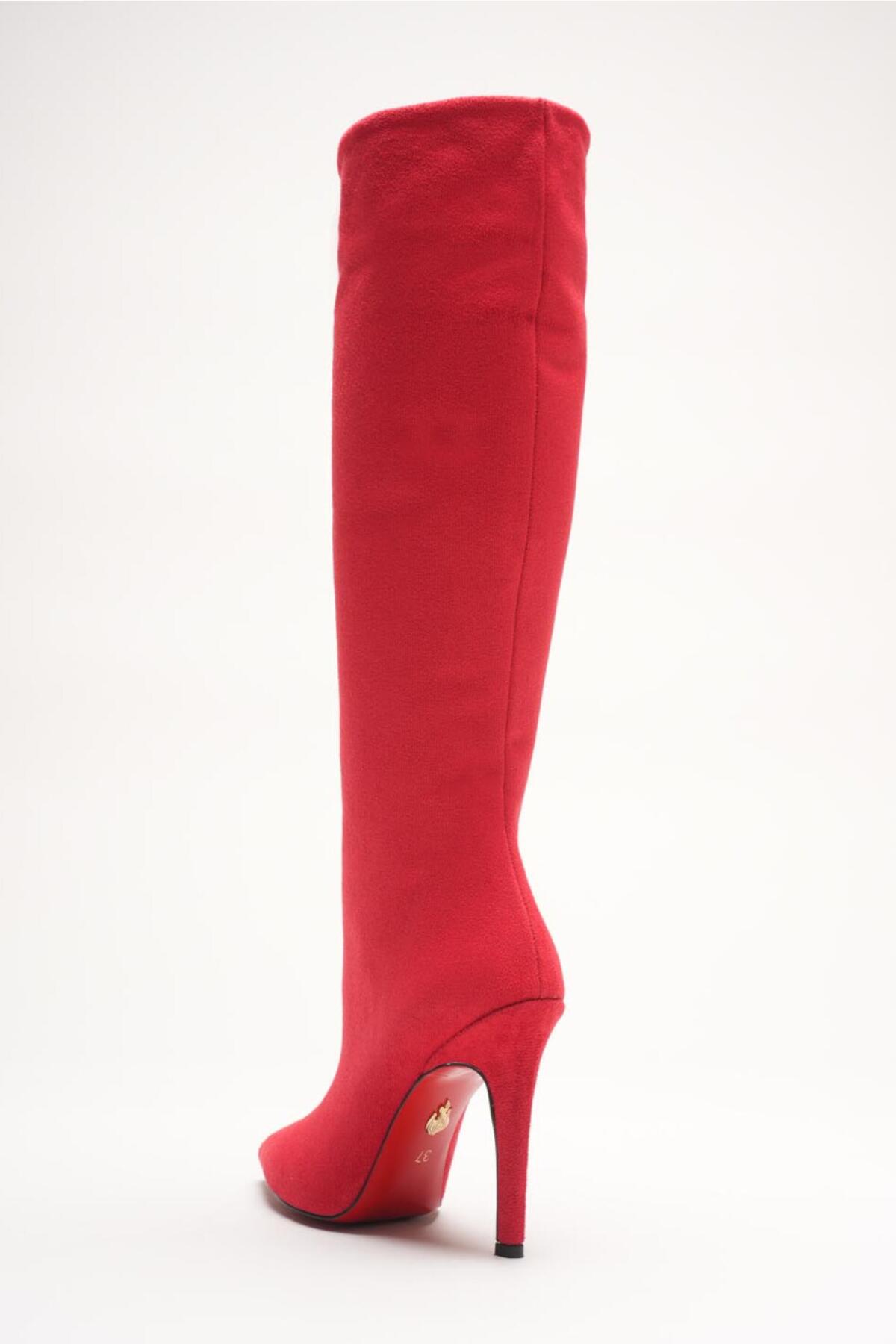 Kadın Sivri Burun Fermuarsız İnce Topuklu Diz Altı Çizme Monias Kırmızı Süet