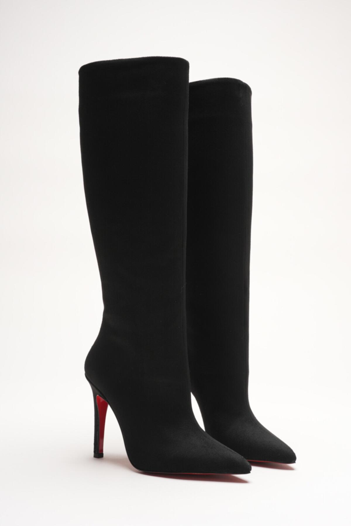 Kadın Sivri Burun Fermuarsız İnce Topuklu Diz Altı Çizme Monias Siyah Süet