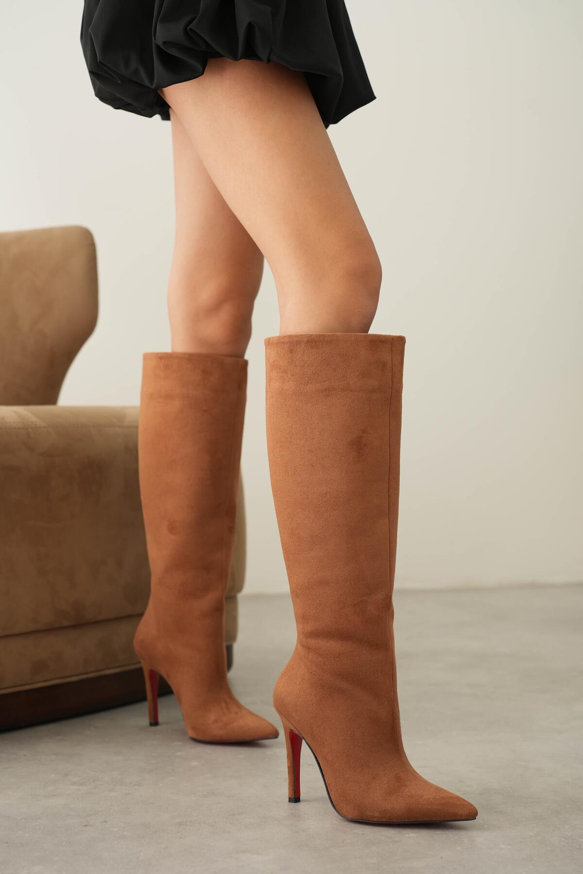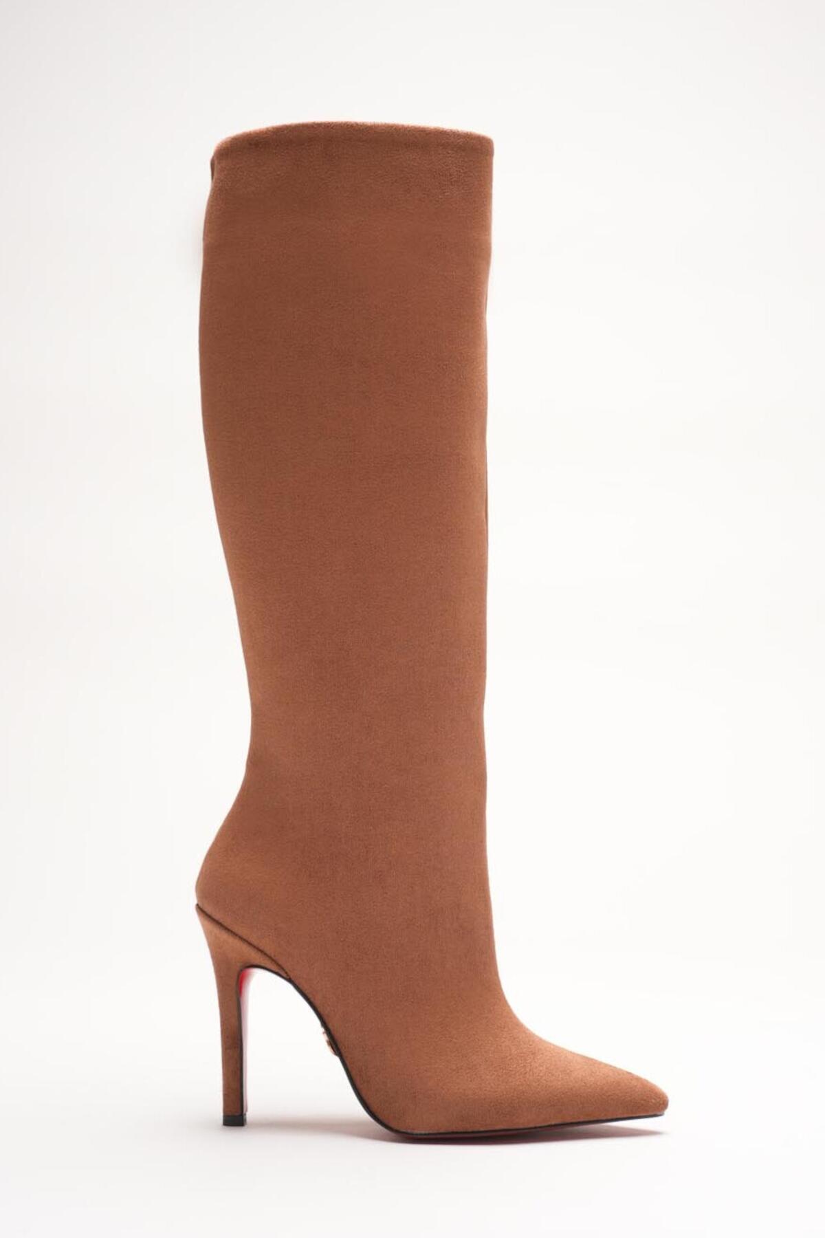 Kadın Sivri Burun Fermuarsız İnce Topuklu Diz Altı Çizme Monias Taba Süet