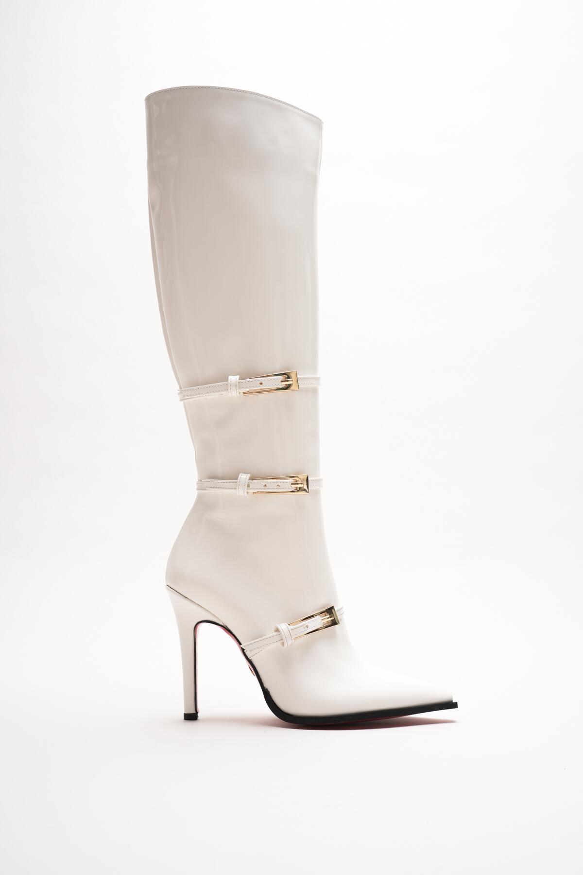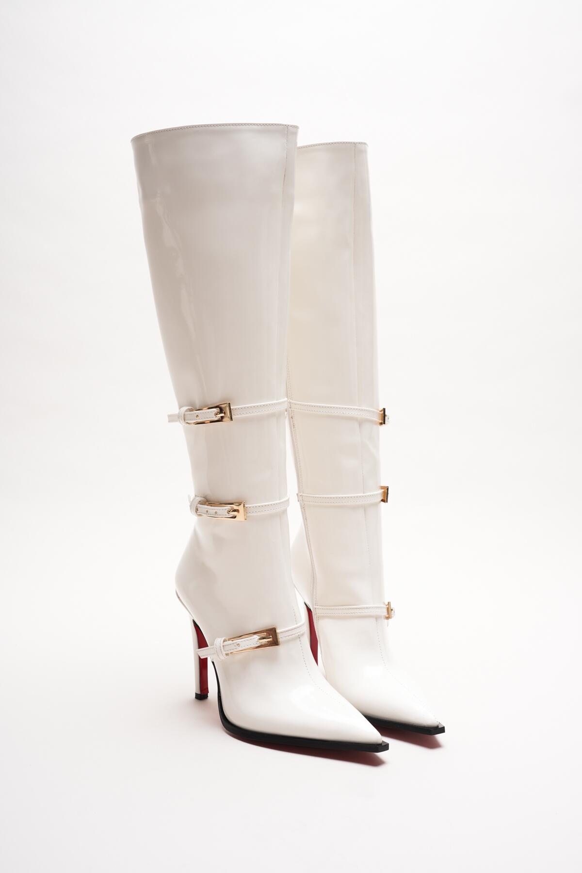 Kombinlerinize cesur bir dokunuş yapmaya hazır mısınız? Beyaz rugan derinin parlak asaletini, ikonik kırmızı taban detayıyla buluşturan bu özel tasarım çizme, stil sahibi kadınlar için üretildi.