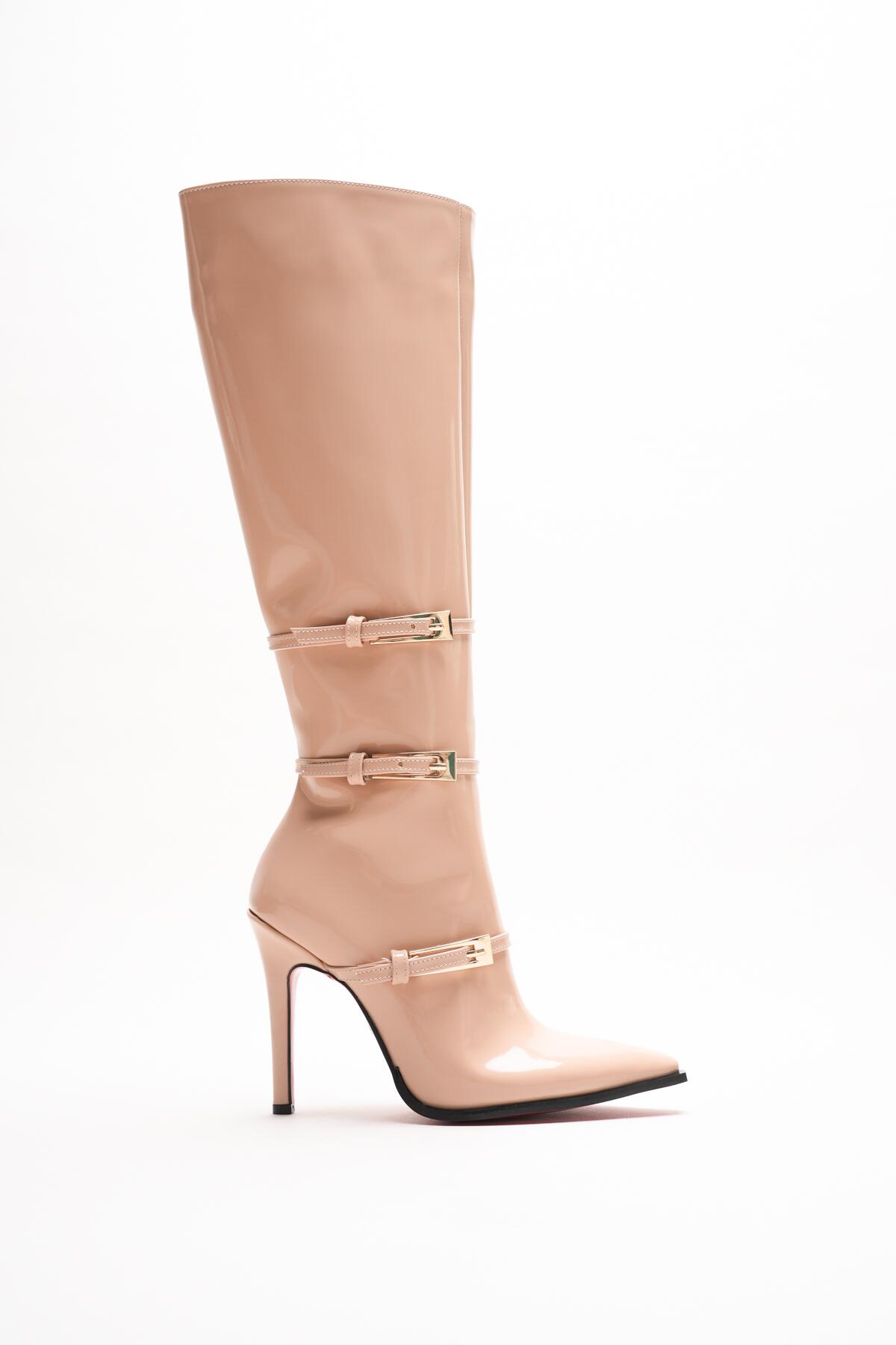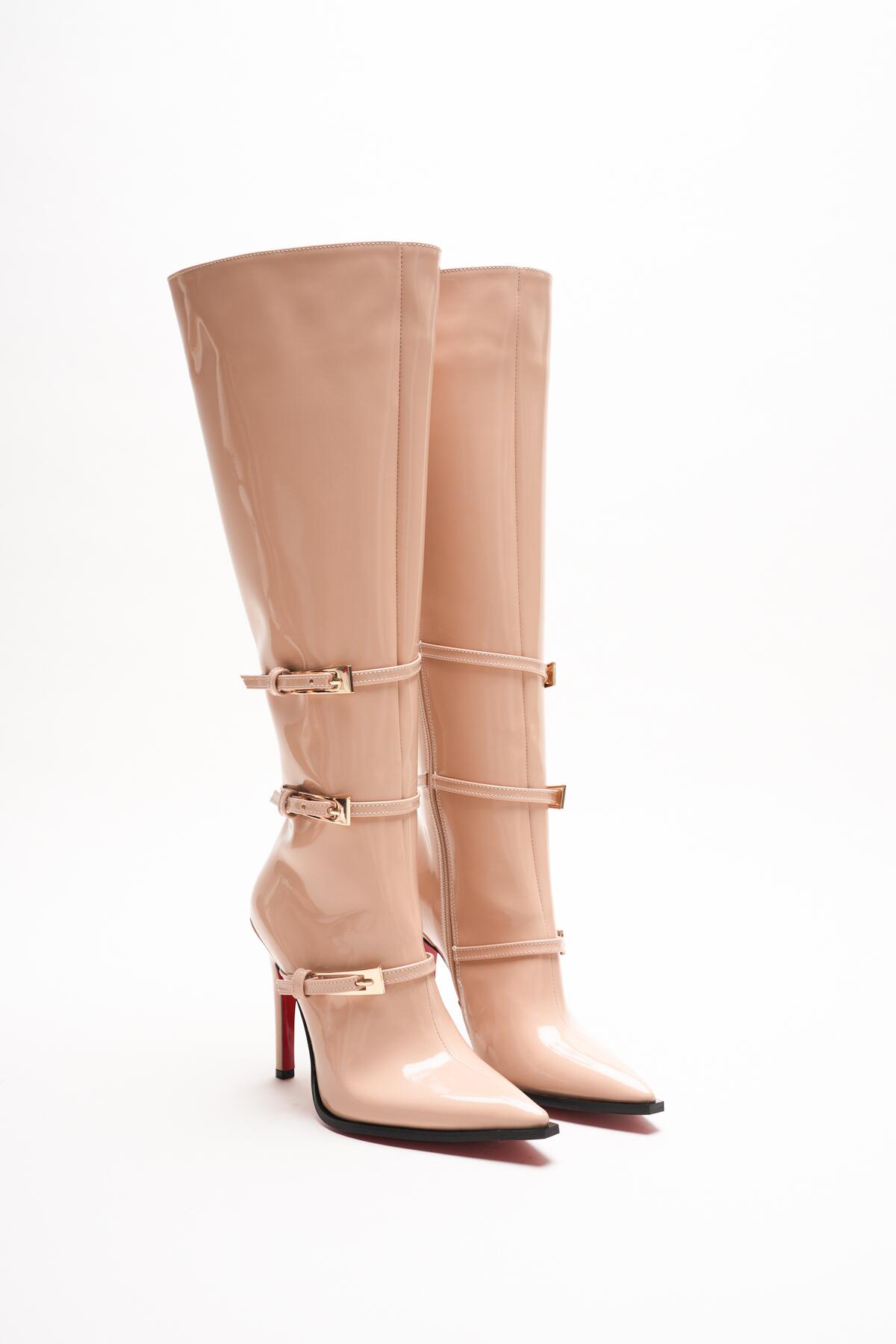 Kombinlerinize cesur bir dokunuş yapmaya hazır mısınız? Nude rugan derinin parlak asaletini, ikonik kırmızı taban detayıyla buluşturan bu özel tasarım çizme, stil sahibi kadınlar için üretildi.