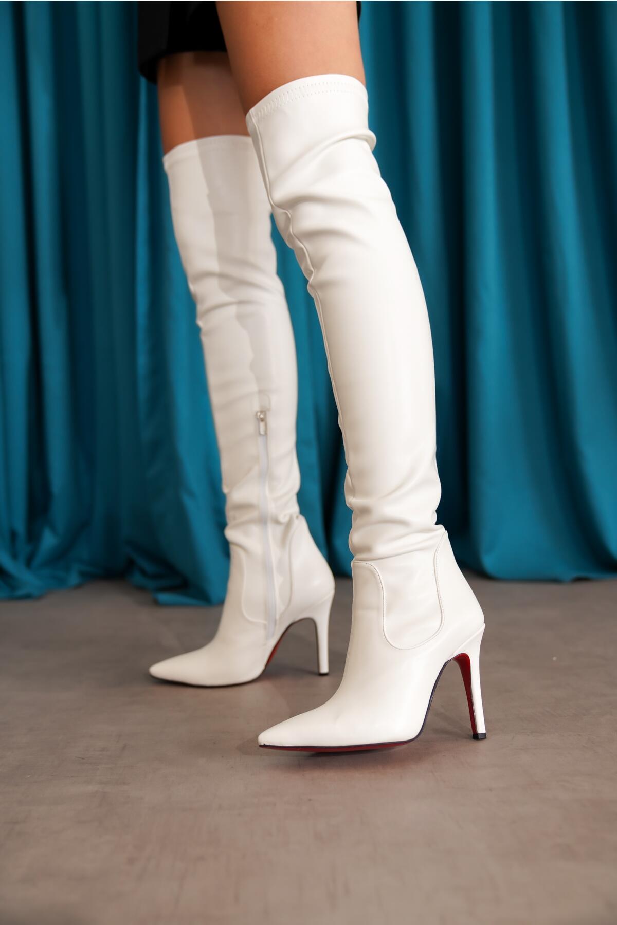 Kadın Yarım Fermuar Diz Üstü Streç Çizme Anjelika Beyaz Cilt