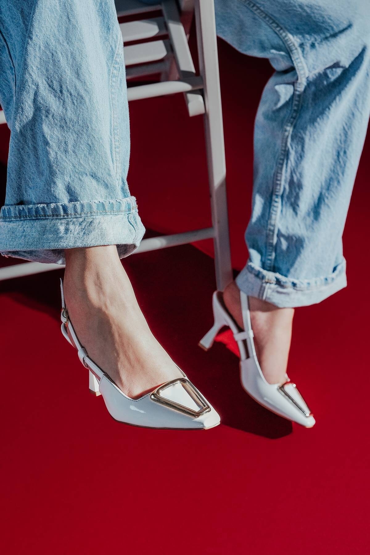 Beyaz Rugan Gümüş Taşlı Özel İnce Topuklu Tasarım Kadın Ayakkabı Miller