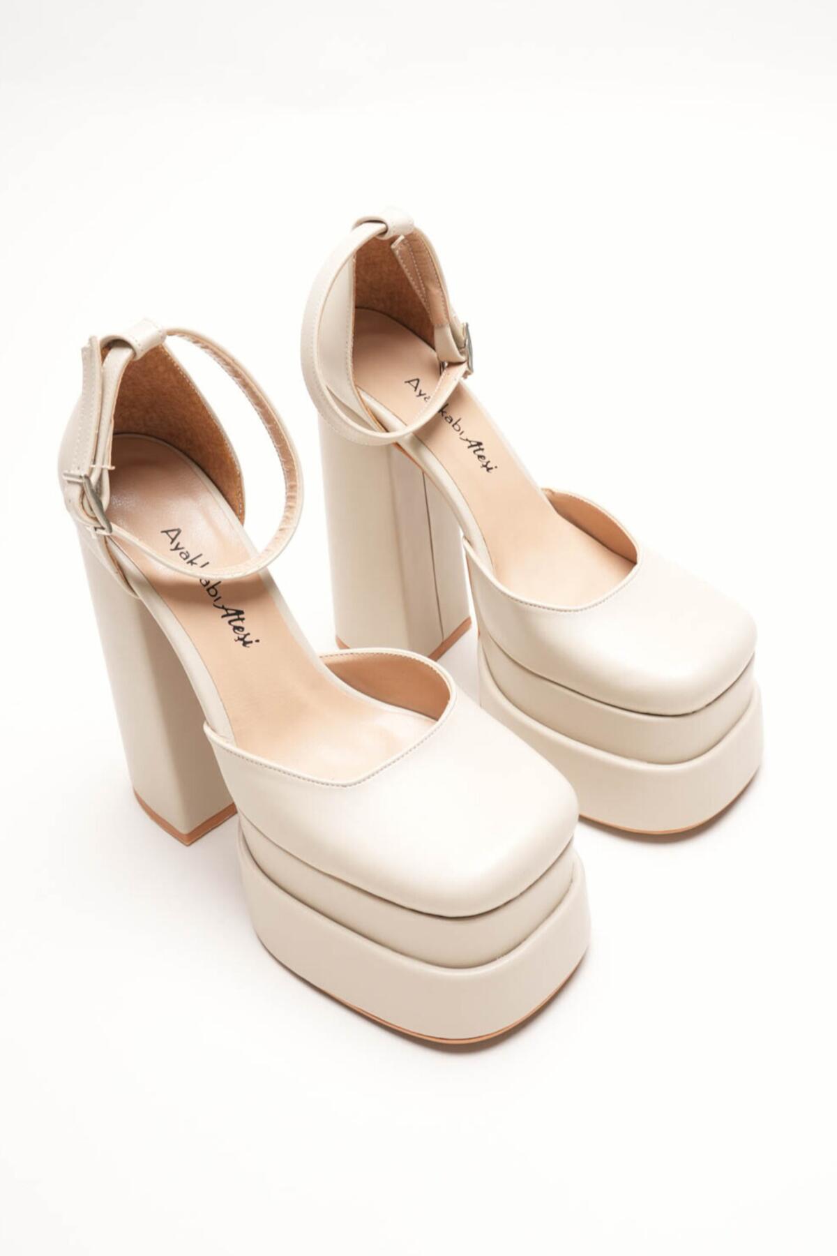Sezonun en trend akımlarından biri olan çift platform (double platform) modasını yansıtan bu ayakkabı, stilinize anında güçlü ve cesur bir dokunuş katıyor. Bej Cilt dokusu ile lüks bir görünüm sunarken, özel tasarım kalın blok topuğu ile yüksekliğine rağmen maksimum konfor ve denge sağlar.