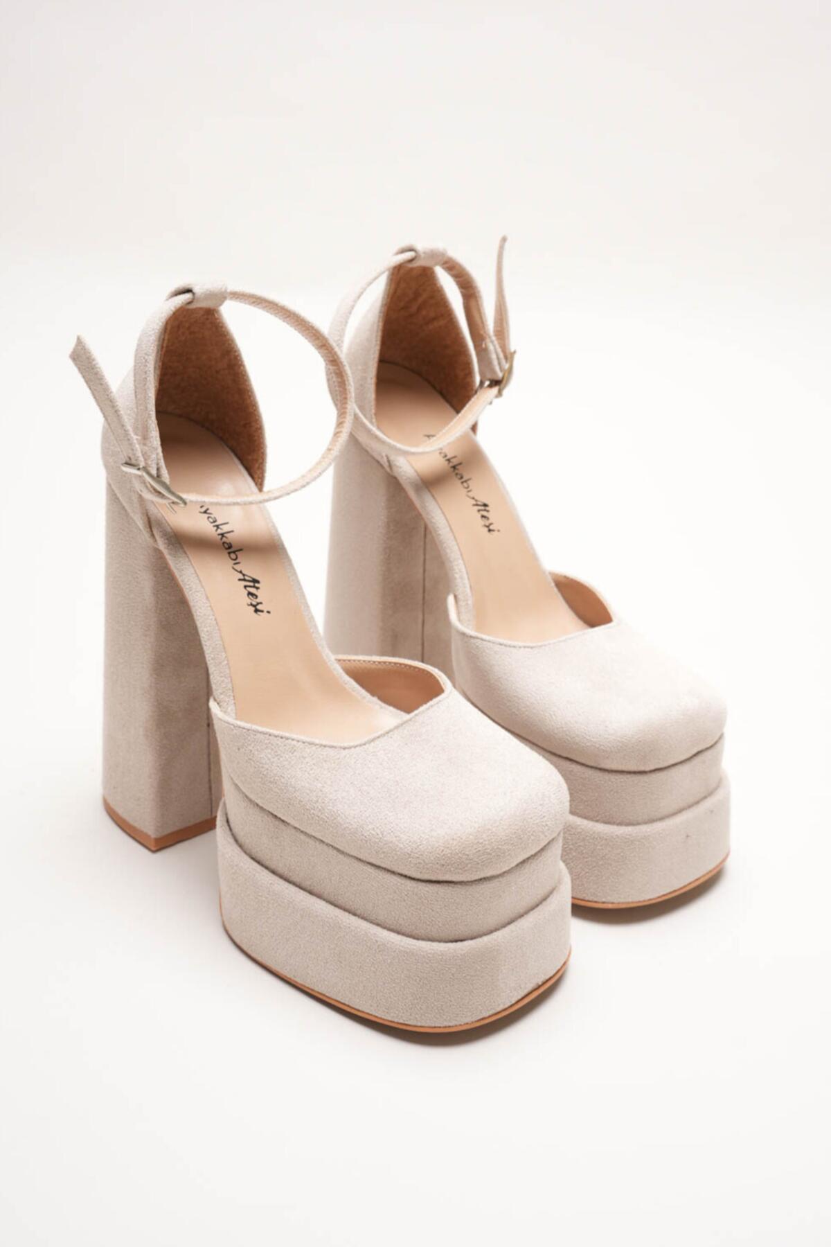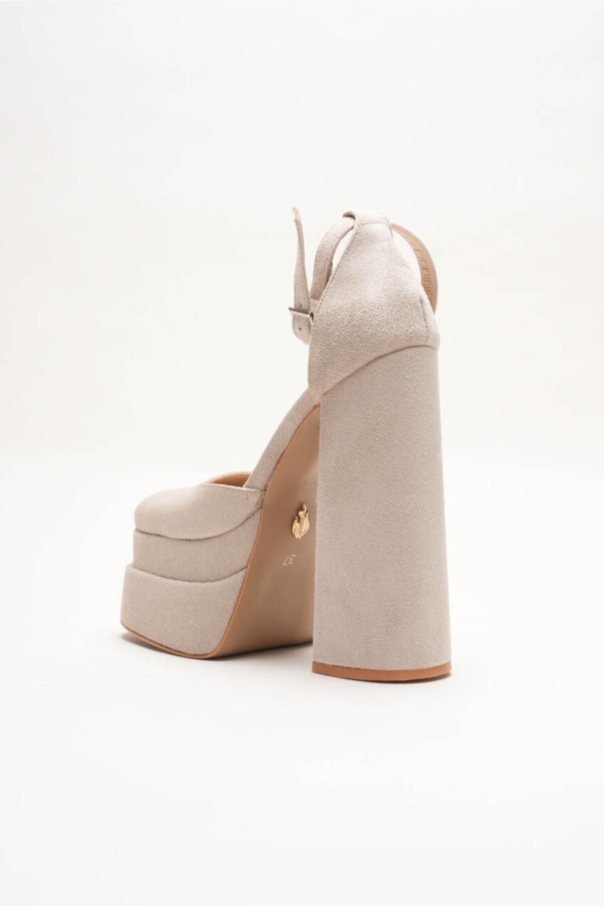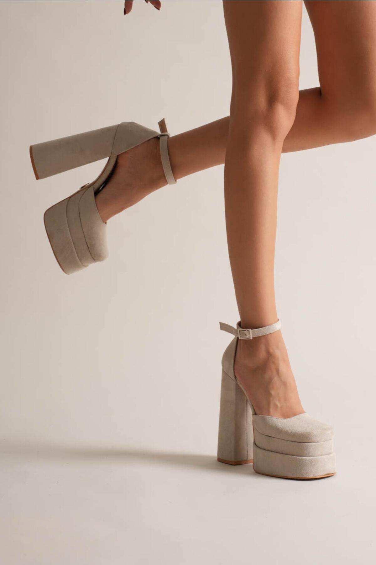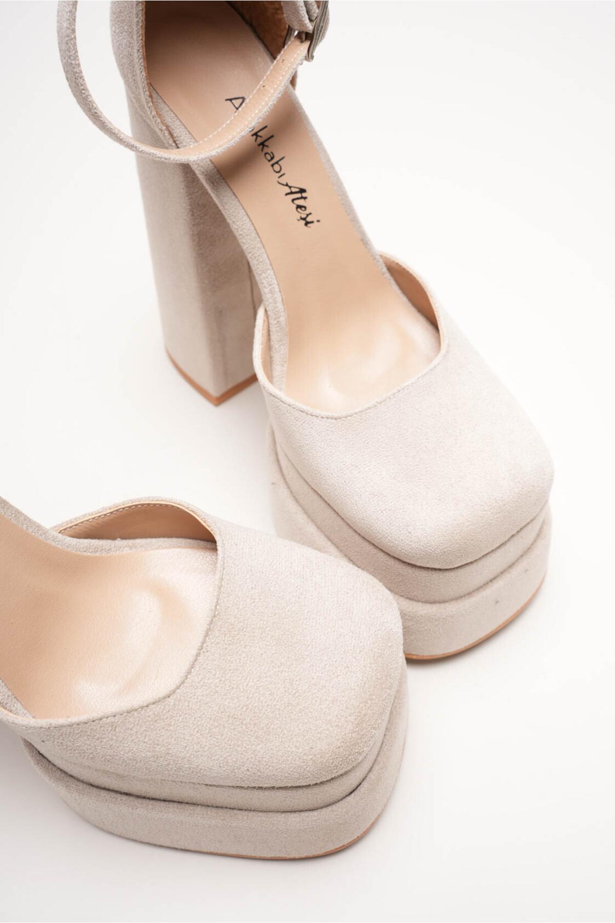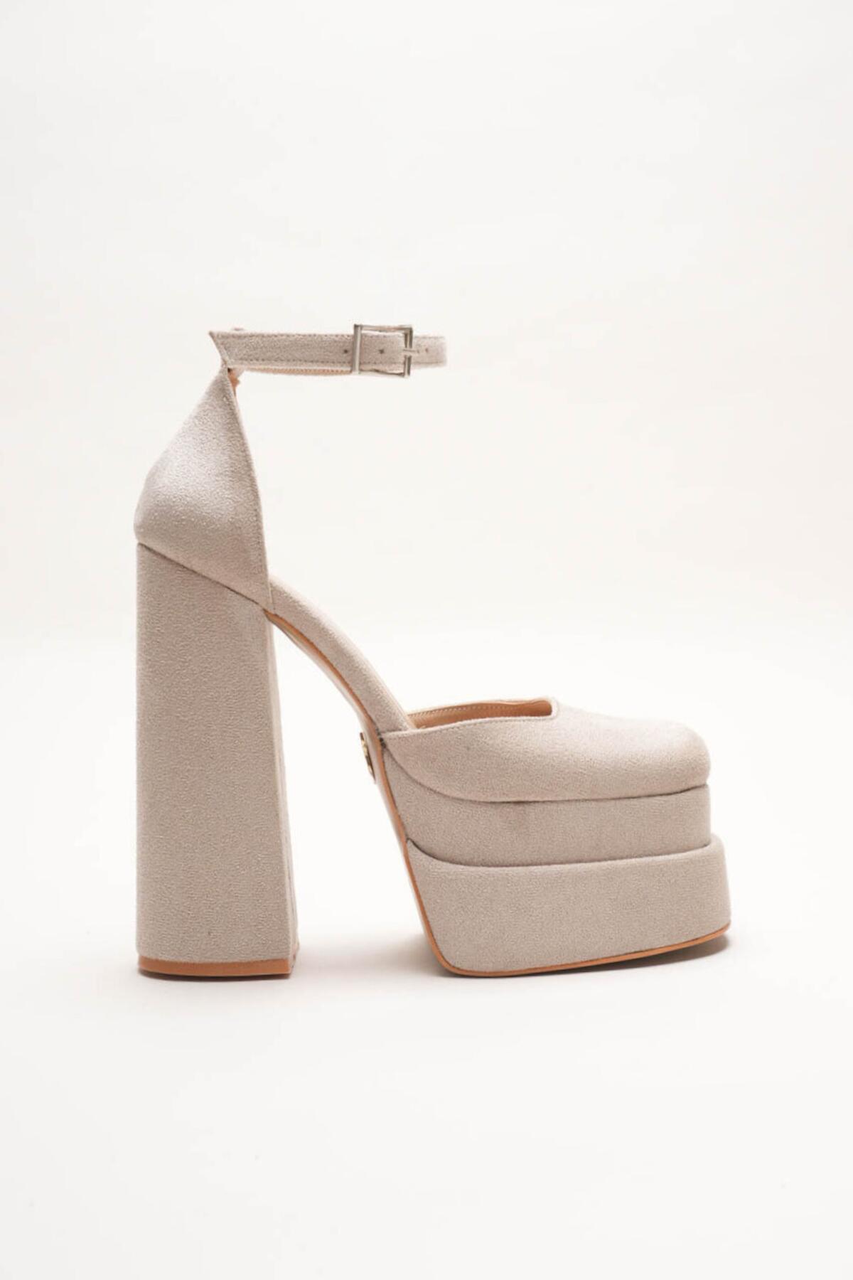 Figo Çift Platformlu Kalın Topuklu Kadın Ayakkabı - Bilekten Bağlamalı Küt Burun Abiye Bej Süet