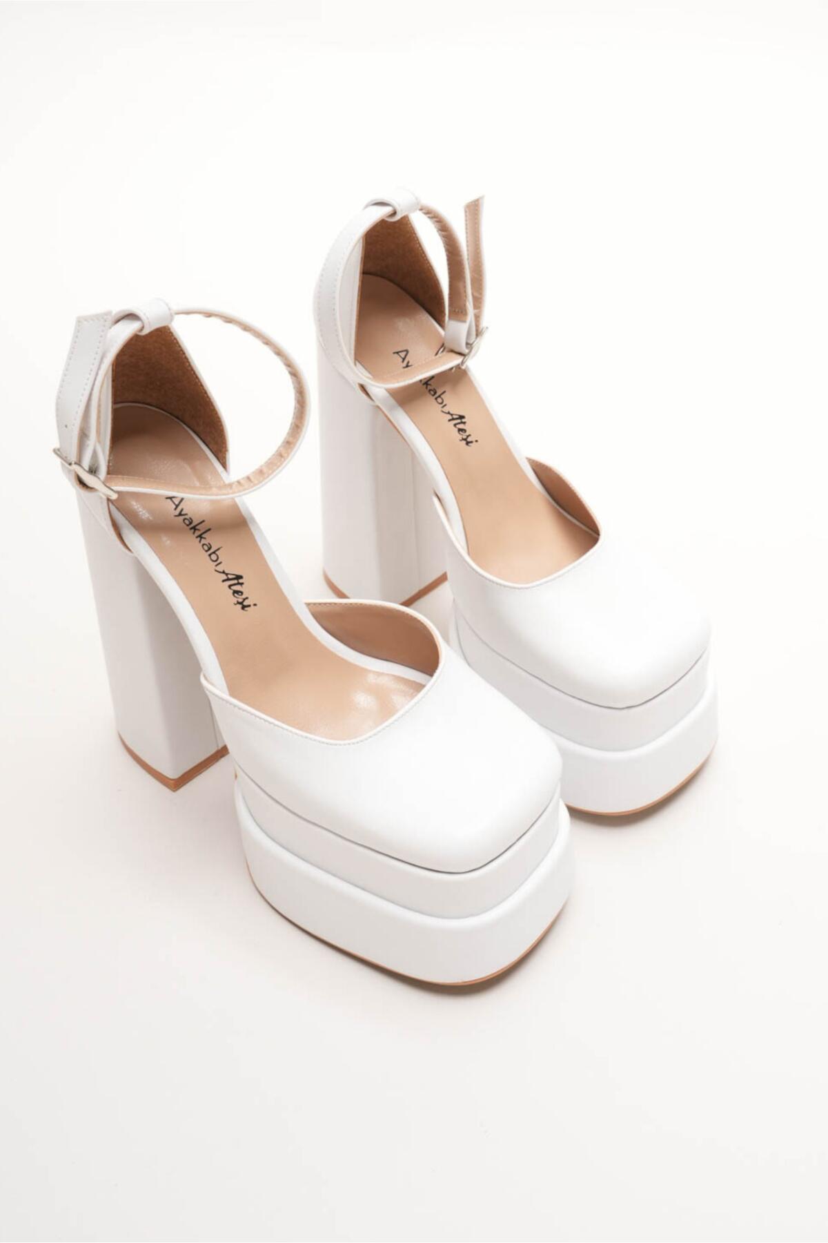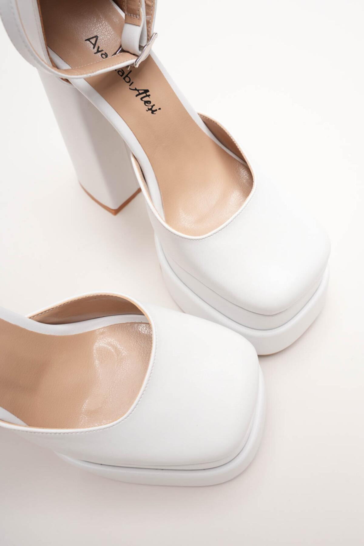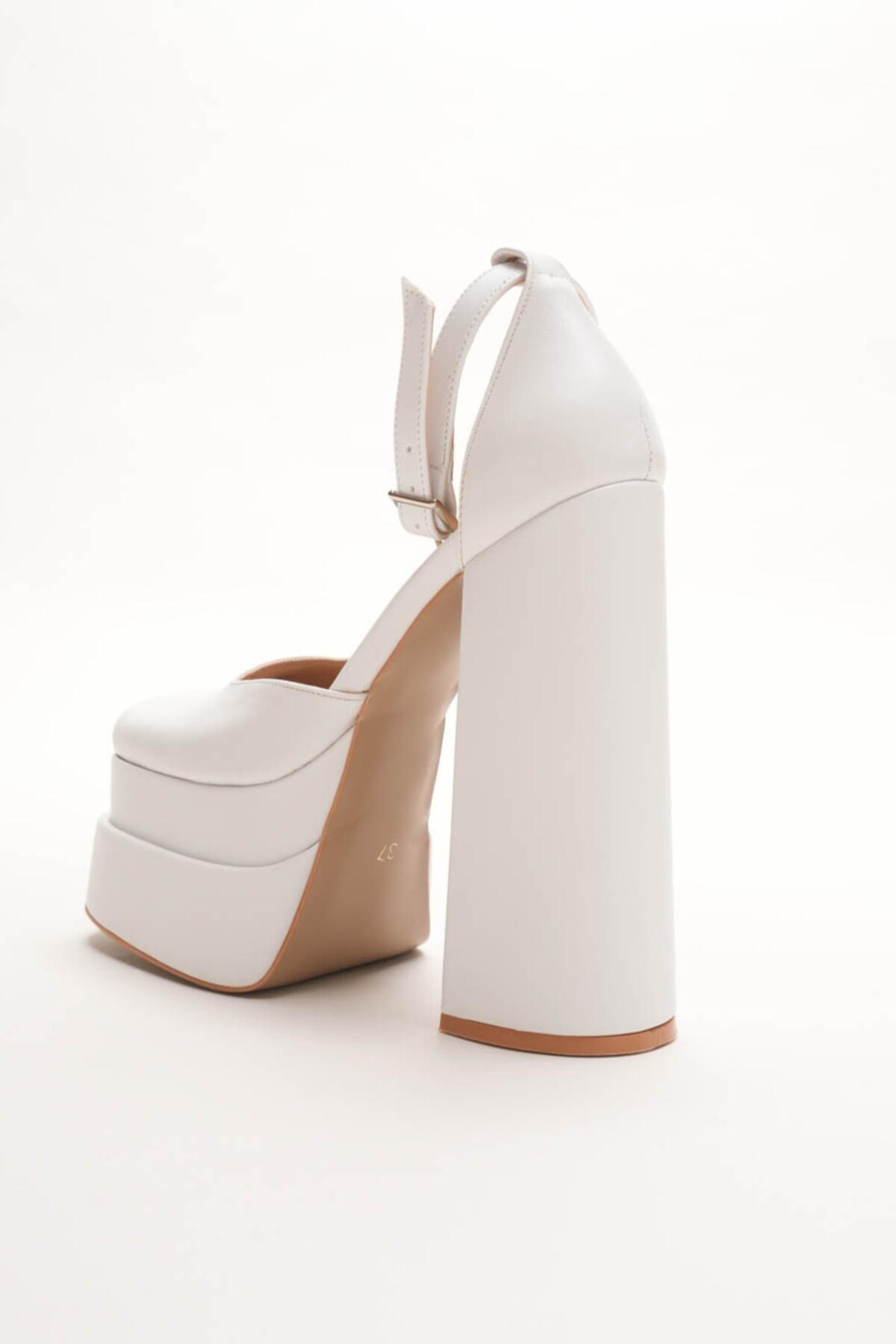 Sezonun en trend akımlarından biri olan çift platform (double platform) modasını yansıtan bu ayakkabı, stilinize anında güçlü ve cesur bir dokunuş katıyor. Beyaz Cilt dokusu ile lüks bir görünüm sunarken, özel tasarım kalın blok topuğu ile yüksekliğine rağmen maksimum konfor ve denge sağlar.