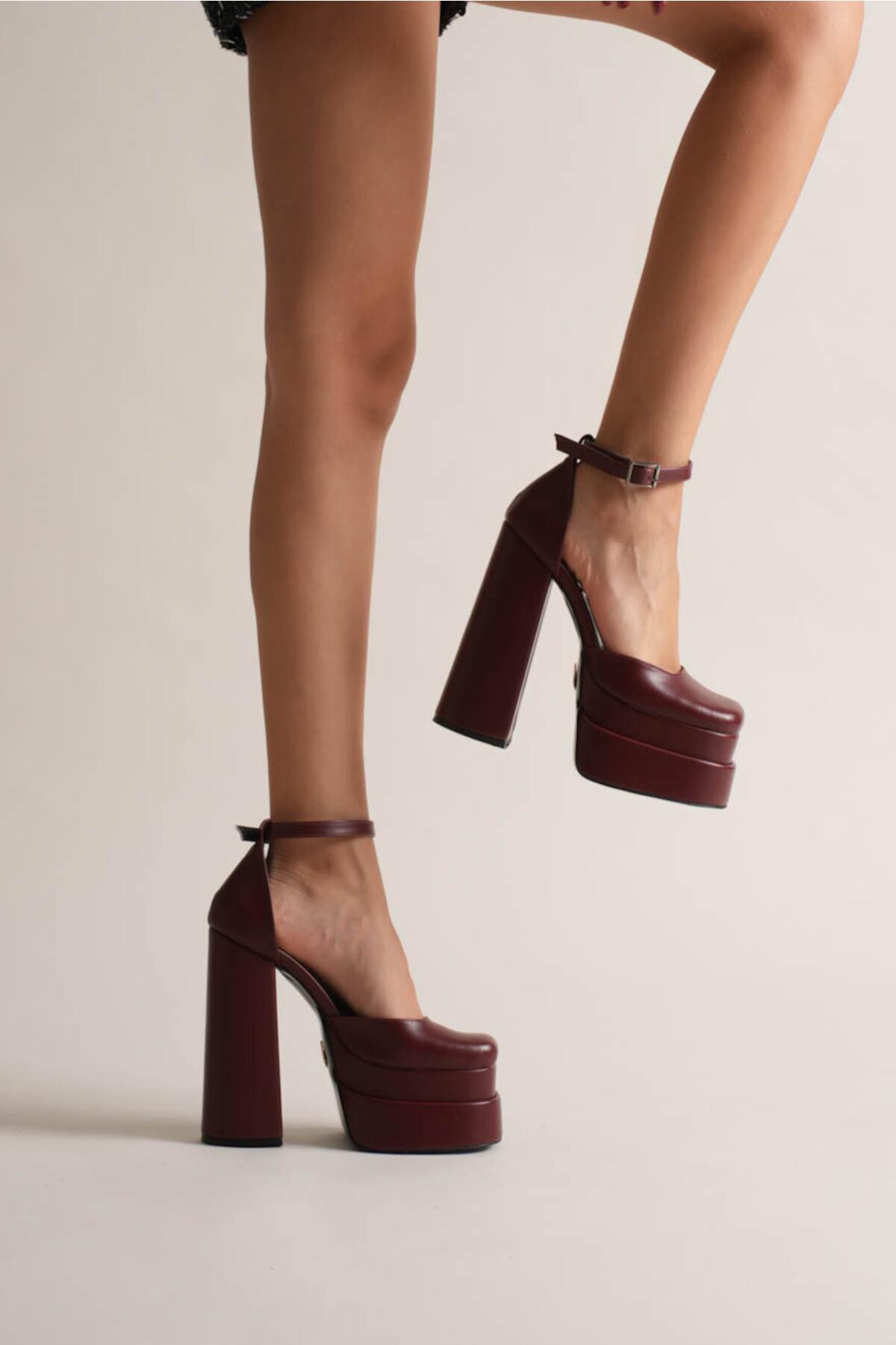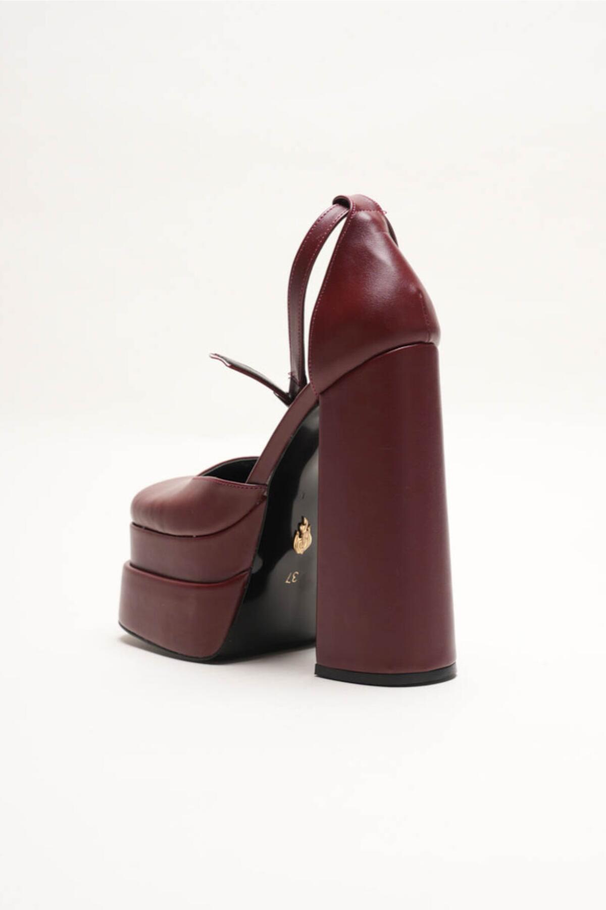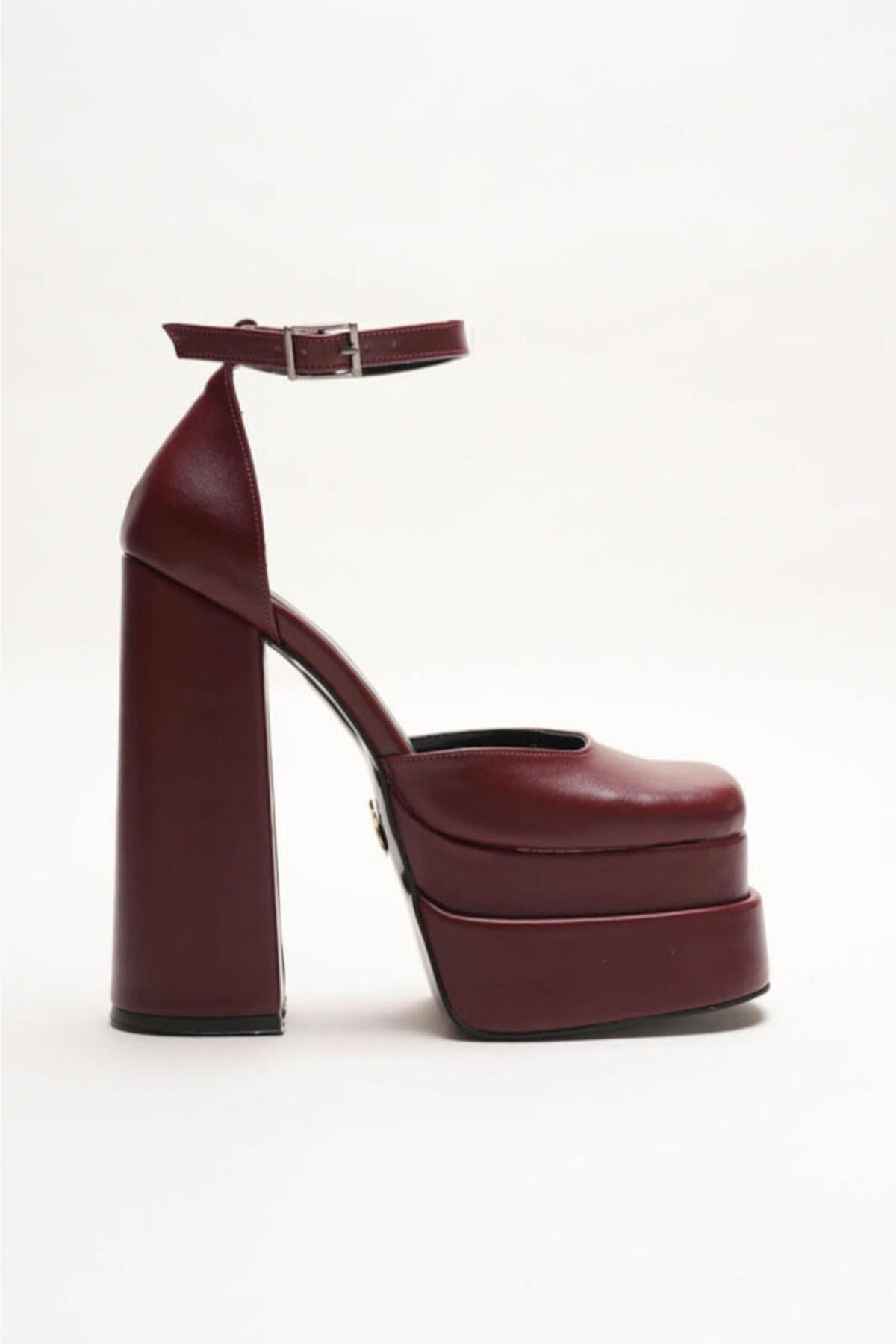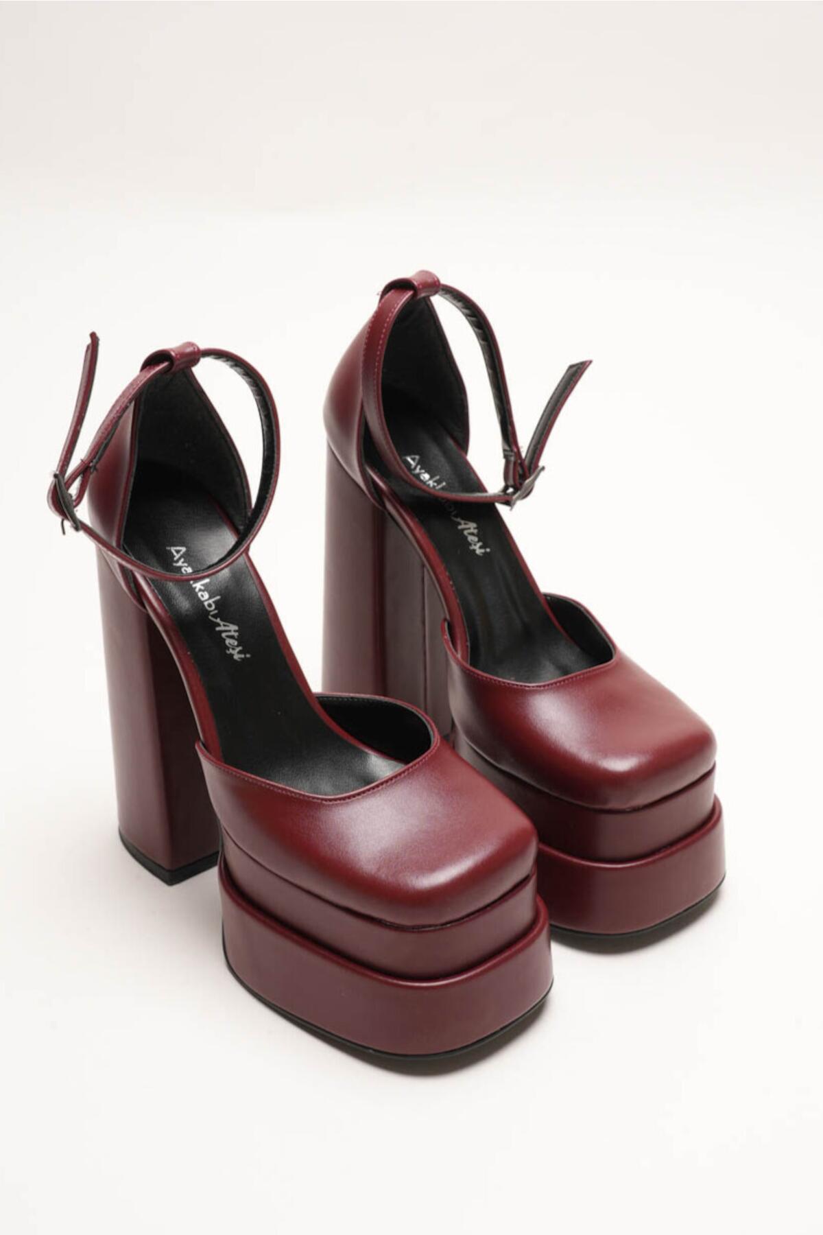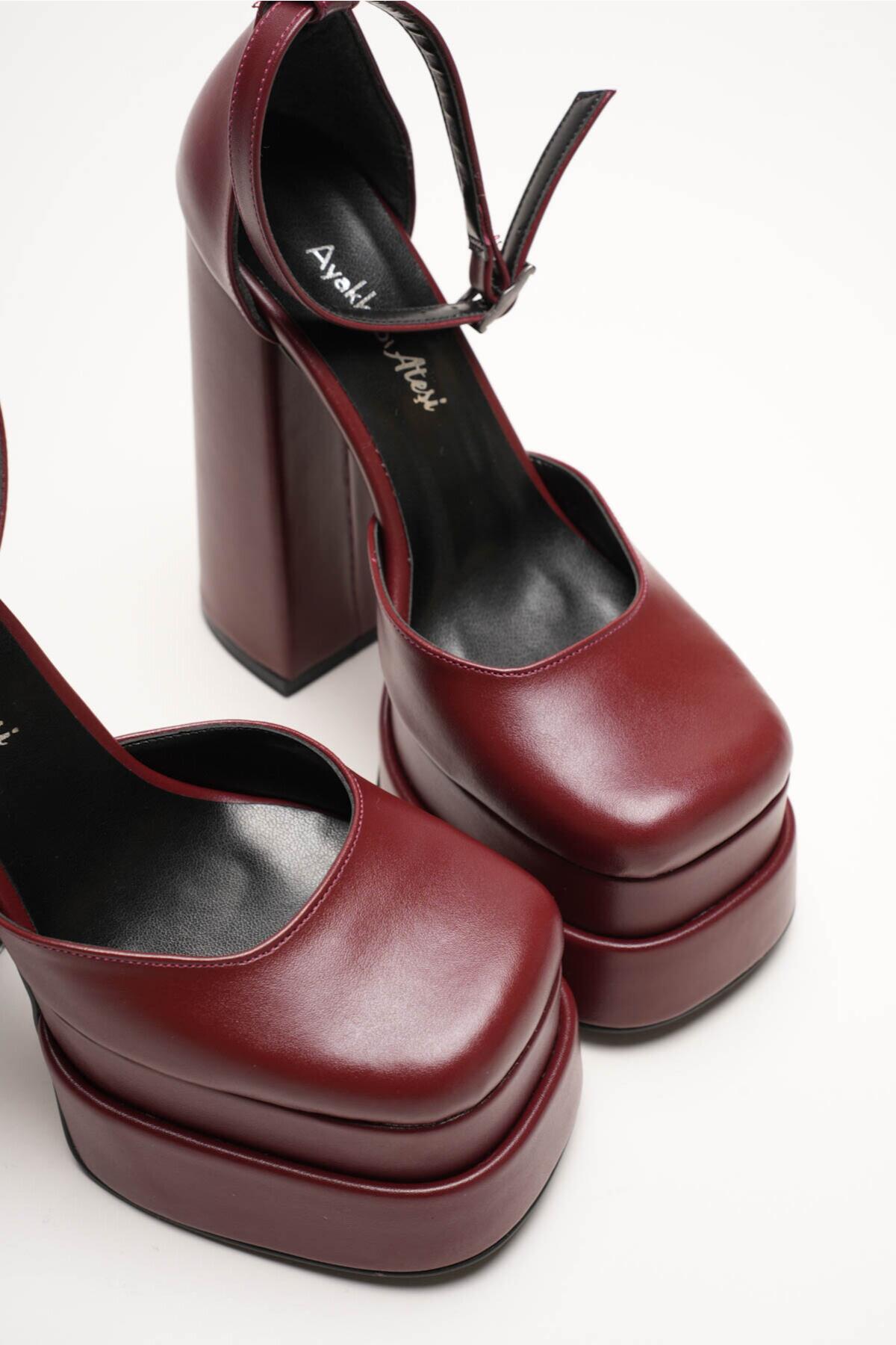 Figo Çift Platformlu Kalın Topuklu Kadın Ayakkabı - Bilekten Bağlamalı Küt Burun Abiye Bordo Cilt