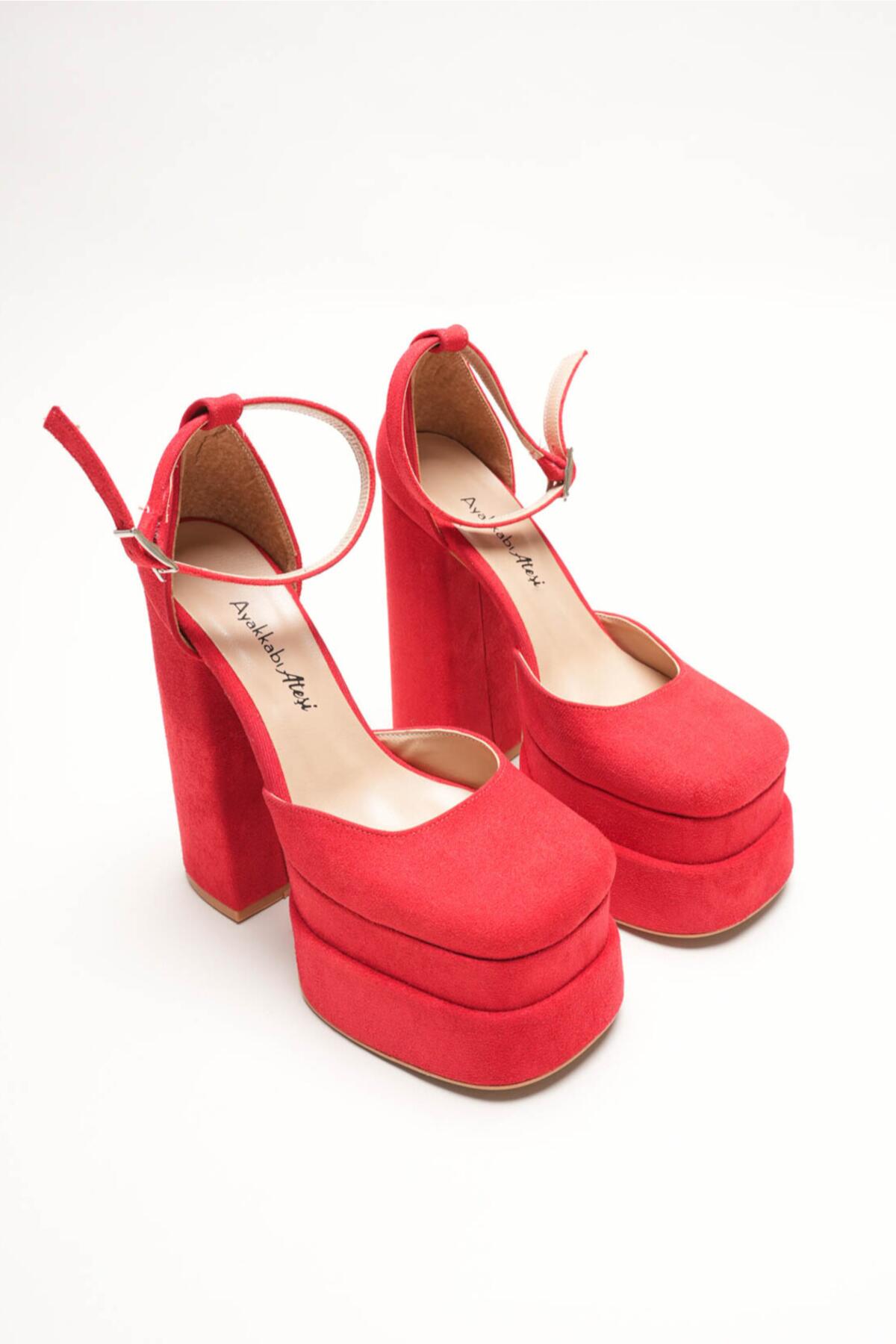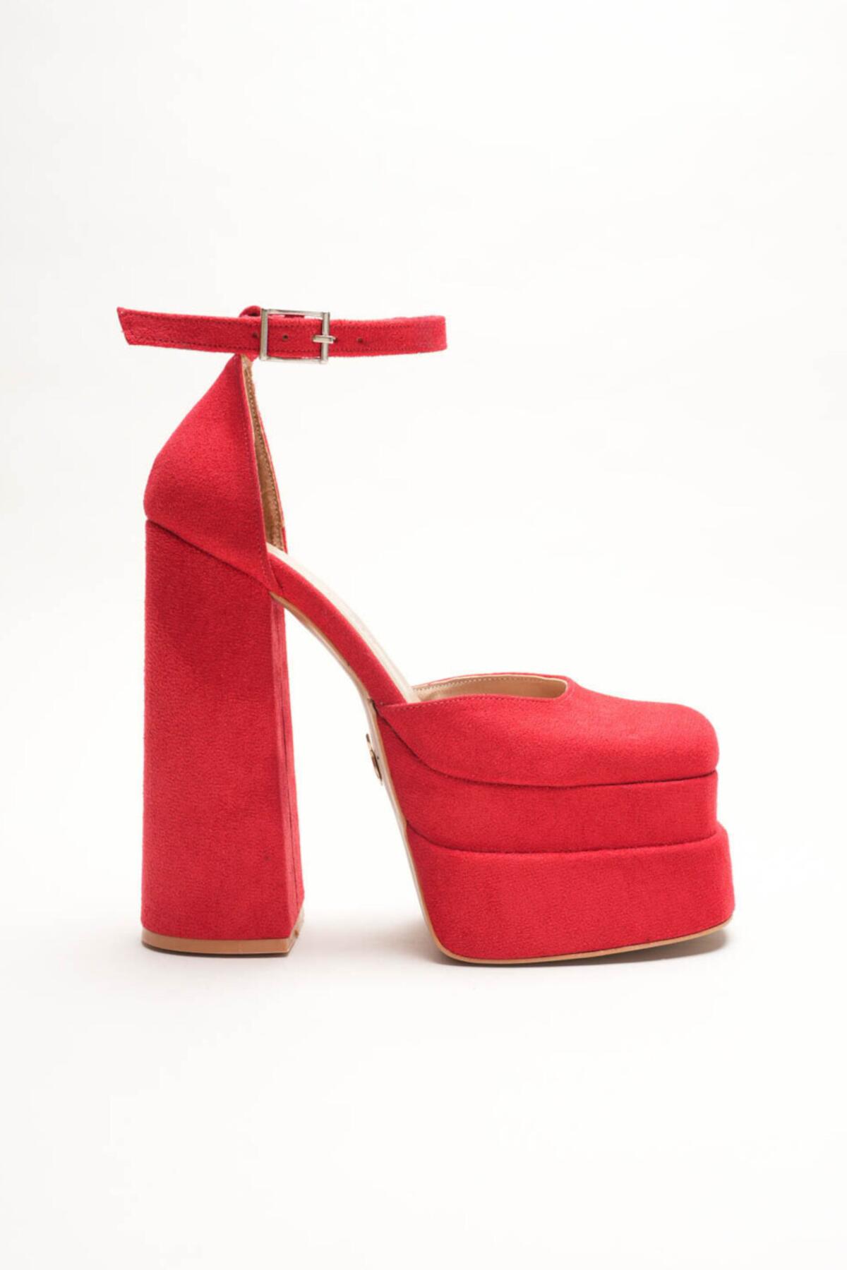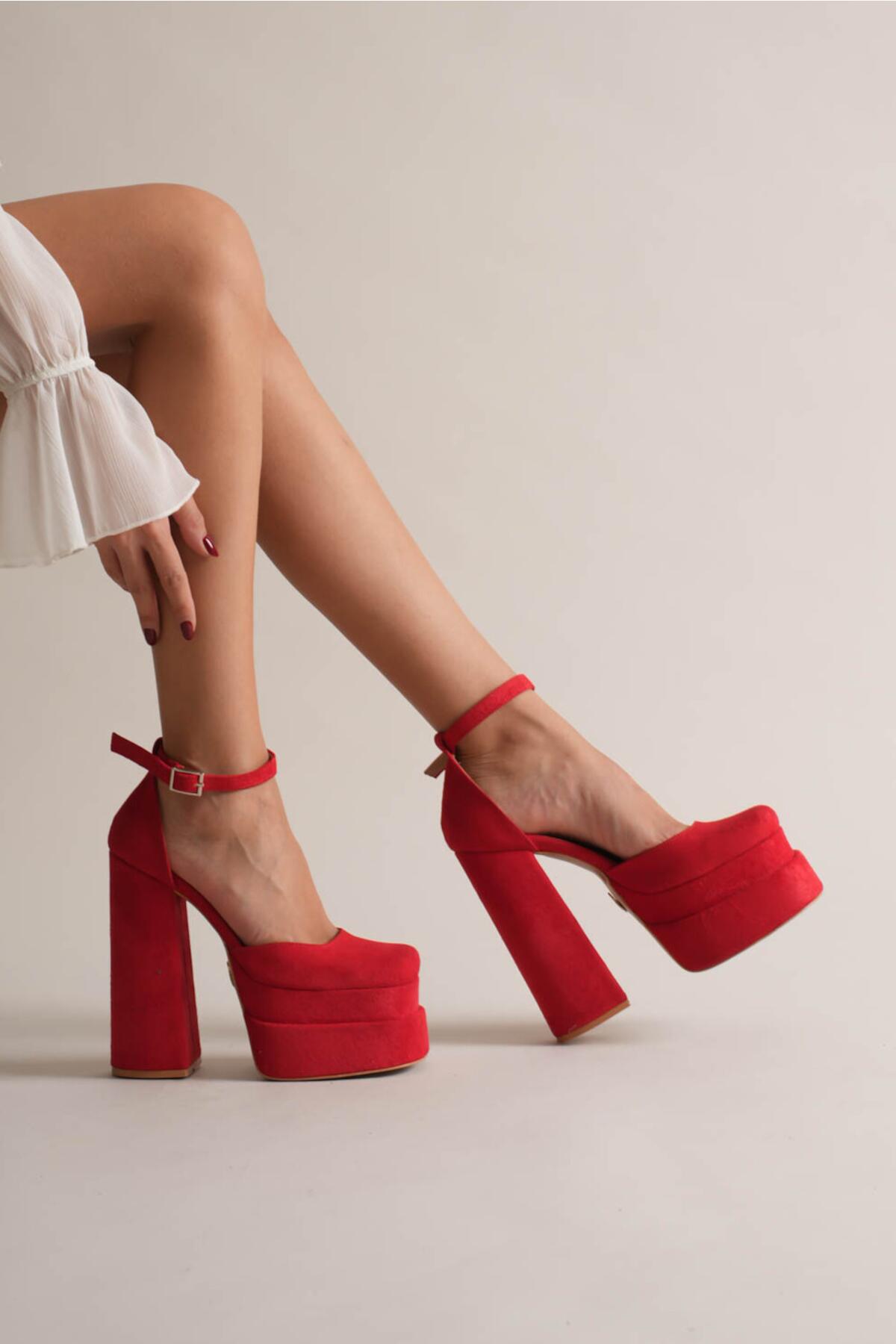 Figo Çift Platformlu Kalın Topuklu Kadın Ayakkabı - Bilekten Bağlamalı Küt Burun Abiye Kırmızı Süet