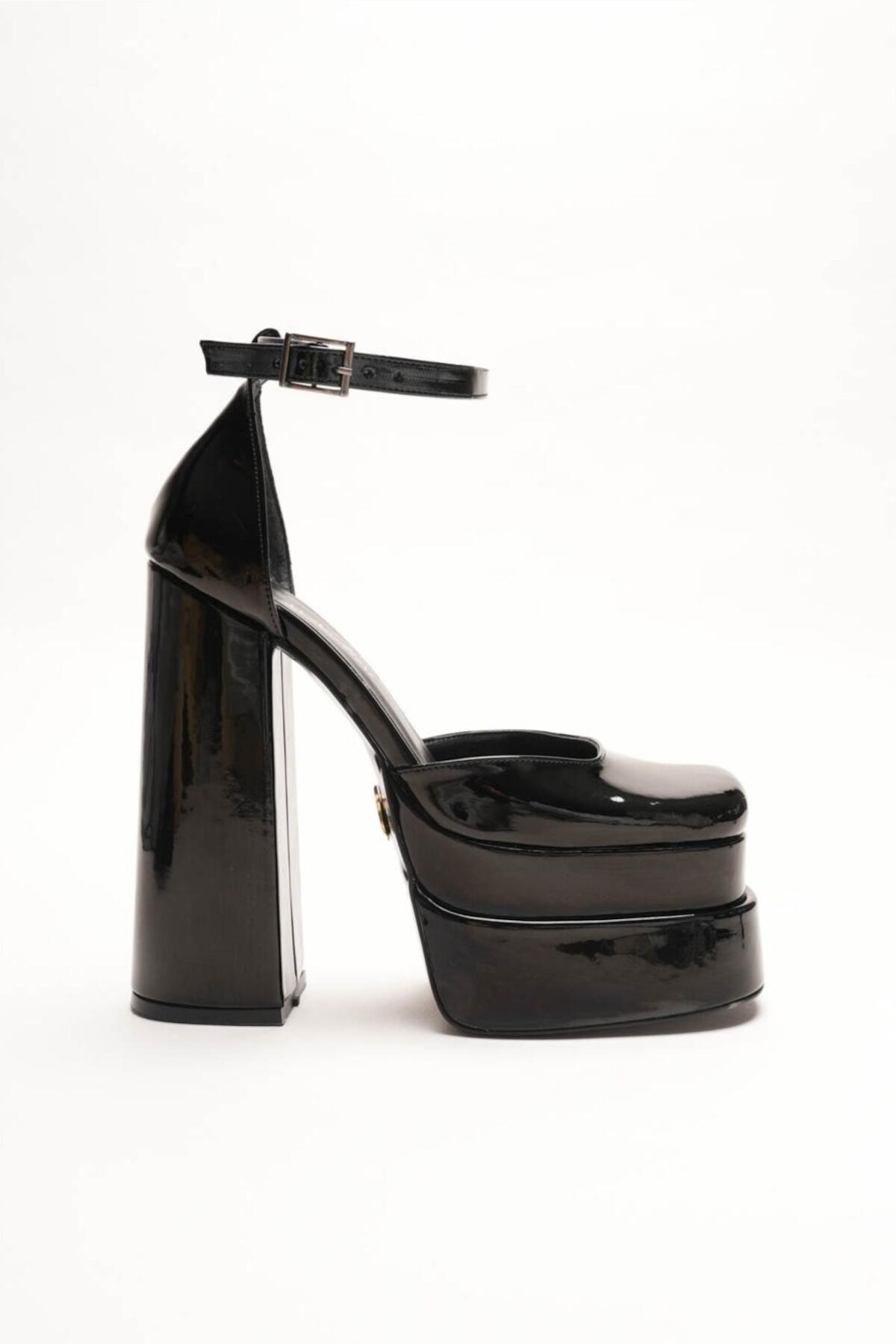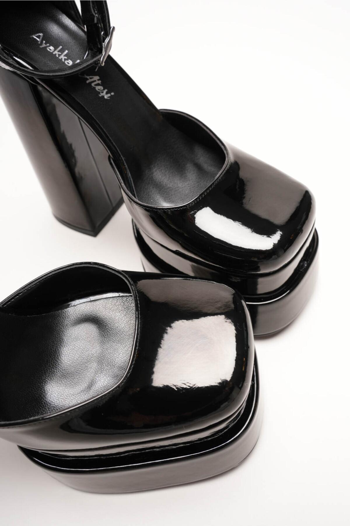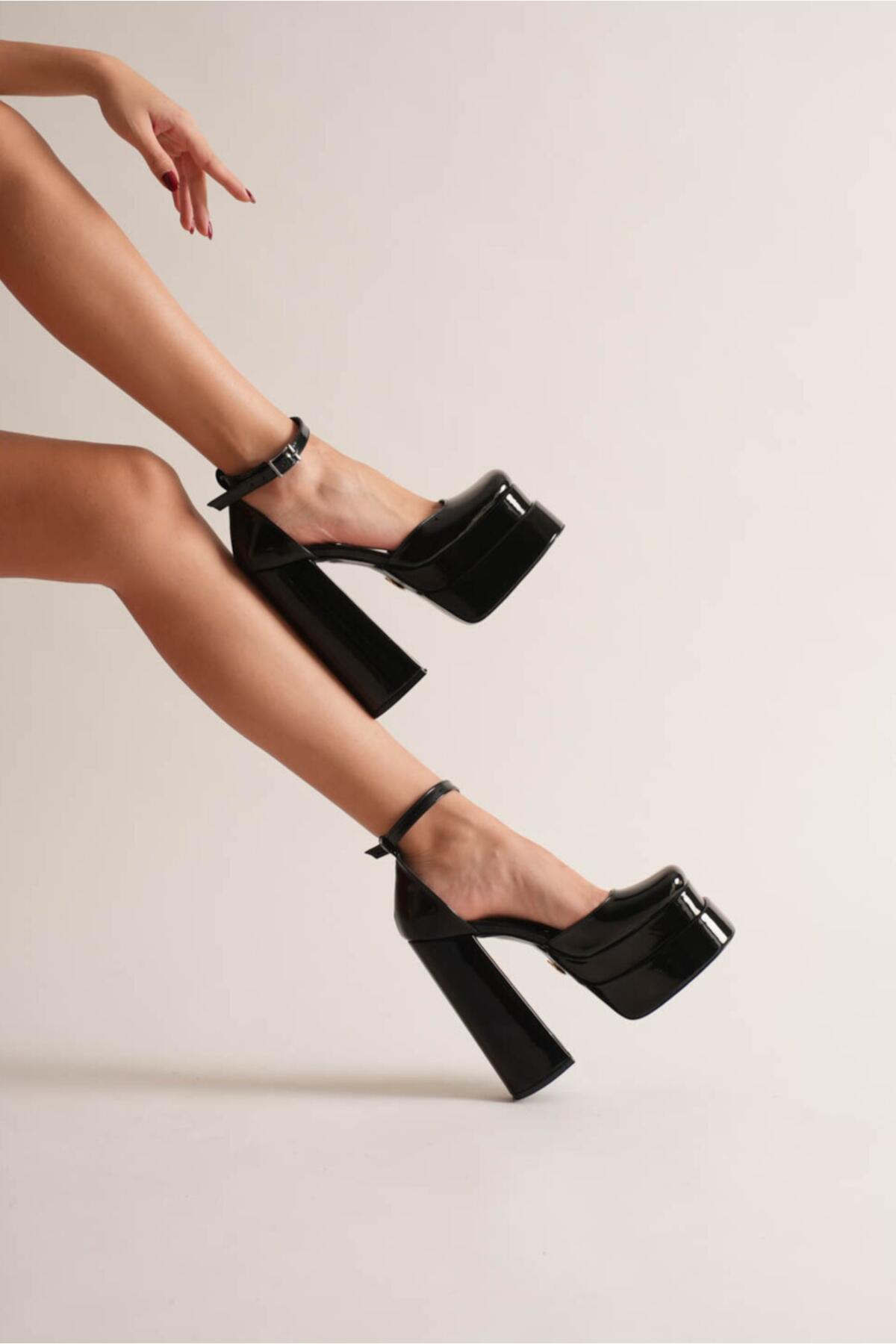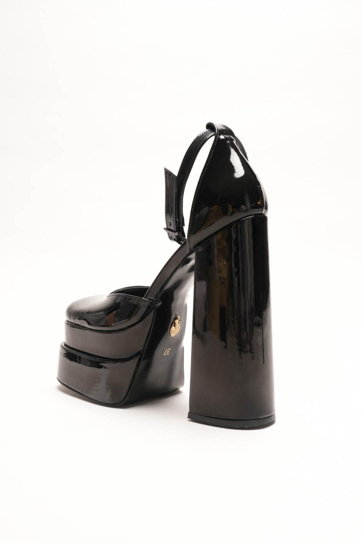 Sezonun en trend akımlarından biri olan çift platform (double platform) modasını yansıtan bu ayakkabı, stilinize anında güçlü ve cesur bir dokunuş katıyor. Siyah Rugan dokusu ile lüks bir görünüm sunarken, özel tasarım kalın blok topuğu ile yüksekliğine rağmen maksimum konfor ve denge sağlar.
