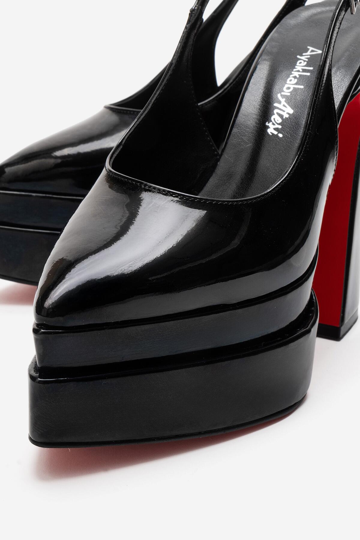 Kadın Arkası Açık Sivri Burun Çift Platform Yüksek Topuklu Ayakkabı Medelo Siyah Rugan