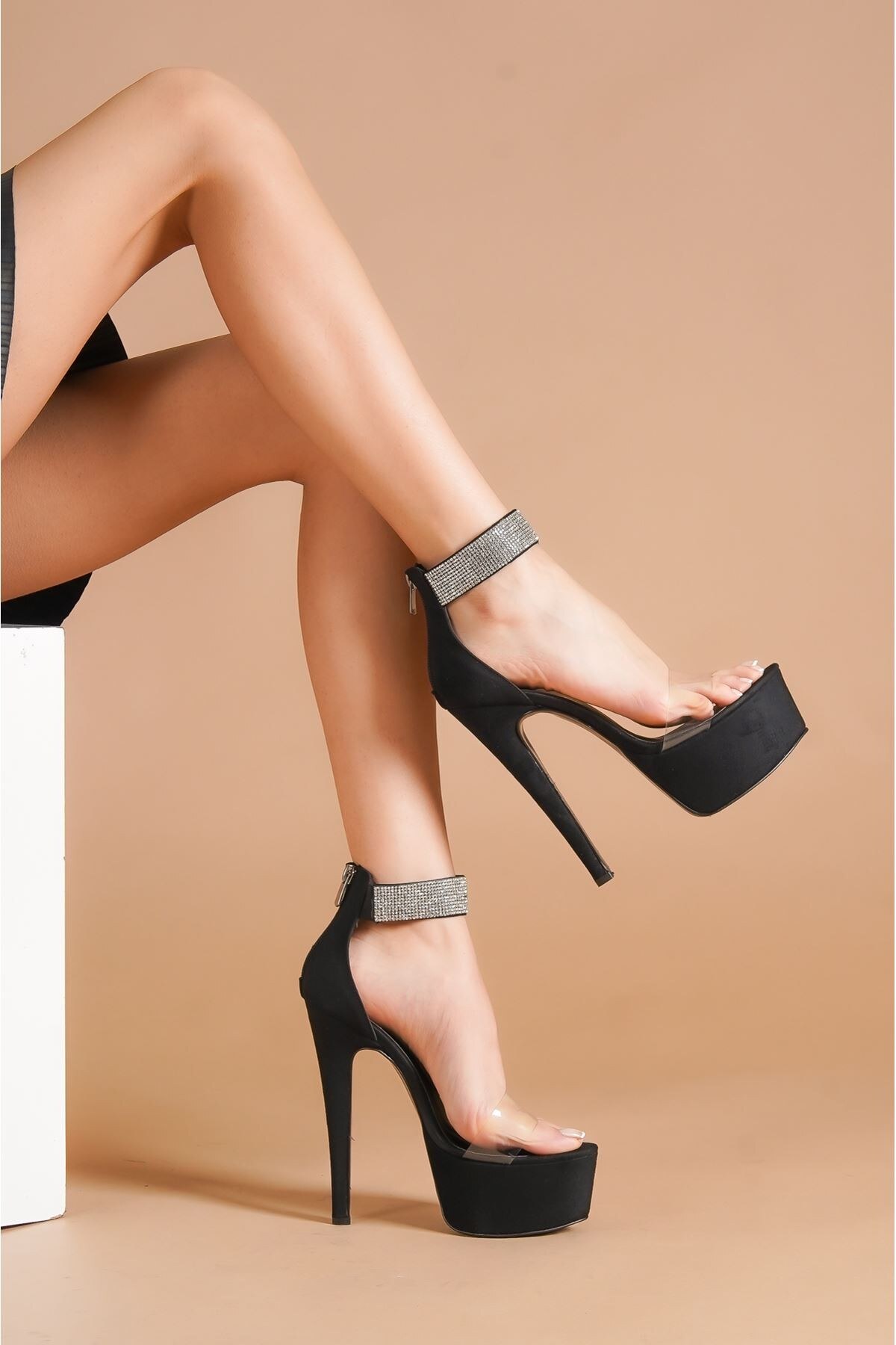Kadın İnce Topuklu Taşlı Bilekli Platform Evons Siyah Süet