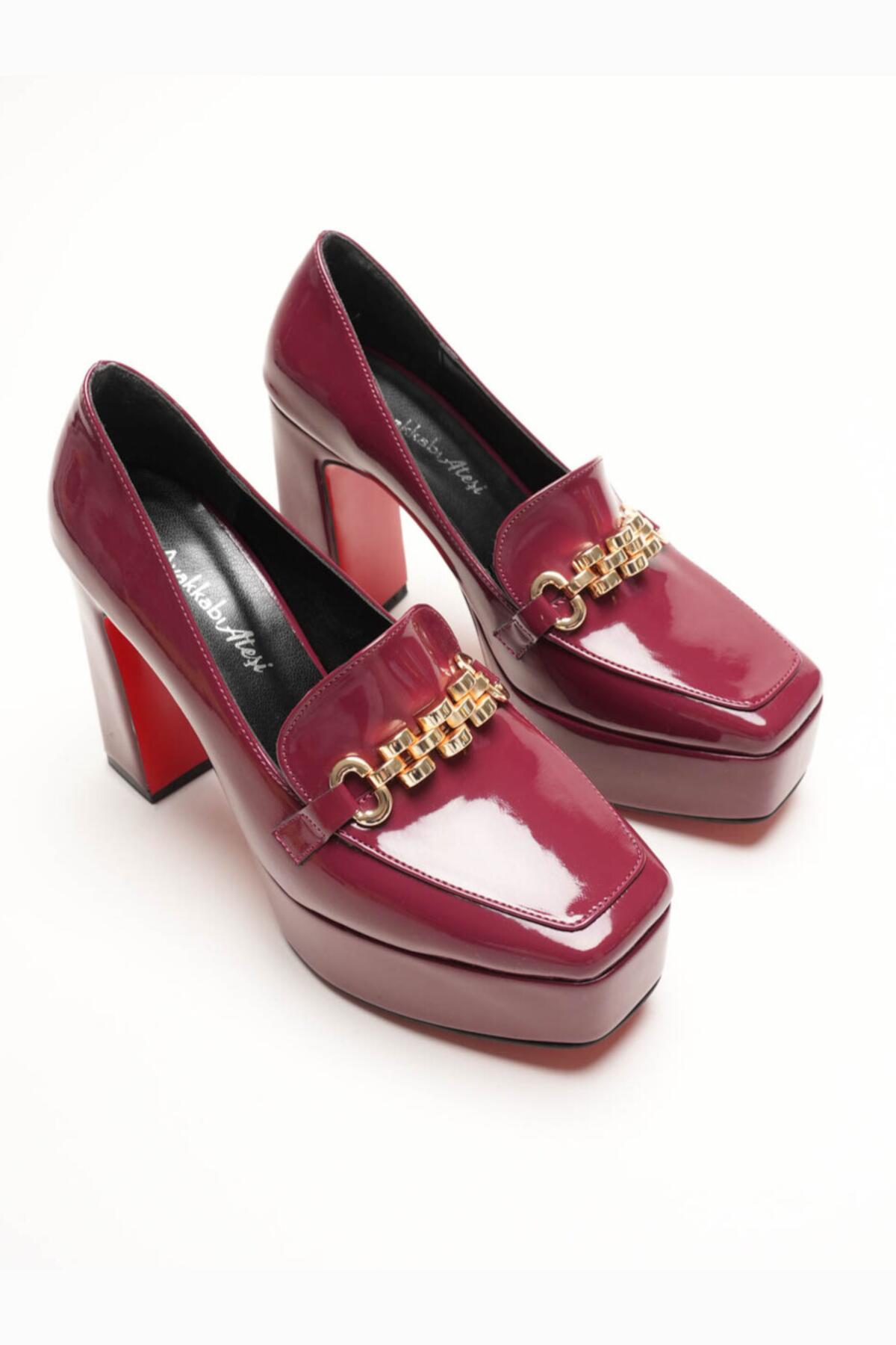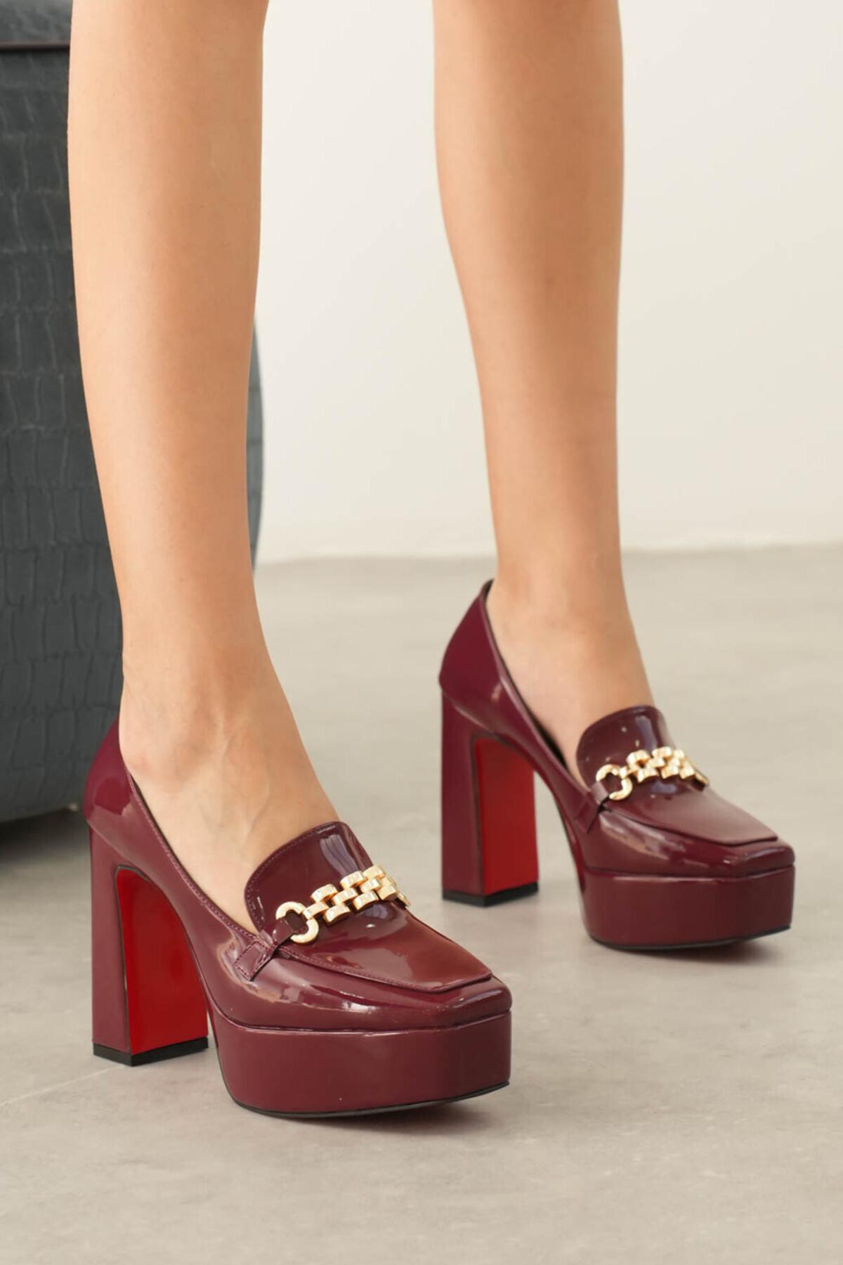 Kadın Platform Tasarım Toka Detaylı Orta Topuklu Ayakkabı Vanera Bordo Rugan