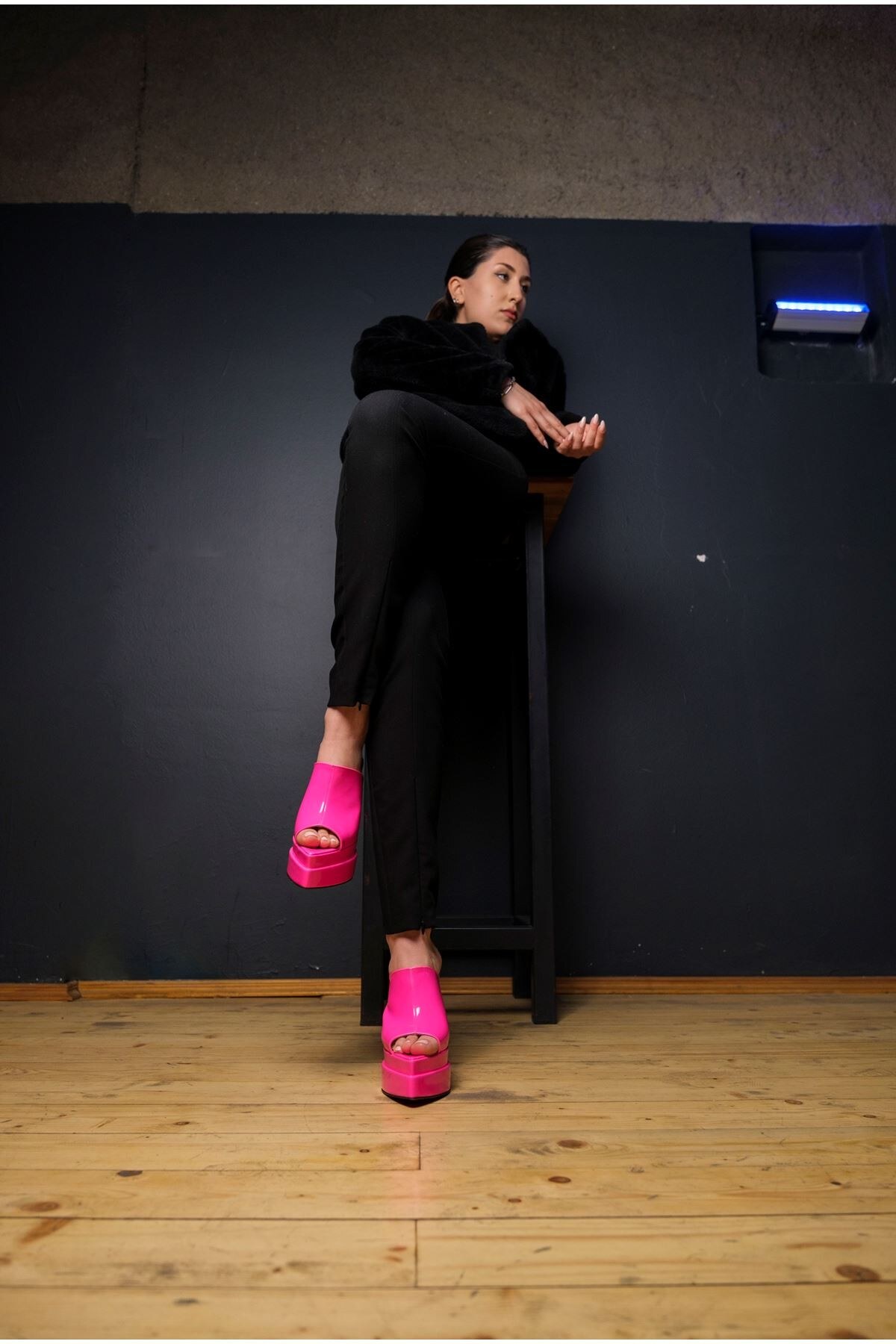 Kadın Çift Platform Tasarım Burnu Kapalı Yüksek Topuklu Terlik Farah Fuşya Rugan