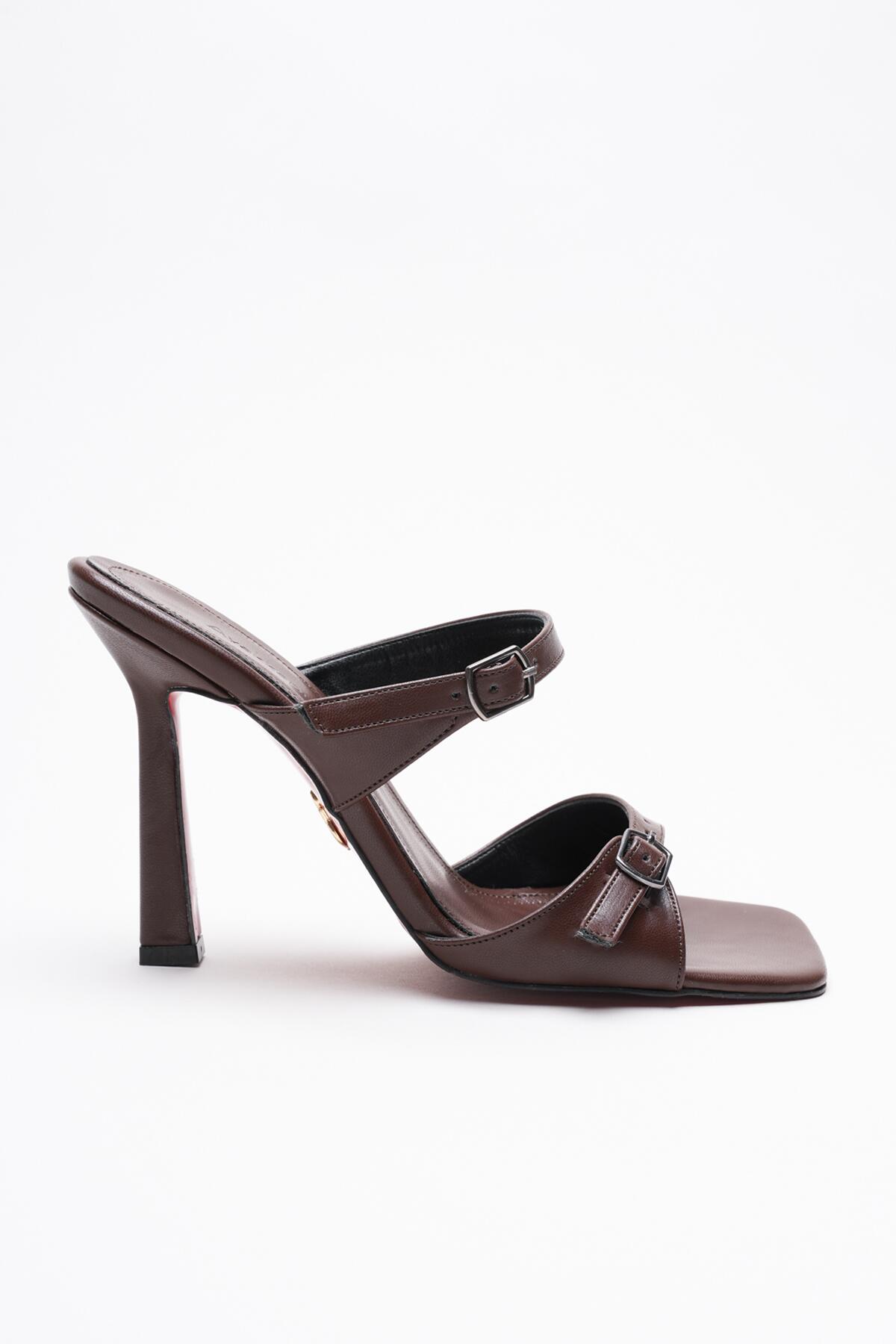 Kadın Çift Bant Tokalı Topuklu Terlik Rona Kahverengi Cilt