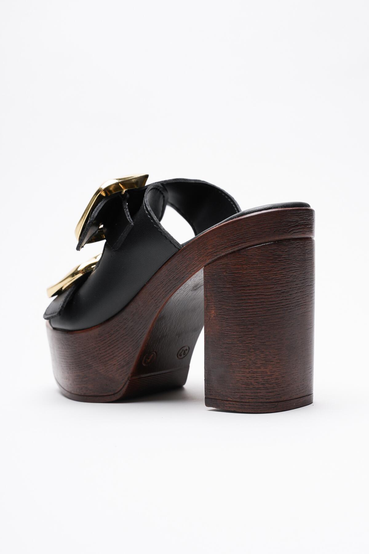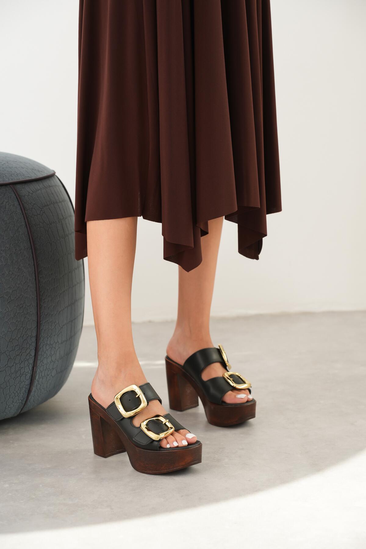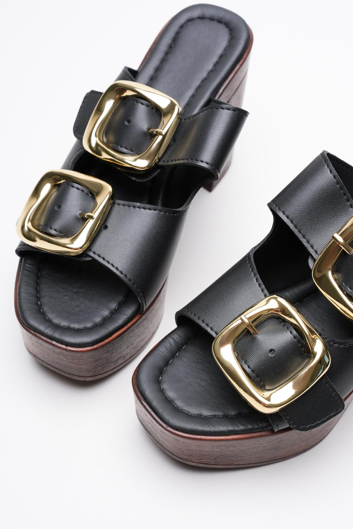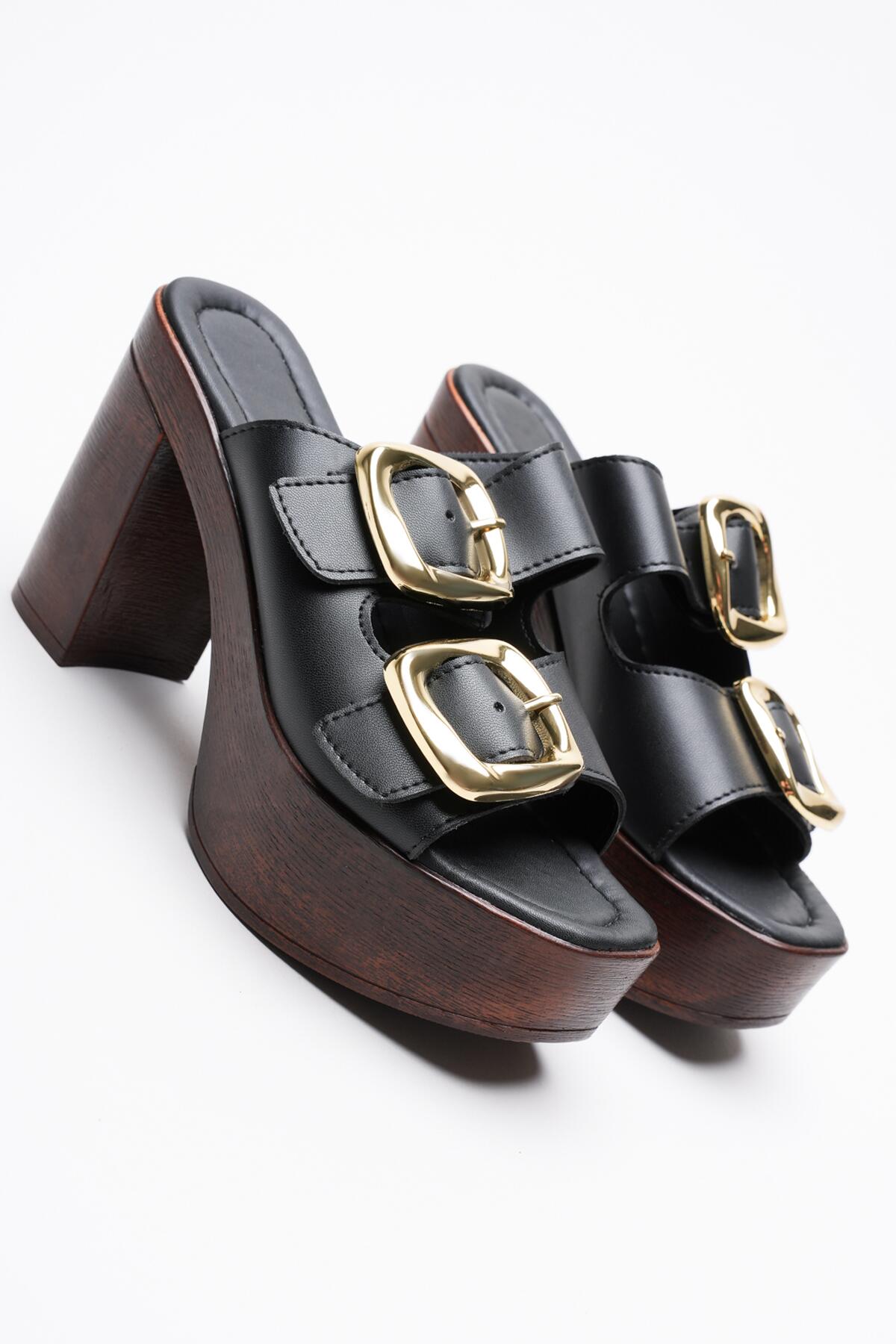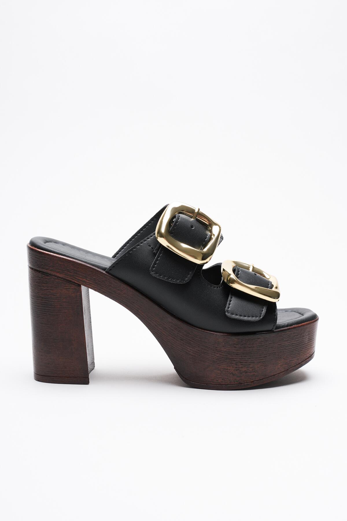 Kadın Mantar Taban İki Bant Tokalı Topuklu Terlik Case Siyah Cilt