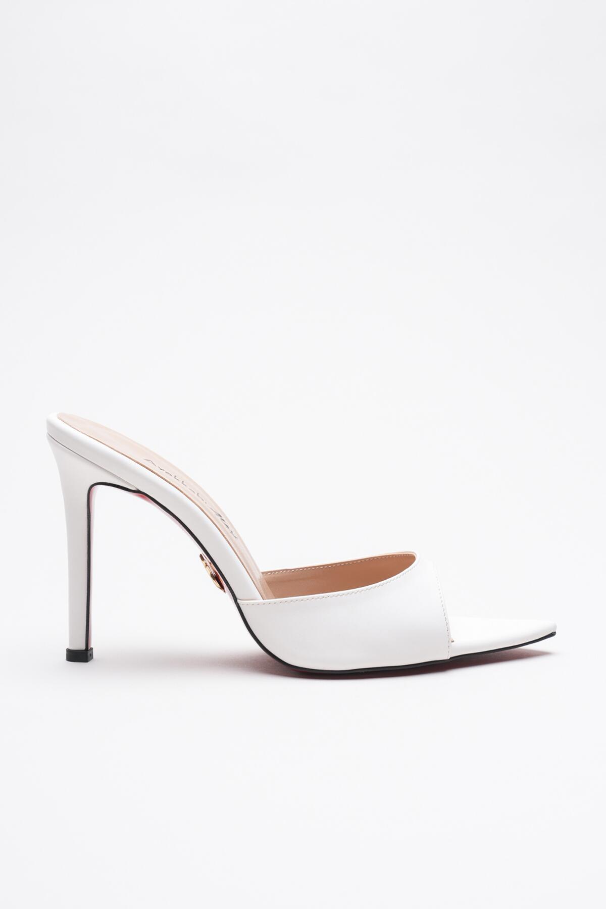 Kadın Sivri Burun İnce Topuklu Terlik Sona Beyaz Cilt