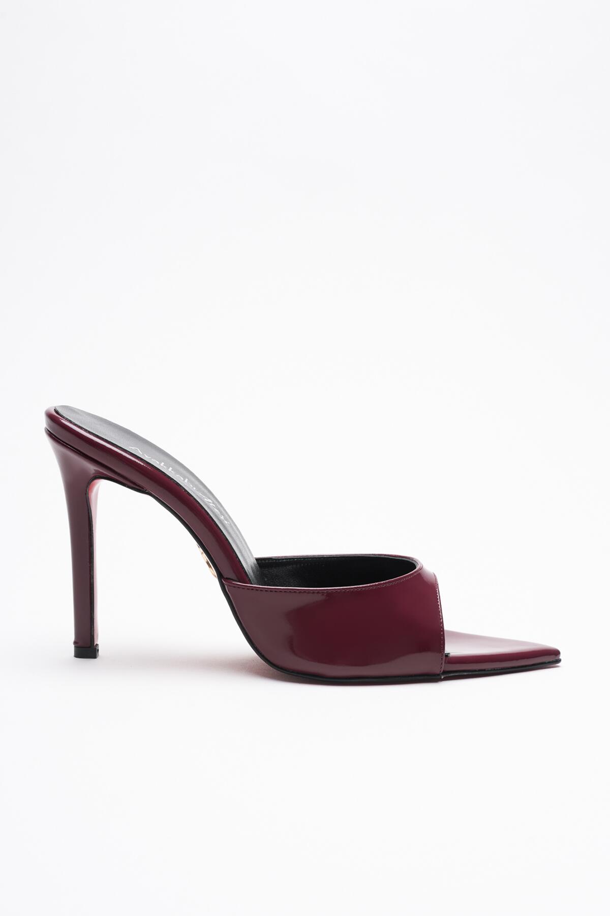 Kadın Sivri Burun İnce Topuklu Terlik Sona Bordo Rugan