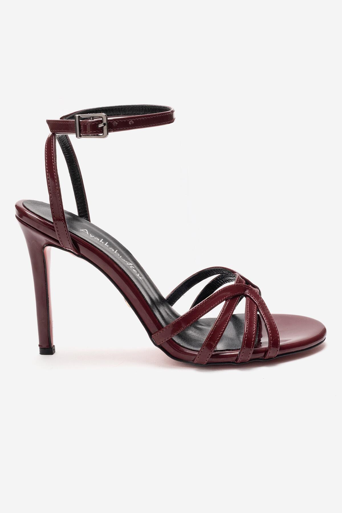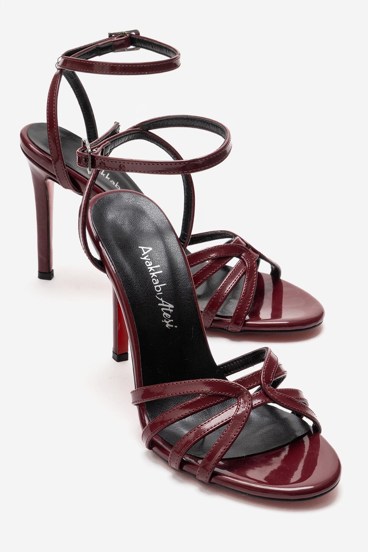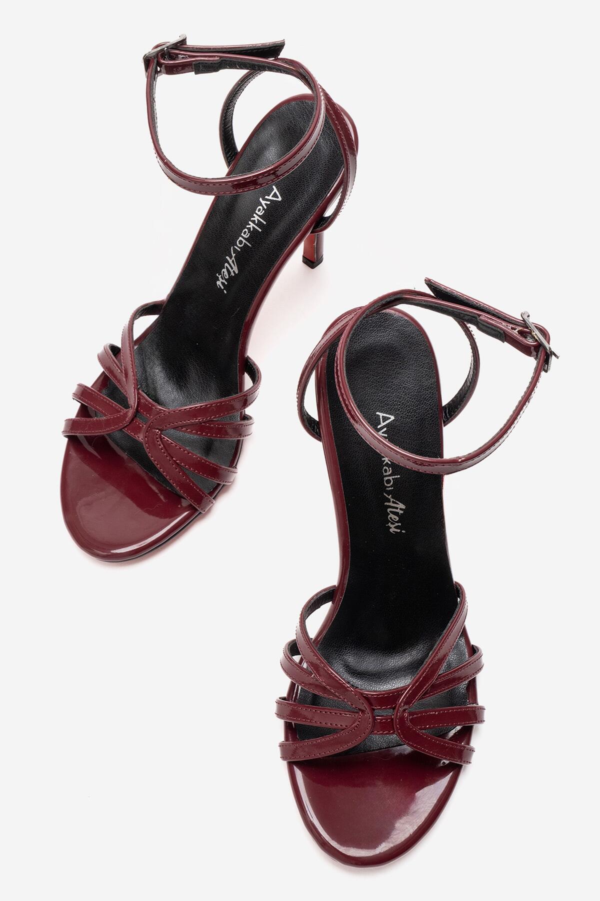 Kadın Açık Kafes Burun Tasarım İnce Topuklu Biyeli Ayakkabı Cage Bordo Rugan