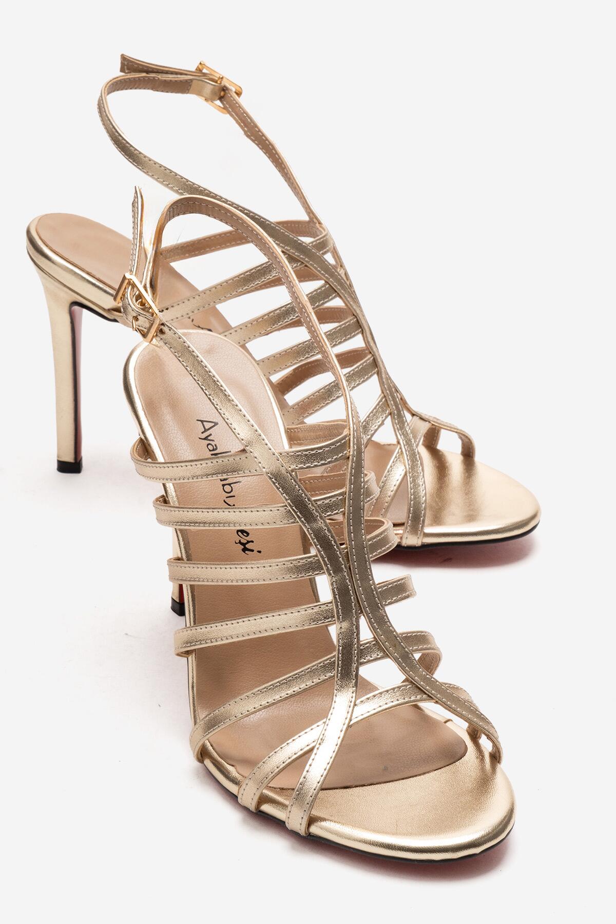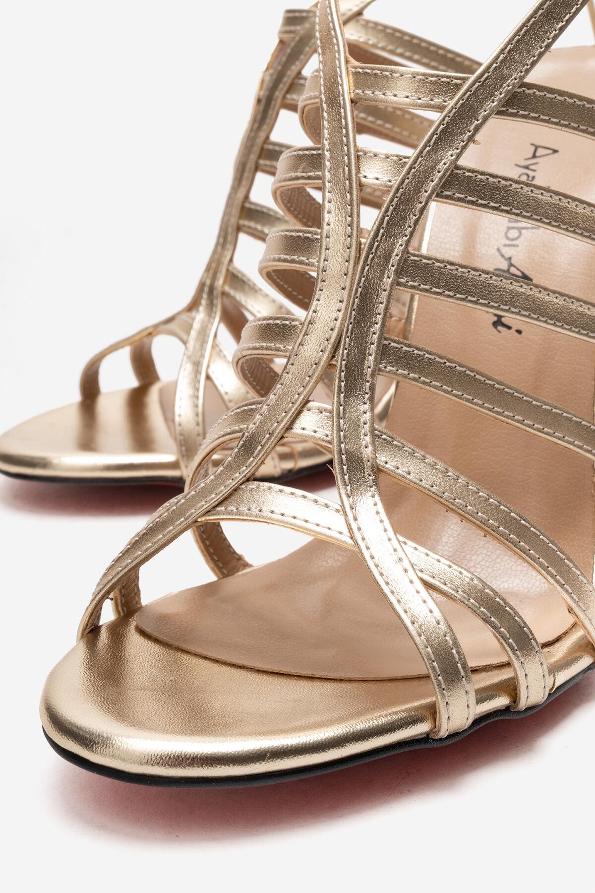 Kadın Açık Kafes Burun Tasarım İnce Topuklu Biyeli Ayakkabı Elo Altın Kırışık