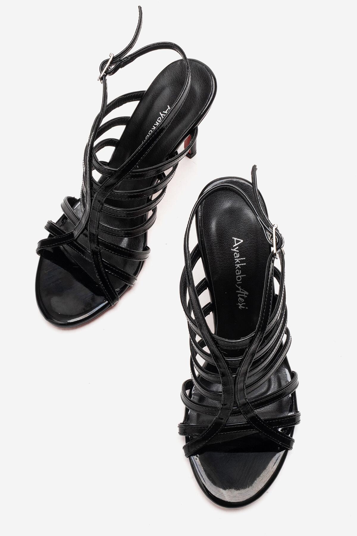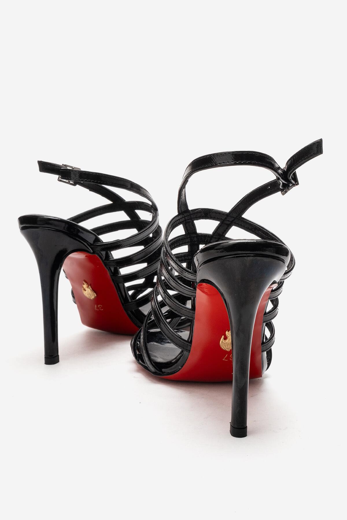 Kadın Açık Kafes Burun Tasarım İnce Topuklu Biyeli Ayakkabı Elo Siyah Rugan