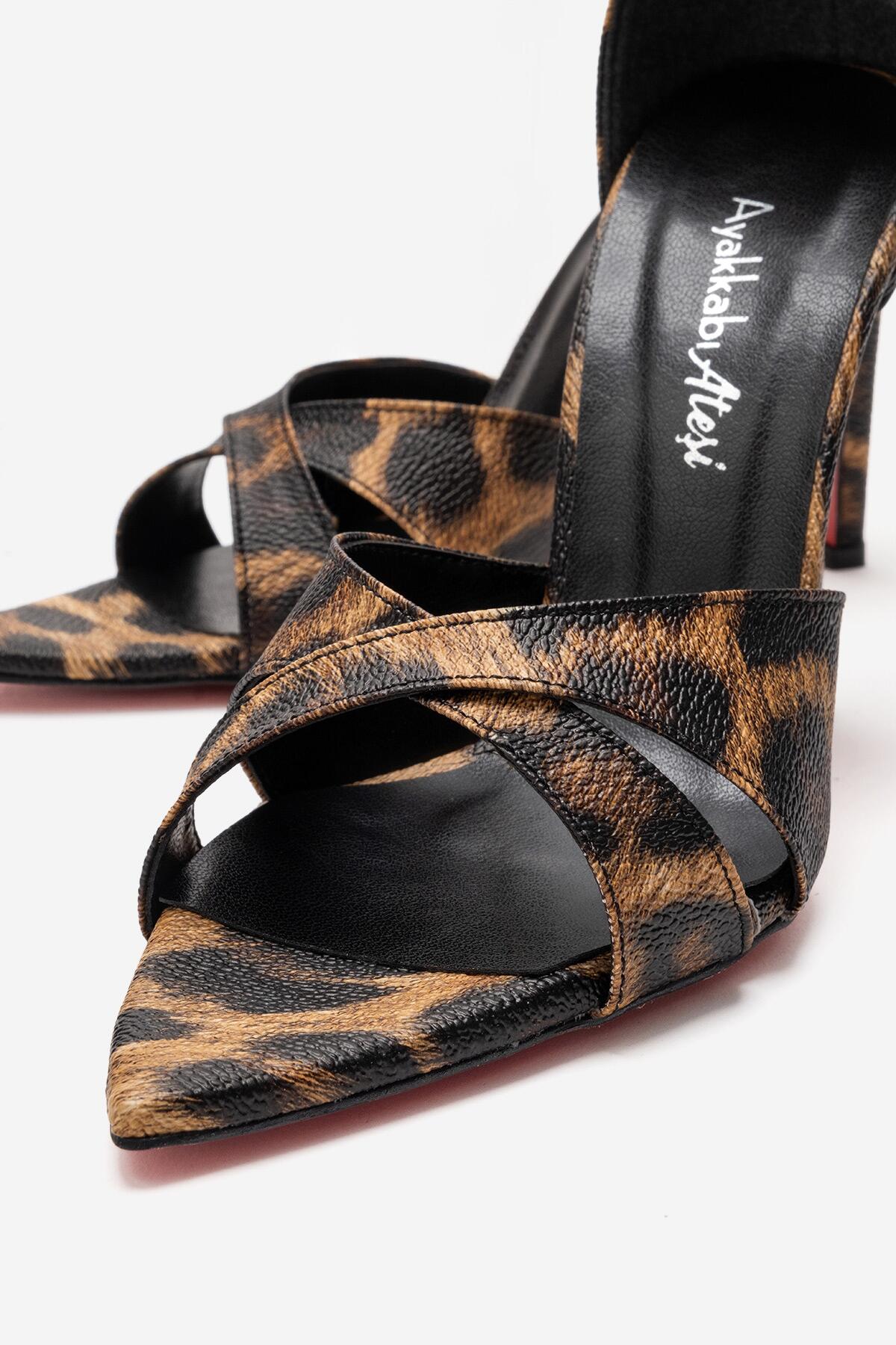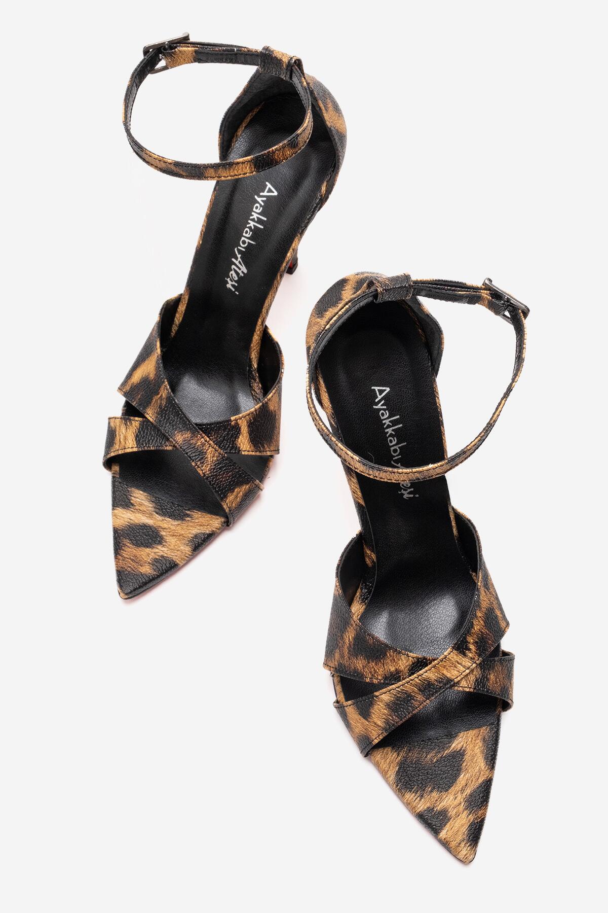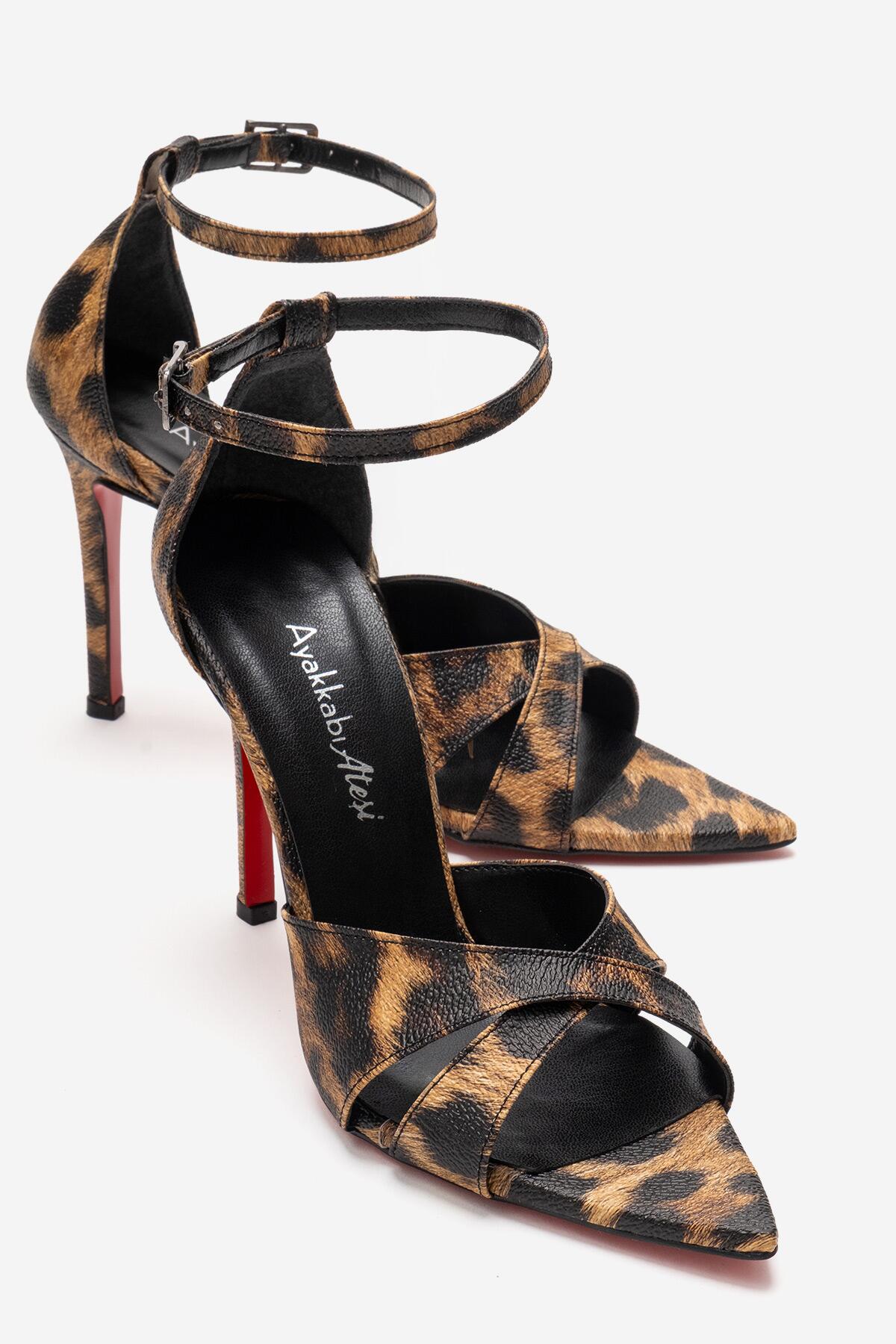 Kadın Çapraz Bantlı Bilekten Bağlamalı Stiletto Topuklu Ayakkabı Sorie Leopar
