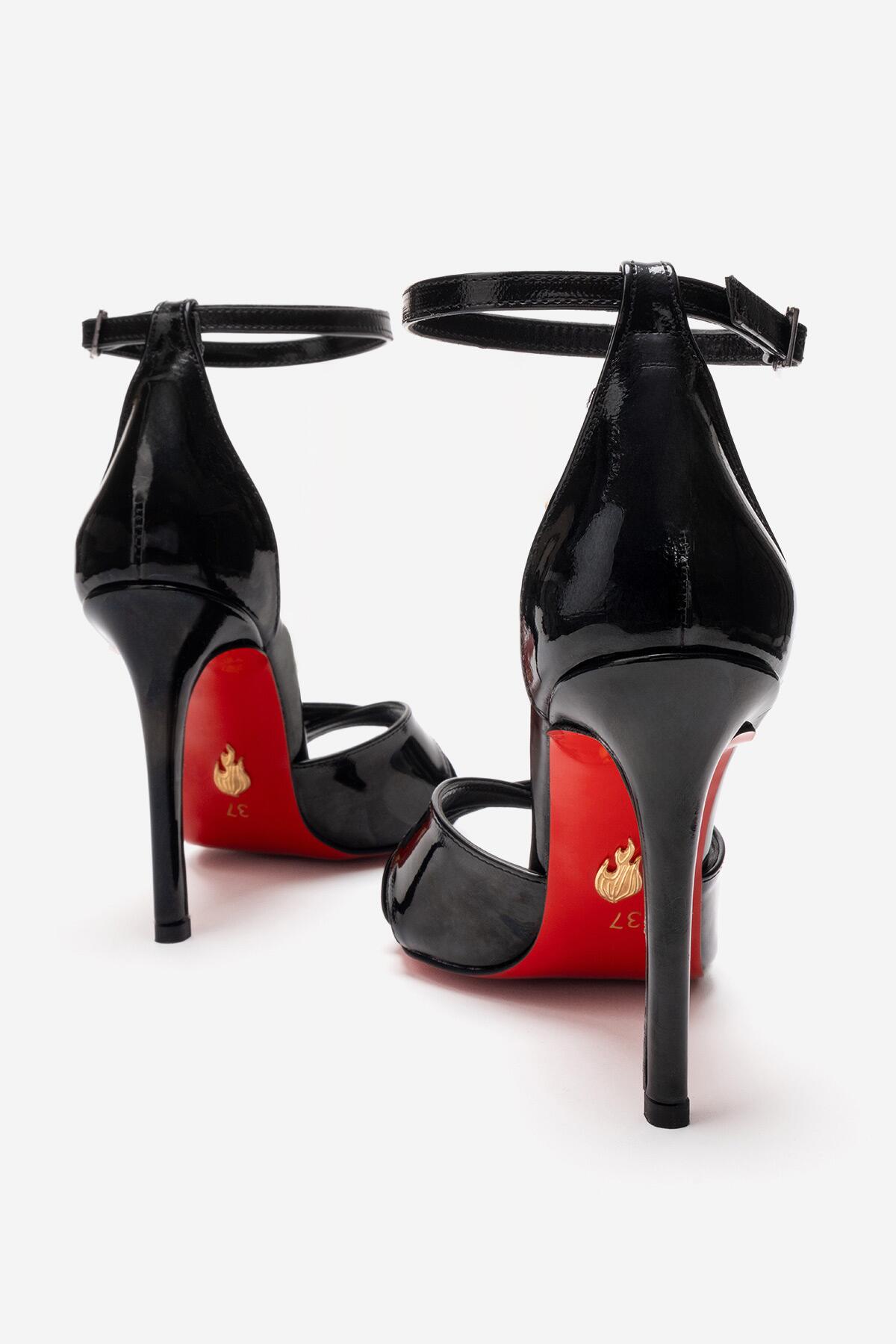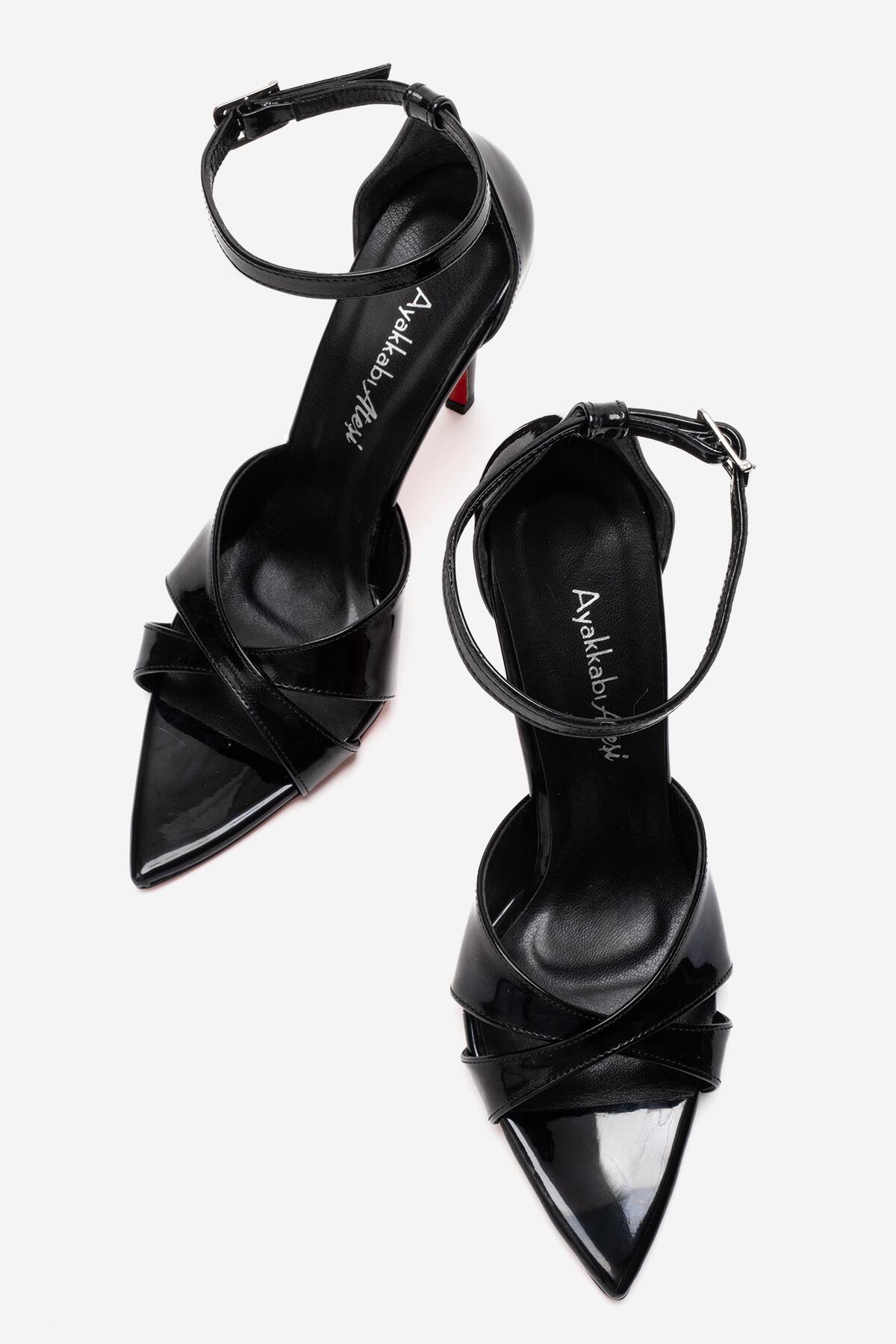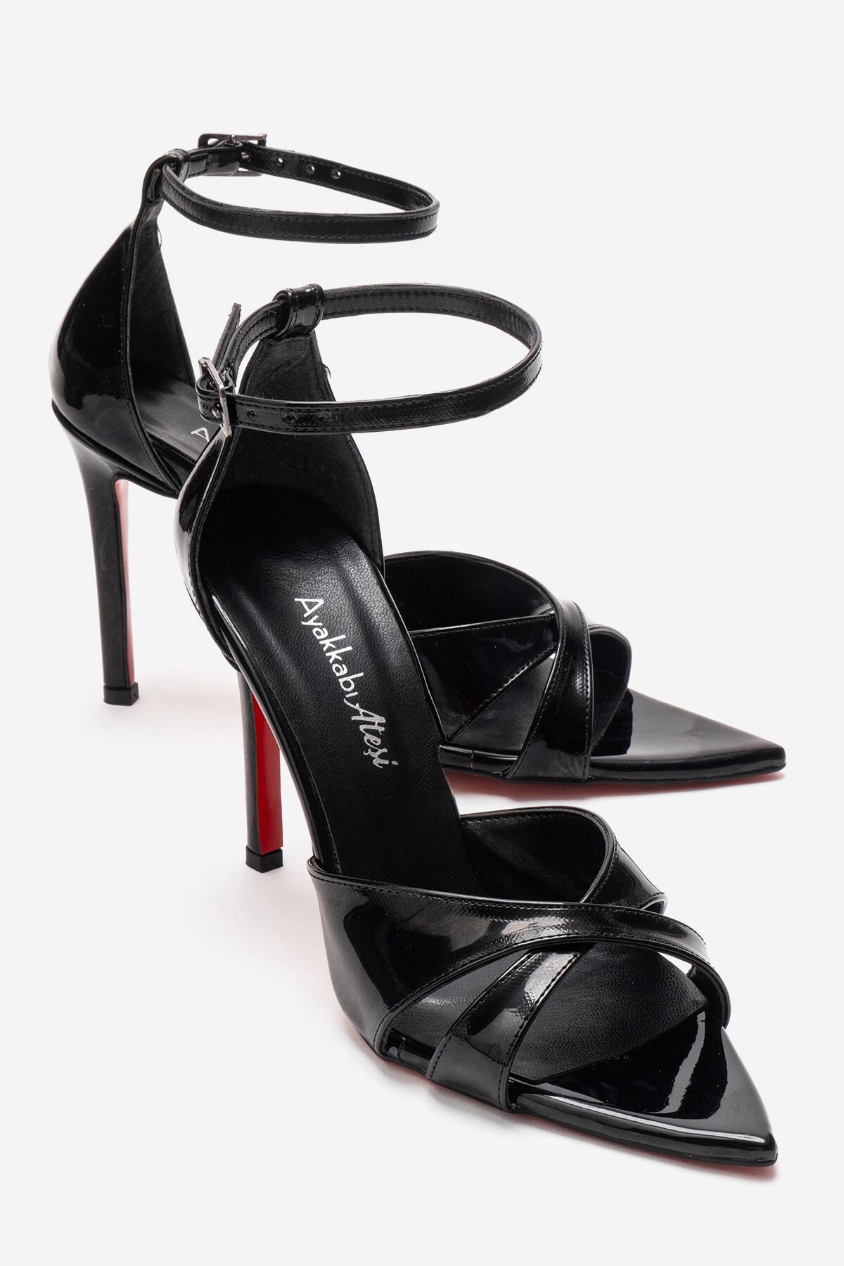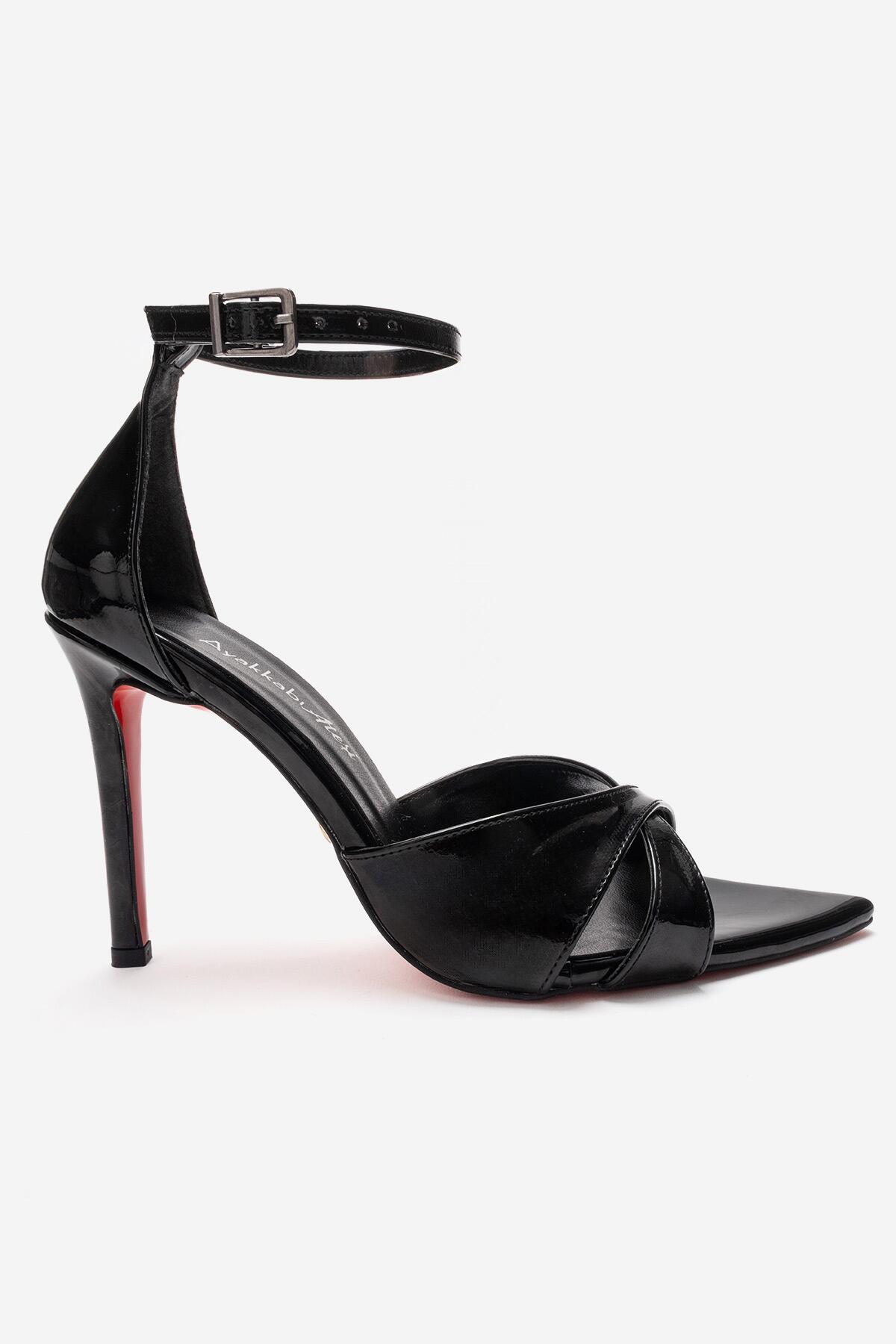 Kadın Çapraz Bantlı Bilekten Bağlamalı Stiletto Topuklu Ayakkabı Sorie Siyah Rugan