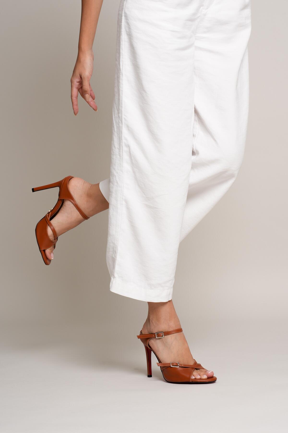 Kadın Çift Bantlı Tasarım Topuklu Ayakkabı Liona Taba Cilt