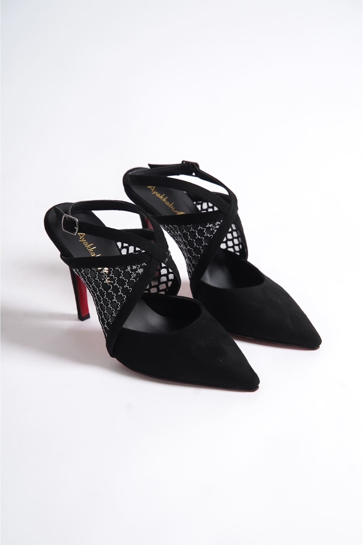 Kadın File Detaylı Özel Tasarım İnce Topuklu Ayakkabı Stiletto Harlow Siyah Süet