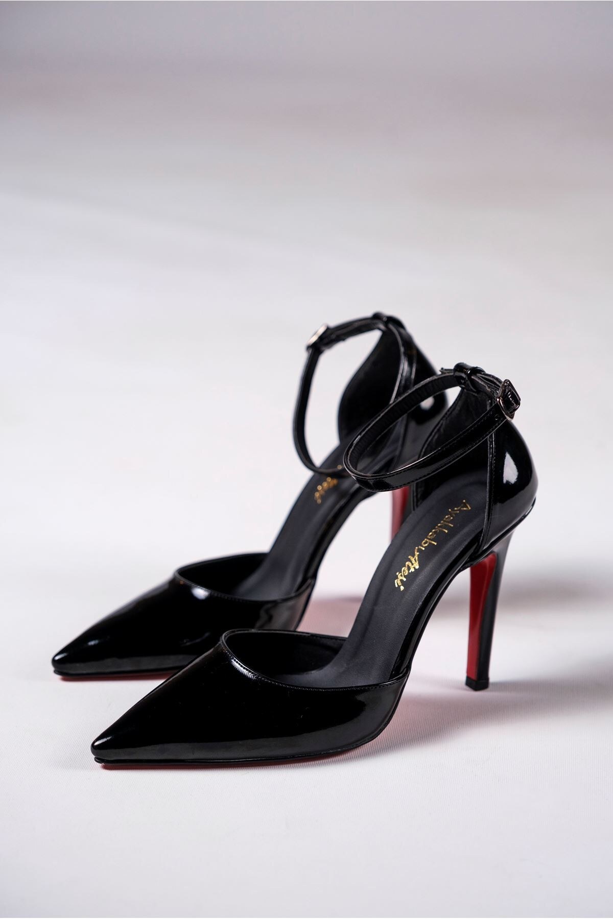 Kadın İnce Topuklu Baretli Tasarım Ayakkabı Stiletto Noppa Siyah Rugan