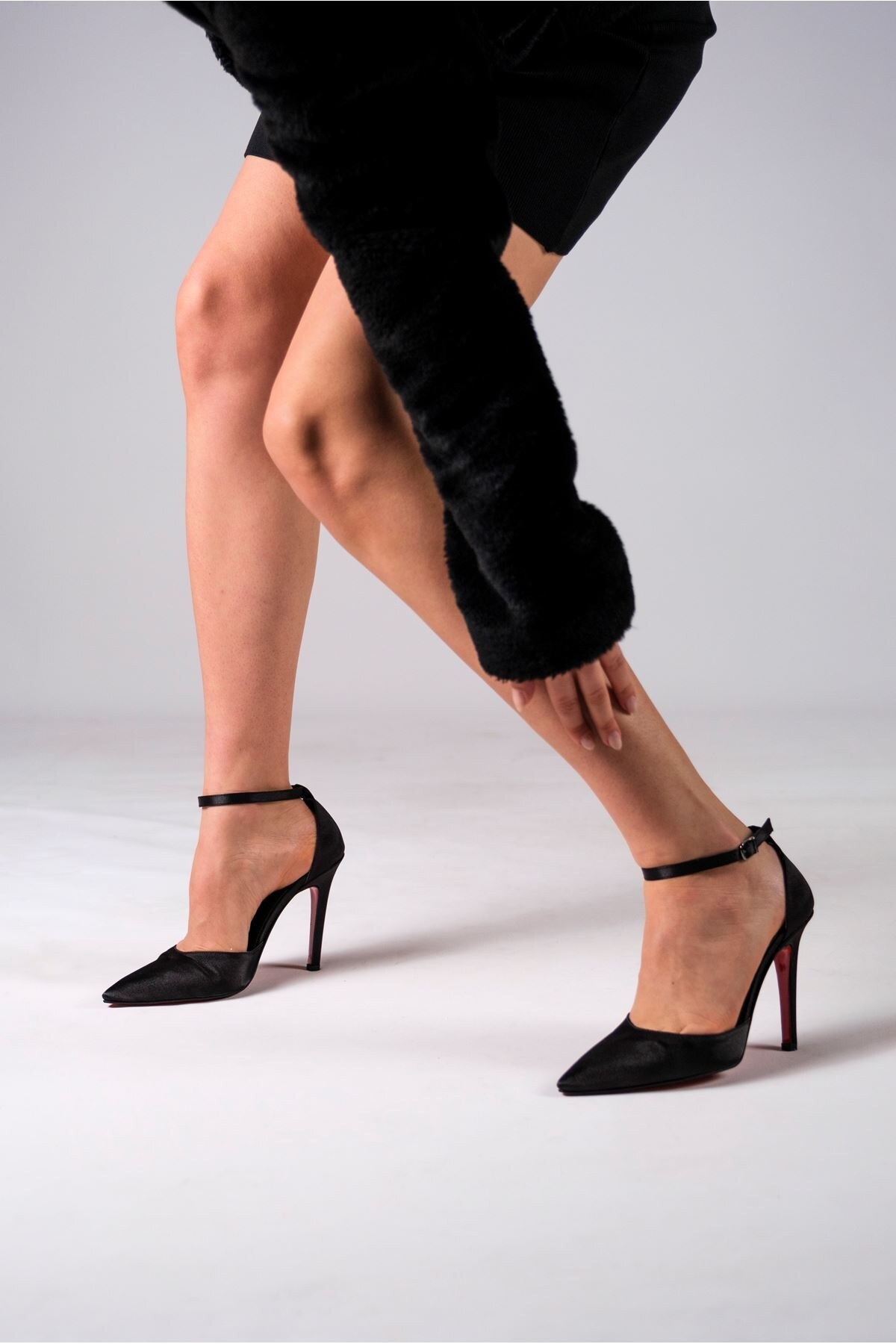 Kadın İnce Topuklu Baretli Tasarım Ayakkabı Stiletto Noppa Siyah Saten