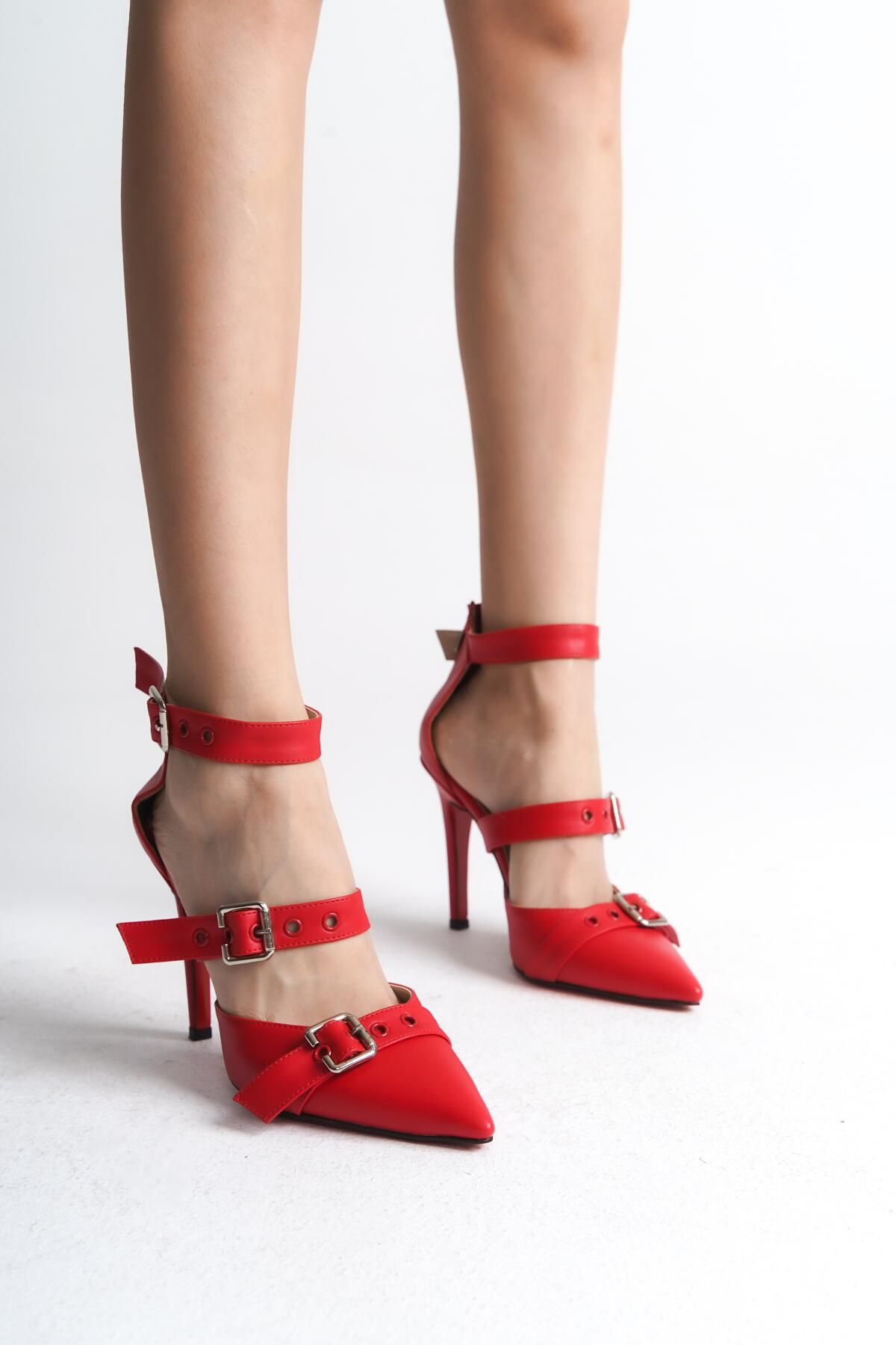 Kadın İnce Topuklu Tokalı Ayakkabı Stiletto Sansa Kırmızı Cilt