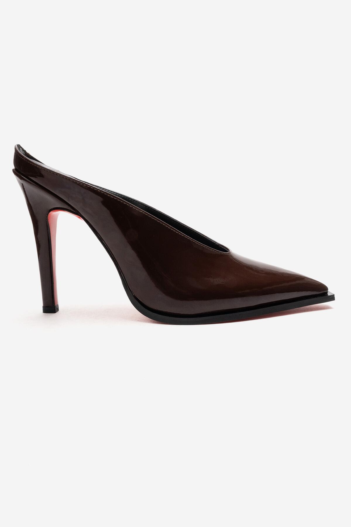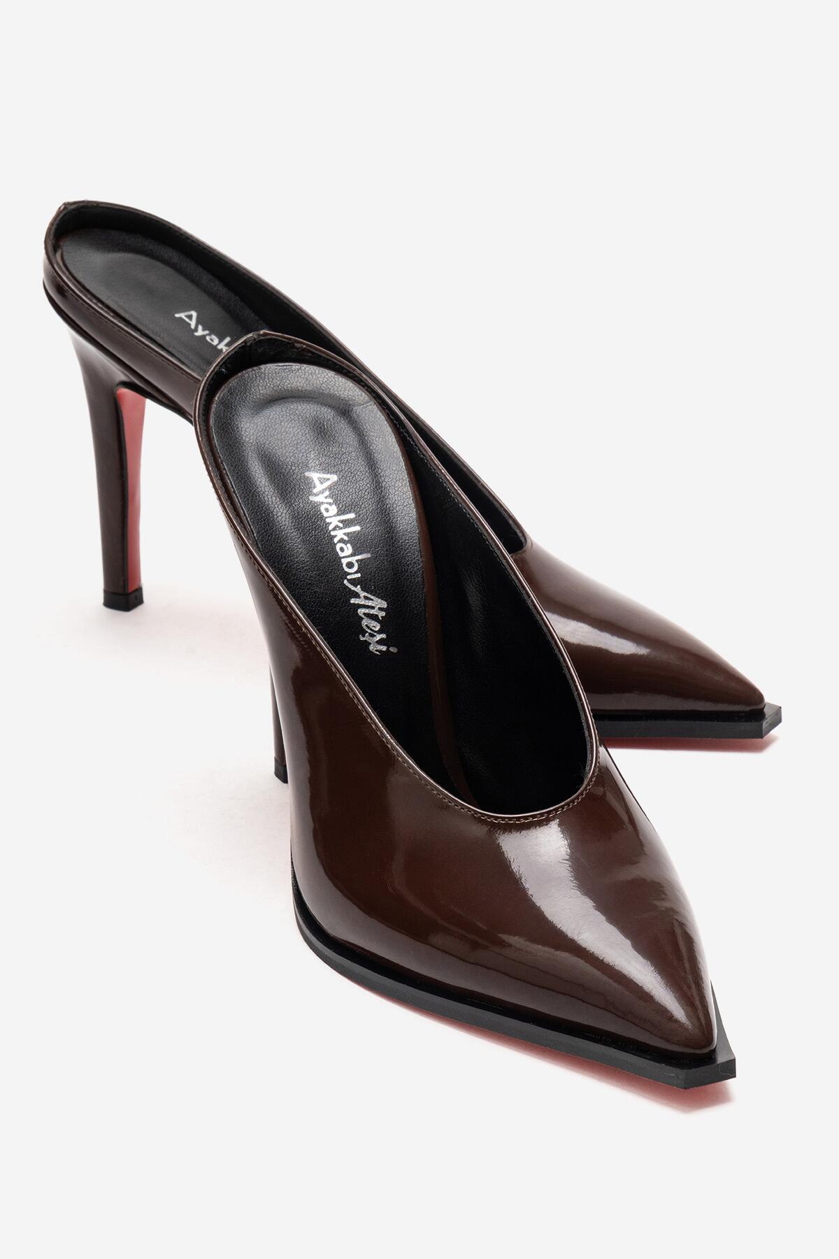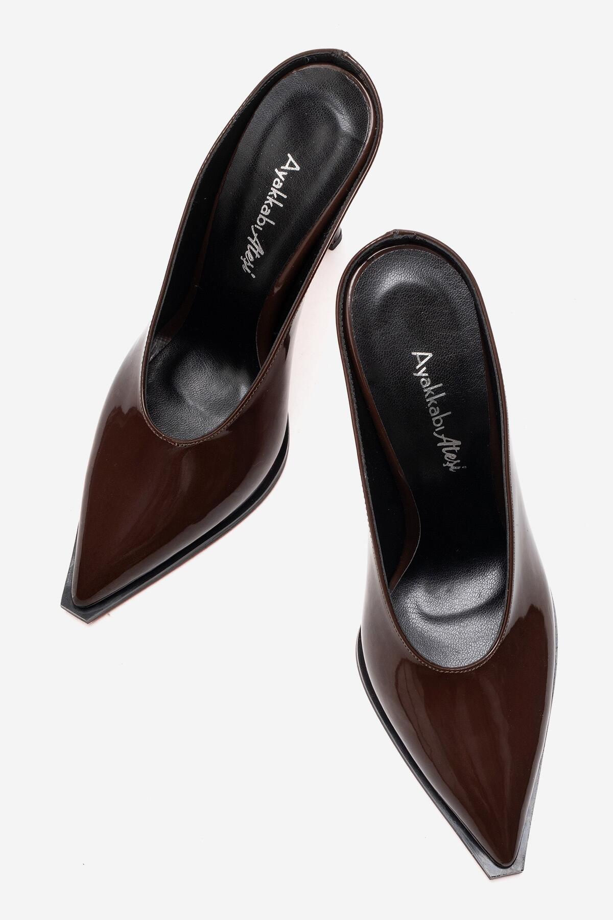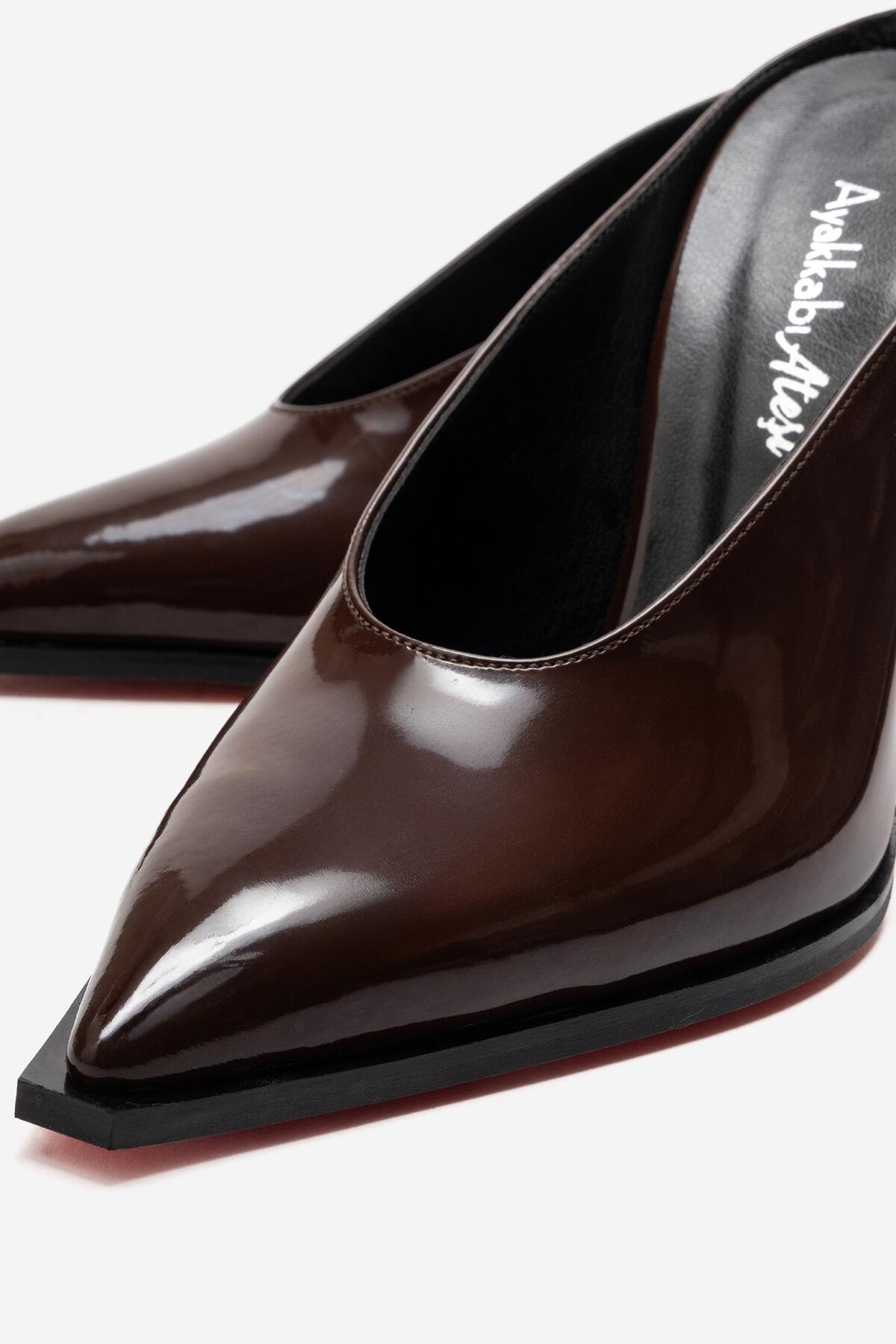 Kadın Özel Tasarım İnce Topuklu Terlik Kobe Kahverengi Rugan