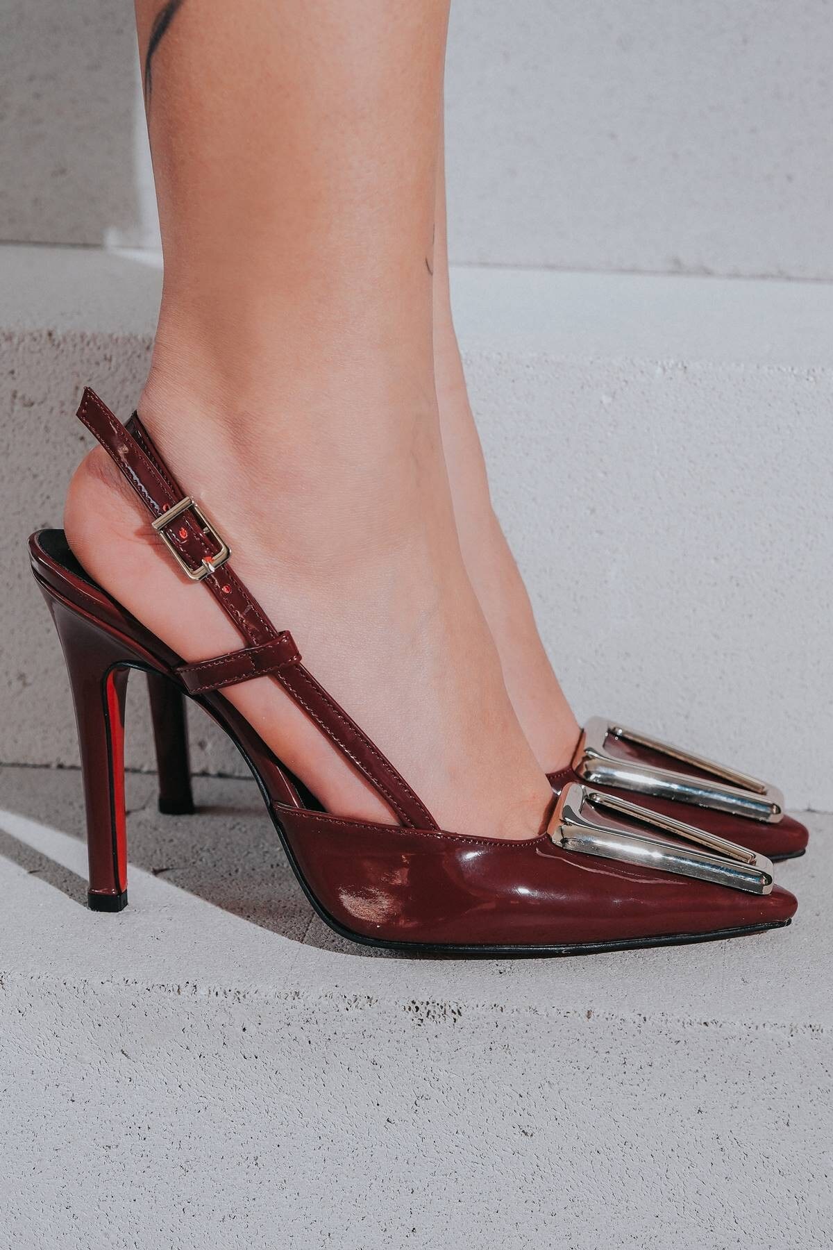 Kadın Özel Tokalı İnce Topuklu Ayakkabı Tina Bordo Cilt