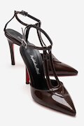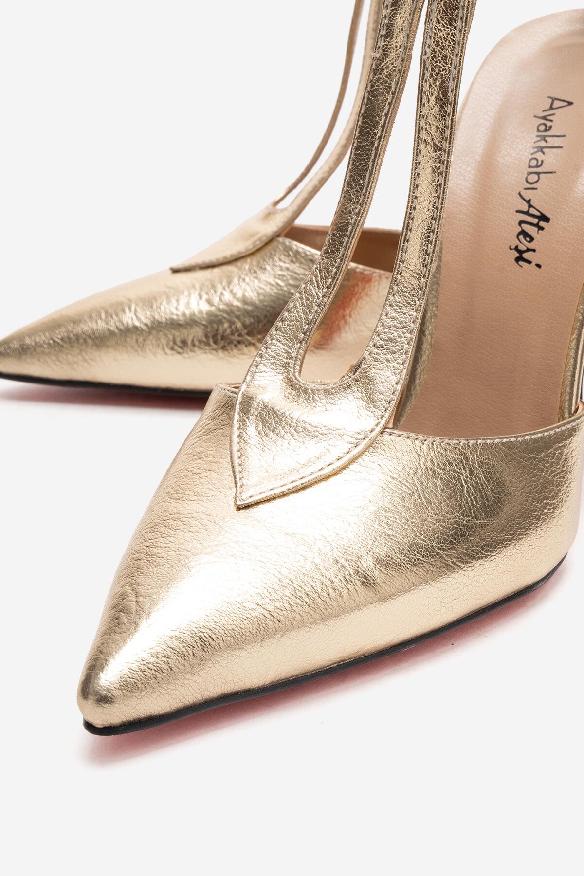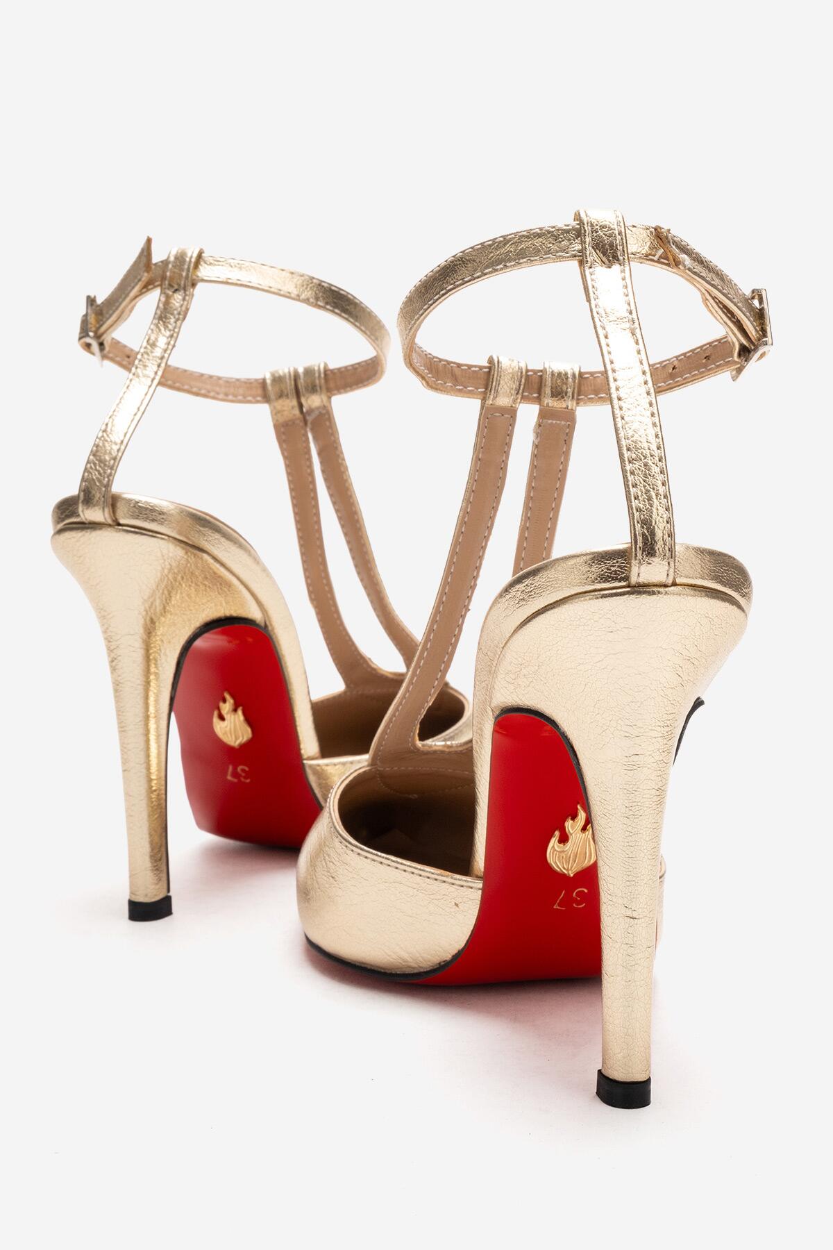 Kadın Sivri Burun T-bantlı Tasarım Topuklu Ayakkabı - Stiletto Stilo Altın Kırışık
